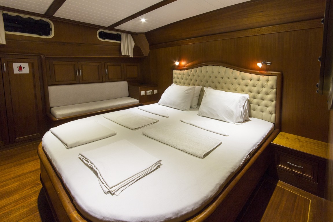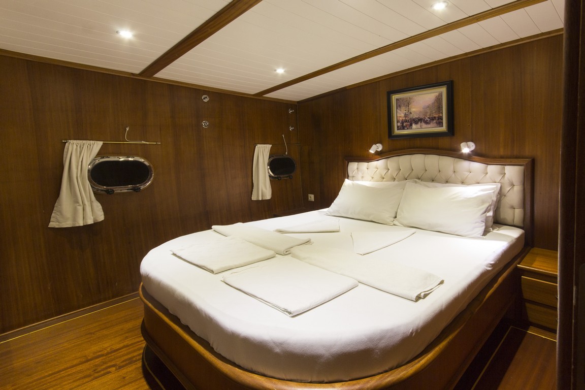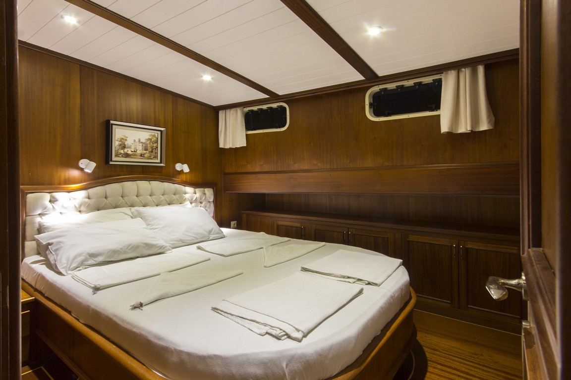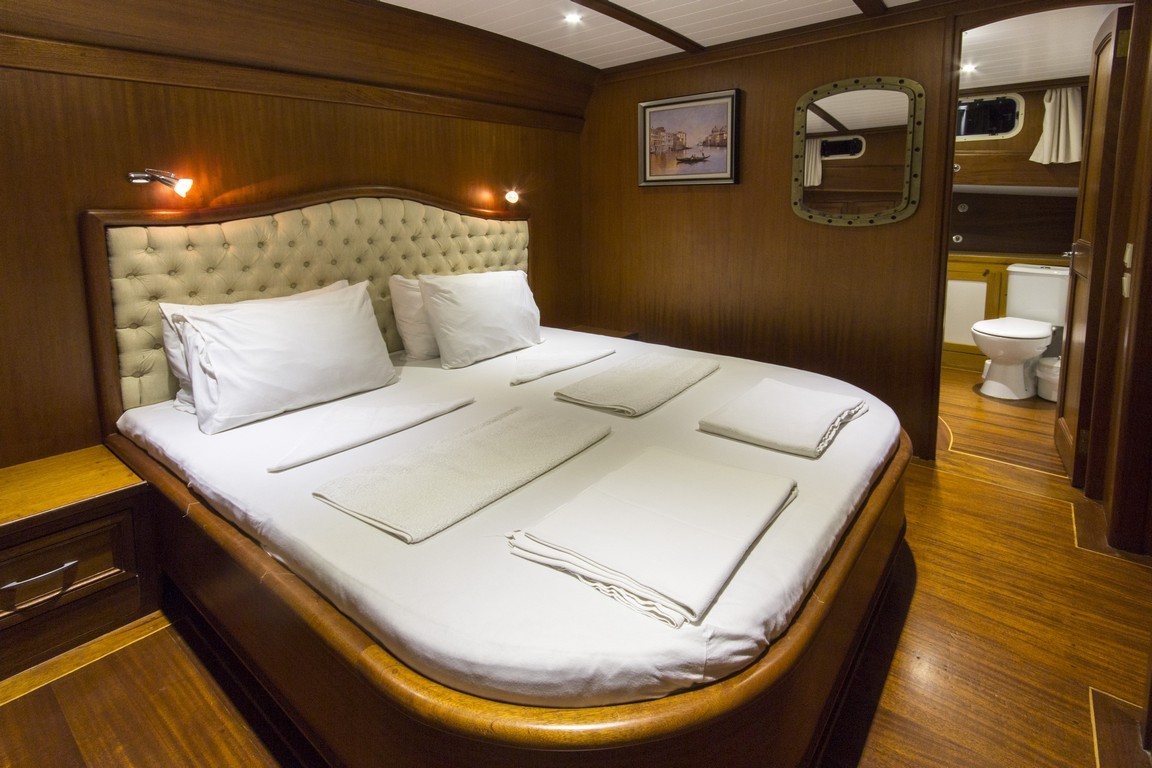 Unser Gulet mit 9 Kabinen hat 1 Master-, 6 Doppel- und 2 Zweibettkabinen, mit Klimaanlage, Toilette und Dusche in jeder Kabine, und bietet problemlos Platz für insgesamt 18 Gäste. Das große und komfortable Wohnzimmer ist mit Geräten wie Fernseher, Satellitenfernsehen und CD-Player ausgestattet, um Ihre Zeit außerhalb des Meeres noch angenehmer zu gestalten. Während Sie die in unserer voll ausgestatteten Küche zubereiteten Mahlzeiten genießen, können Sie auch jeden Blauton entdecken.