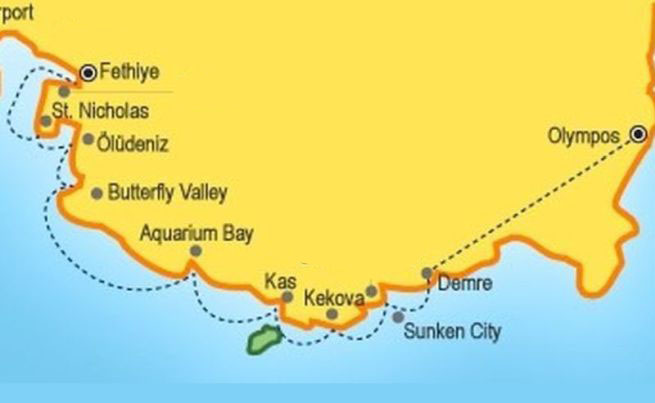 | ROUTE 15 Olympos - Fethiye | 3 Nächte / 4 Tage - Minikreuzfahrt | Abfahrt: | Dienstag | Mit A/C Gulet |