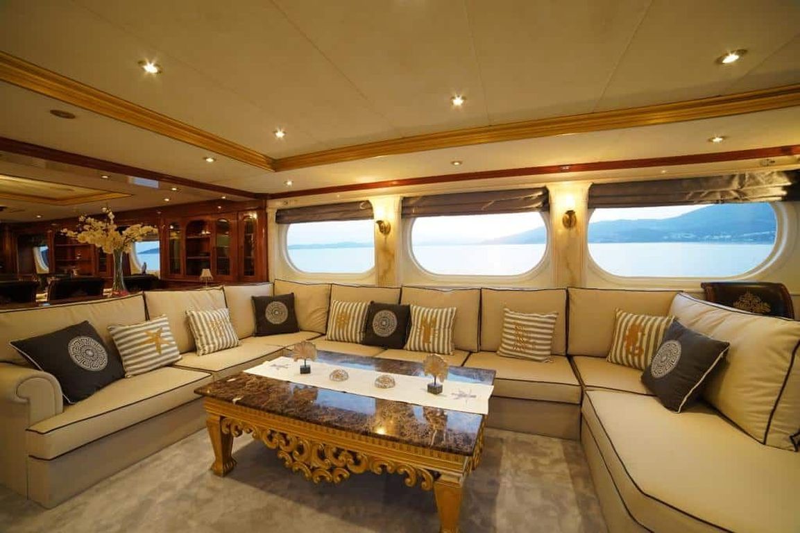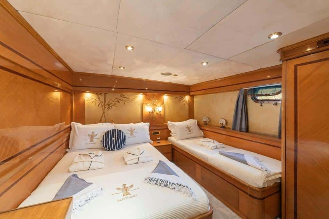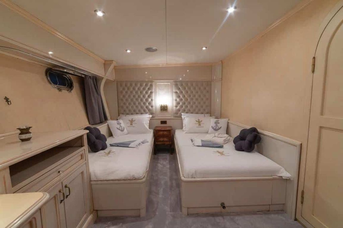 | Kapazität für bis zu 12 Gäste; 1 VIP-, 1 Master-, 1 Zweibett-, 2 Dreibettkabinen, Klimaanlage, Duschkabine und Heimtoiletten in allen Kabinen, separate Crew-Kabinen. |