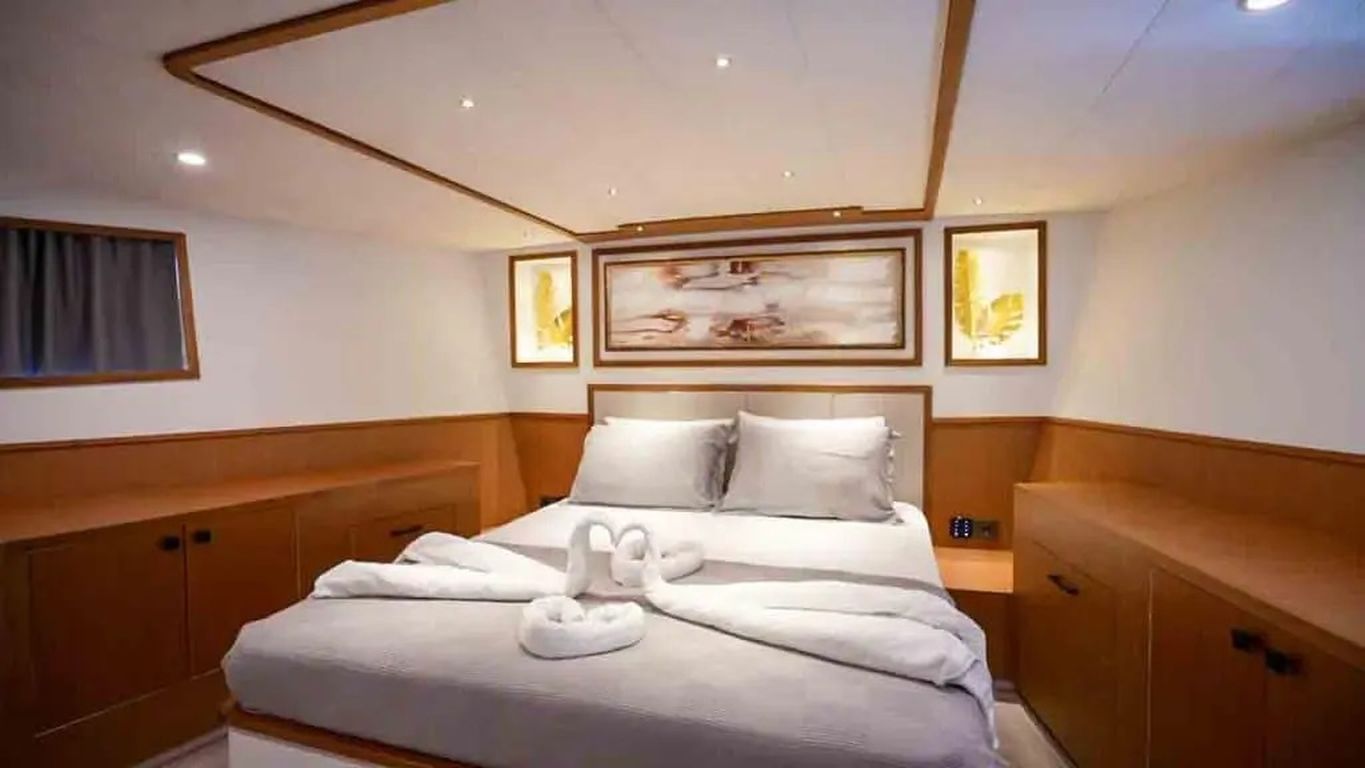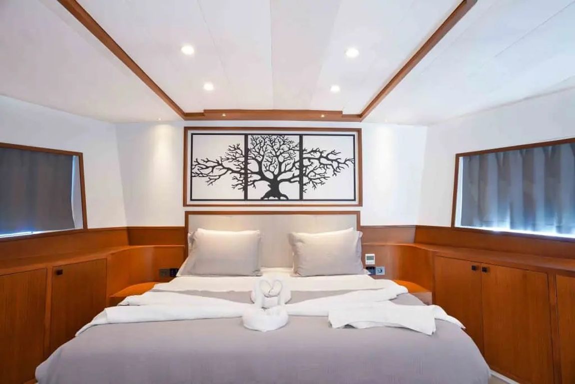 | Kapazität für bis zu 11 Gäste: 1 Master-, 3 VIP-Doppel-, 1 Dreibettkabine, Klimaanlage, Duschkabine und Haustoiletten in allen Kabinen, separate Crew-Kabinen. |