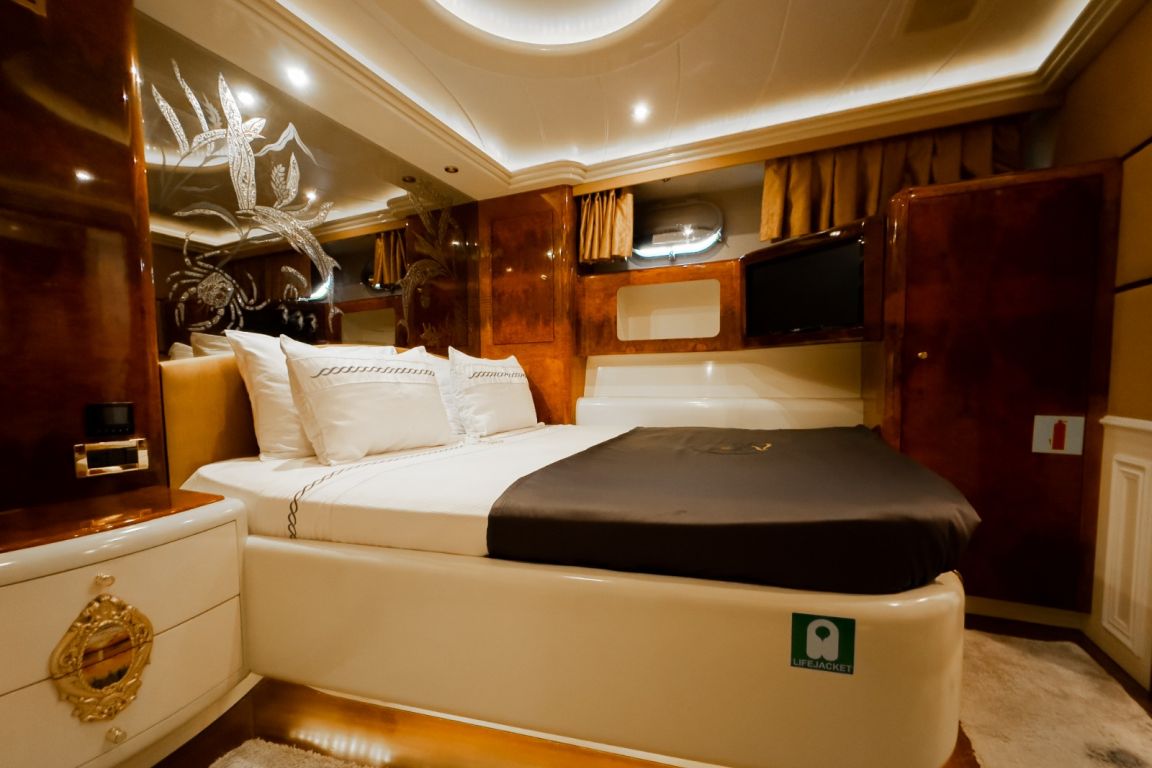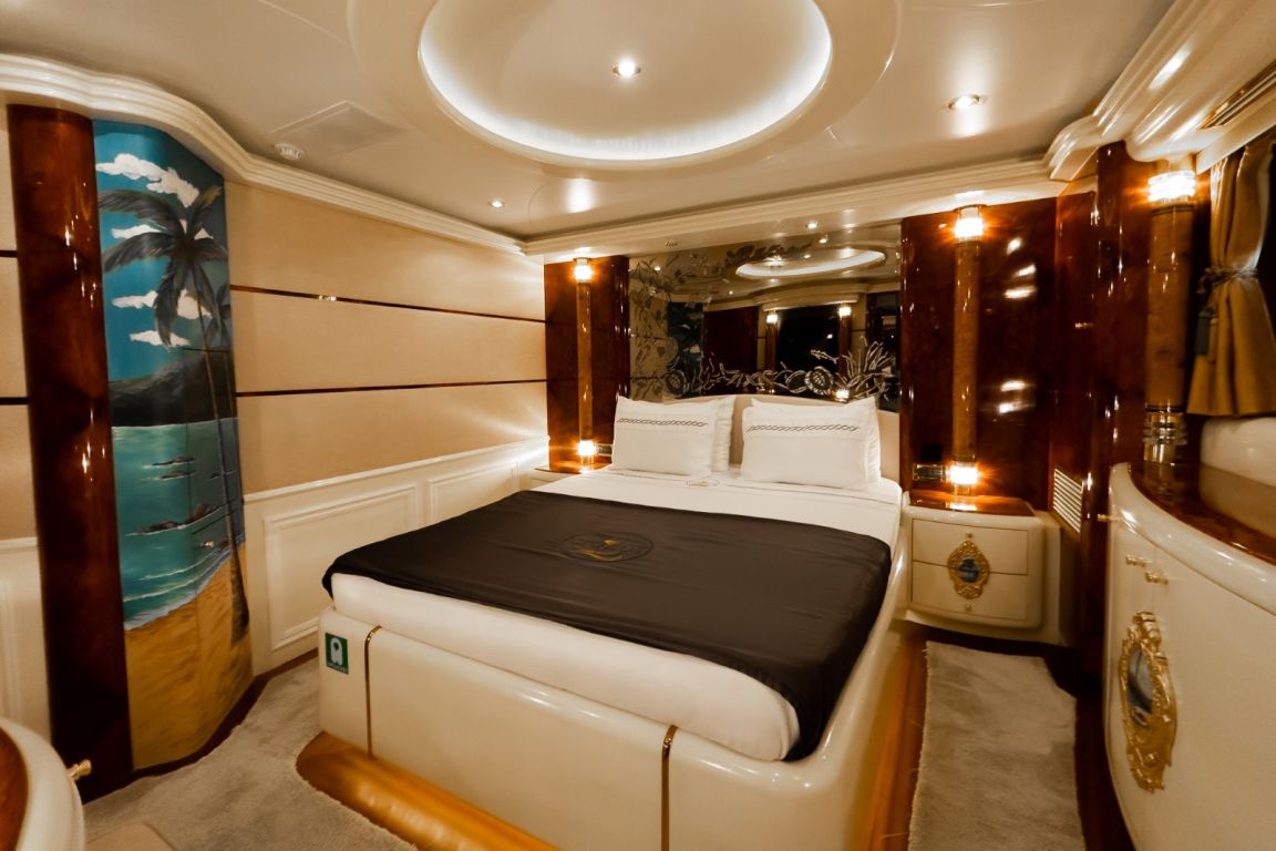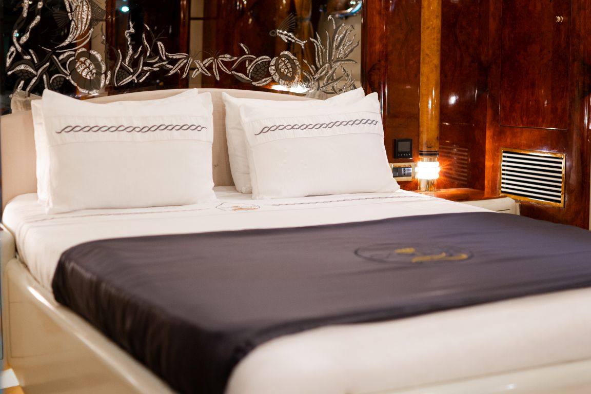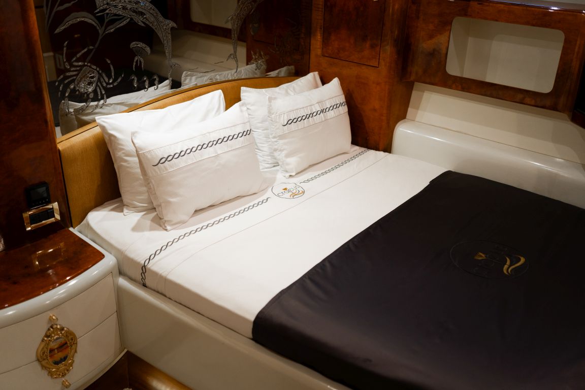 Bis zu 12 Gäste; 1 VIP-Kabine, 1 Master-Kabine, 3 Doppelkabinen, 1 Zweibettkabine. Master-Kabine: Die geräumige Master-Kabine befindet sich auf dem Unterdeck und verfügt über ein Kingsize-Bett, Apple TV, Internetzugang und WLAN, einen Schreibtisch/Schminktisch und ein Heimkino-Soundsystem. Zur Ausstattung gehören außerdem RGB-Ambientebeleuchtung, Klimaanlage, Whirlpool, WC und eine separate Duschkabine. VIP-Kabine: Die VIP-Kabine befindet sich auf dem Hauptdeck und bietet ein Kingsize-Bett, Apple TV, Internetzugang und WLAN, einen Schreibtisch/Schminktisch und ein Heimkino-Soundsystem. Gäste genießen hier RGB-Ambientebeleuchtung, Klimaanlage, Whirlpool, WC und eine private Duschkabine. Doppelkabinen (3): Drei komfortable Doppelkabinen befinden sich auf dem Unterdeck. Jede Kabine verfügt über ein Queensize-Bett, Apple TV, Internetzugang und WLAN, WC, Duschkabine oder Badewanne und Klimaanlage. Zweibettkabine: Die Zweibettkabine auf dem Unterdeck bietet zwei Einzelbetten, Apple TV, Internetzugang und WLAN, WC, Duschkabine und Klimaanlage. |