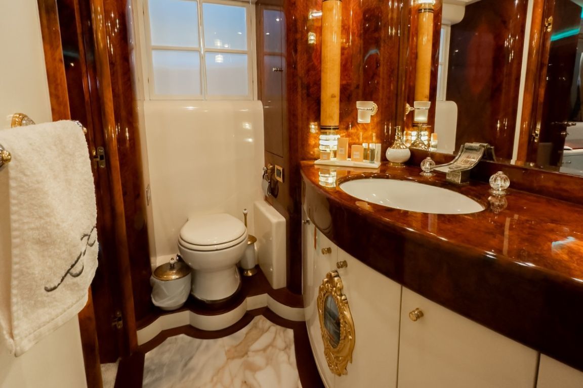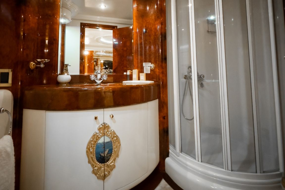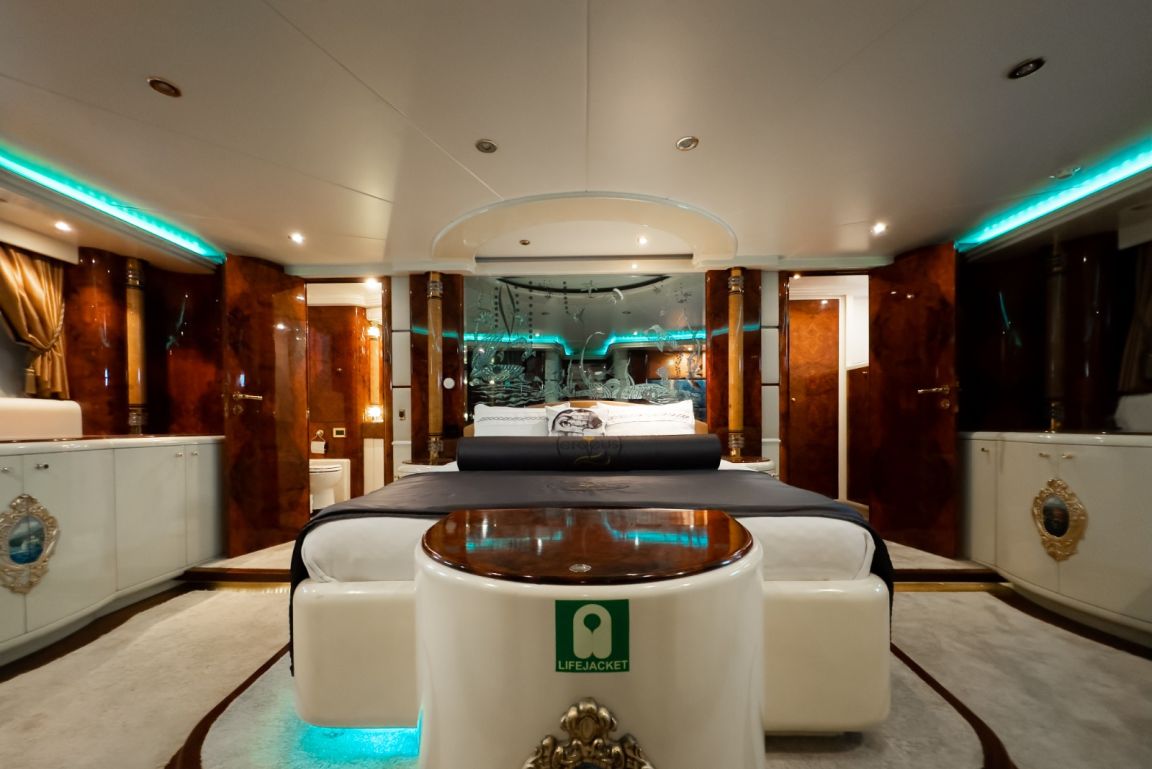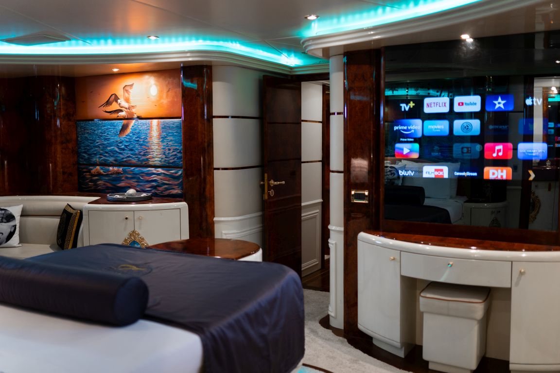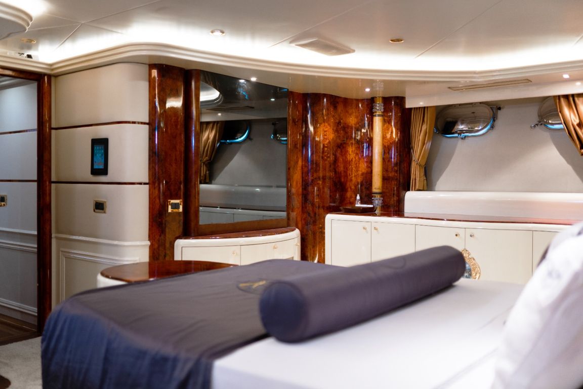 Bis zu 12 Gäste; 1 VIP-Kabine, 1 Master-Kabine, 3 Doppelkabinen, 1 Zweibettkabine. Master-Kabine: Die geräumige Master-Kabine befindet sich auf dem Unterdeck und verfügt über ein Kingsize-Bett, Apple TV, Internetzugang und WLAN, einen Schreibtisch/Schminktisch und ein Heimkino-Soundsystem. Zur Ausstattung gehören außerdem RGB-Ambientebeleuchtung, Klimaanlage, Whirlpool, WC und eine separate Duschkabine. VIP-Kabine: Die VIP-Kabine befindet sich auf dem Hauptdeck und bietet ein Kingsize-Bett, Apple TV, Internetzugang und WLAN, einen Schreibtisch/Schminktisch und ein Heimkino-Soundsystem. Gäste genießen hier RGB-Ambientebeleuchtung, Klimaanlage, Whirlpool, WC und eine private Duschkabine. Doppelkabinen (3): Drei komfortable Doppelkabinen befinden sich auf dem Unterdeck. Jede Kabine verfügt über ein Queensize-Bett, Apple TV, Internetzugang und WLAN, WC, Duschkabine oder Badewanne und Klimaanlage. Zweibettkabine: Die Zweibettkabine auf dem Unterdeck bietet zwei Einzelbetten, Apple TV, Internetzugang und WLAN, WC, Duschkabine und Klimaanlage. |