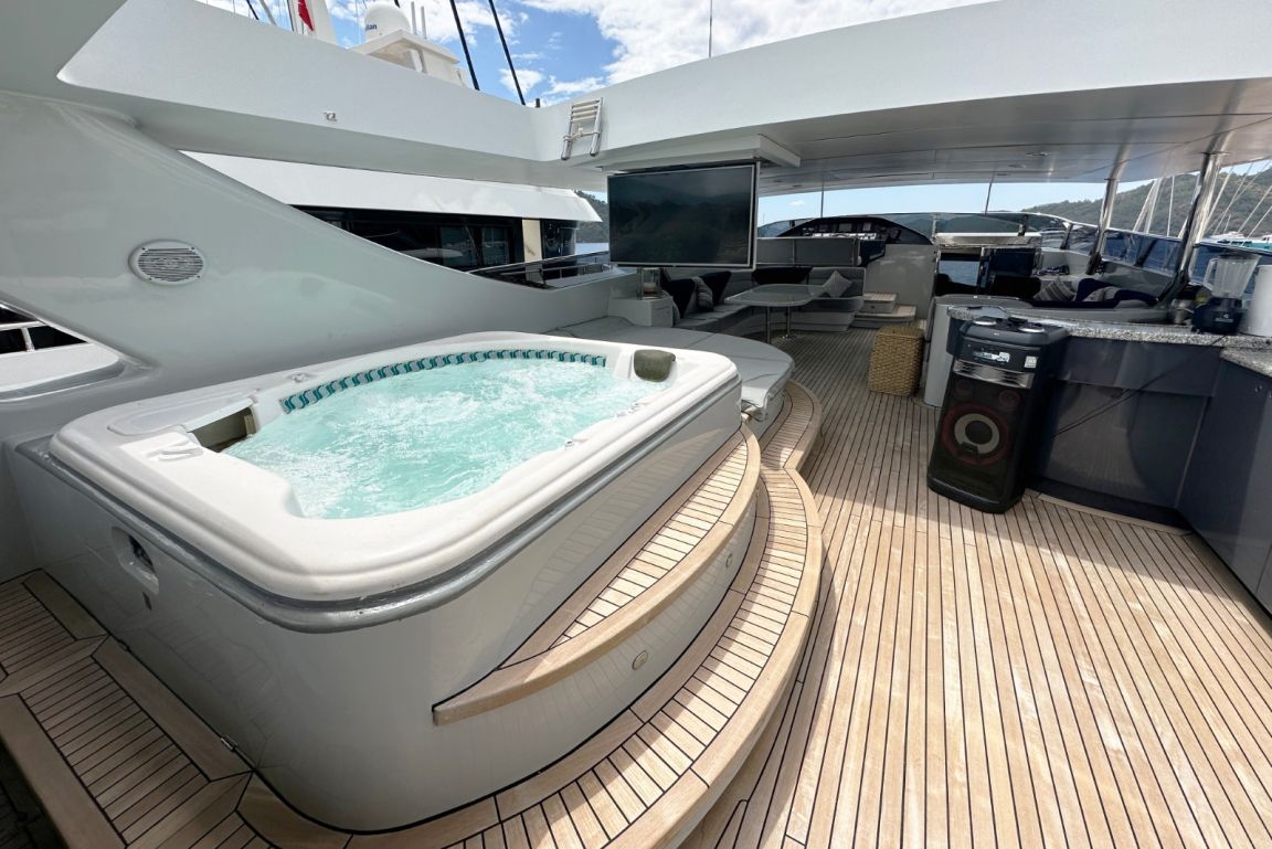 | BORDBEREICHE; Salon (Hauptdeck): Der elegante Hauptsalon bietet bequeme Ledersofas mit integrierter Kühlung, einen Esstisch, Klimaanlage und RGB-Ambientebeleuchtung. Zur Unterhaltung stehen Fernseher, Apple TV, Internetzugang, ein Heimkino-Soundsystem und zwei um 360° drehbare Fernseher zur Verfügung. Ein automatisches Vorhangsystem sorgt für maximalen Komfort und Privatsphäre. Flybridge: Die geräumige Flybridge bietet eine große Sonnenliegefläche, einen Grillplatz, Fernseher, Apple TV, Internetzugang und WLAN. Gäste können hier entspannen, den weiten Meerblick genießen, Musik über das Bord-Soundsystem hören und abends die RGB-Ambientebeleuchtung bewundern. BEHÄLTER & WASSERSPIELZEUG: Beiboot: Zodiac Medline 6.00 – 115 PS, Wasserski, Wakeboard, Ringo (Schlauchboot), Stand-Up-Paddle-Board, Angelausrüstung, Kanus, Bananenboot |