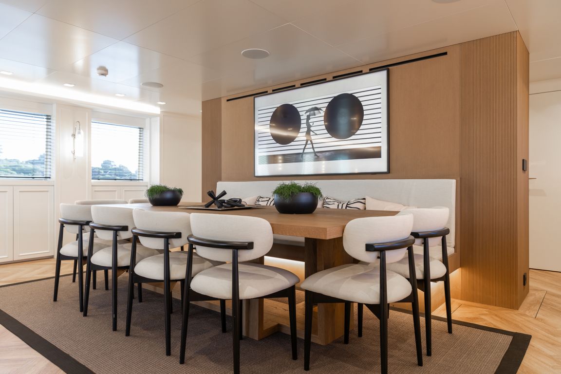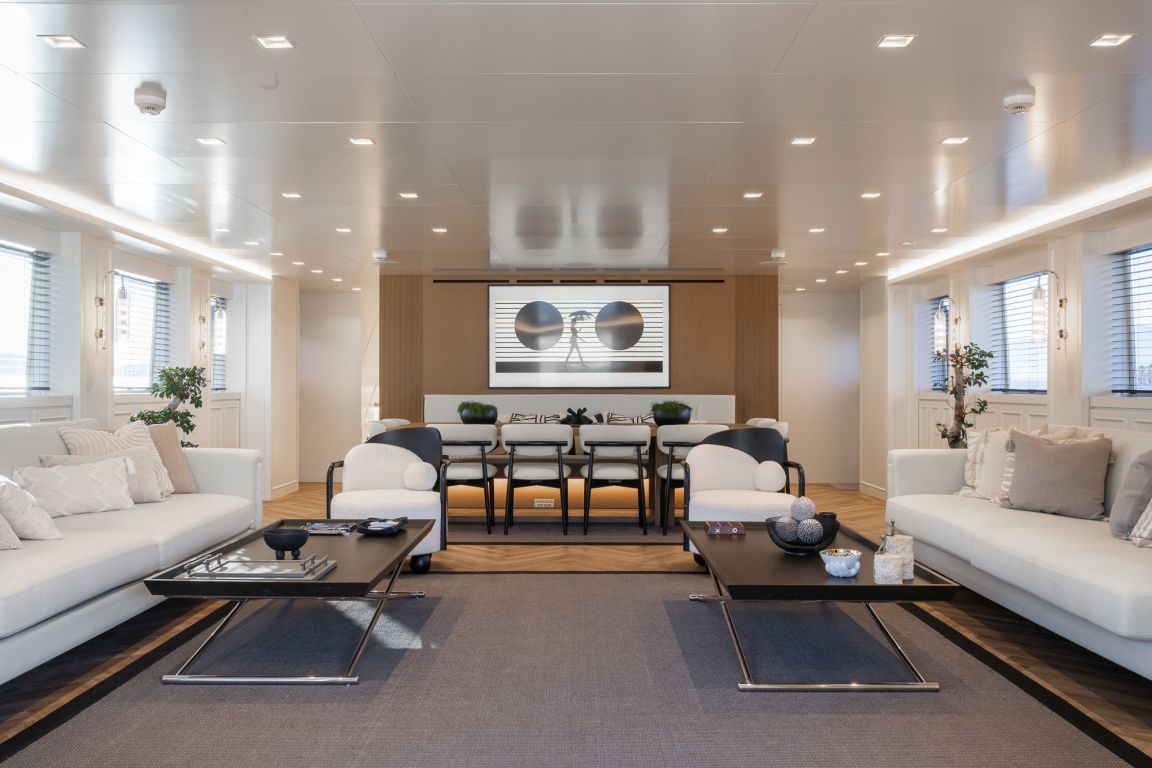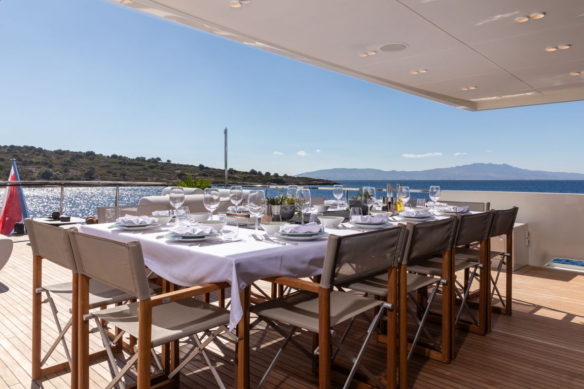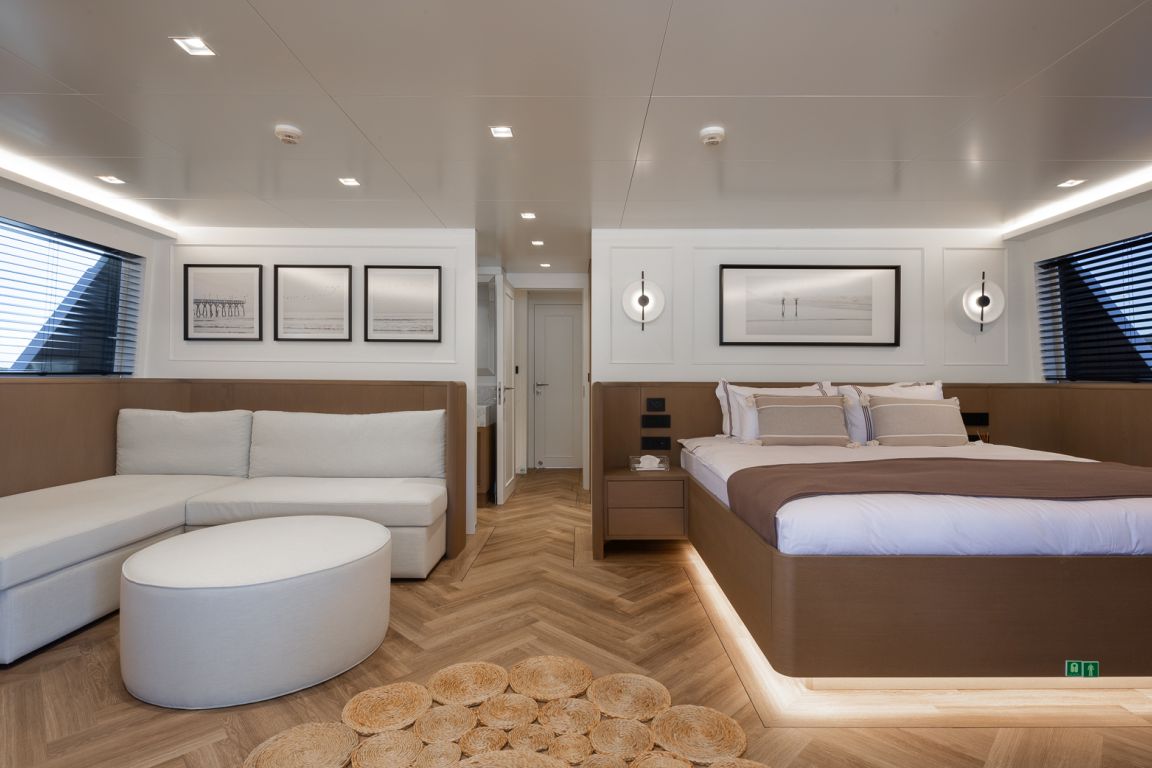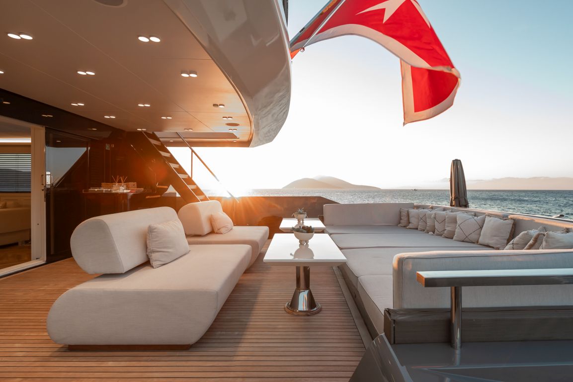 Der Innenraum der Illusion II besticht durch einen eleganten Salon mit modernem Dekor, komfortablen Sitzgruppen und einer hellen, offenen Atmosphäre – perfekt zum Entspannen und geselligen Beisammensein. Auch die Außenbereiche der Yacht sind beeindruckend: Große Decks laden zum Verweilen und Genießen ein. Das Achterdeck bietet einen geräumigen Essbereich, während die Flybridge mit Panoramablick, Liegeflächen und einem Whirlpool den perfekten Rahmen zum Entspannen unter der mediterranen Sonne bietet.