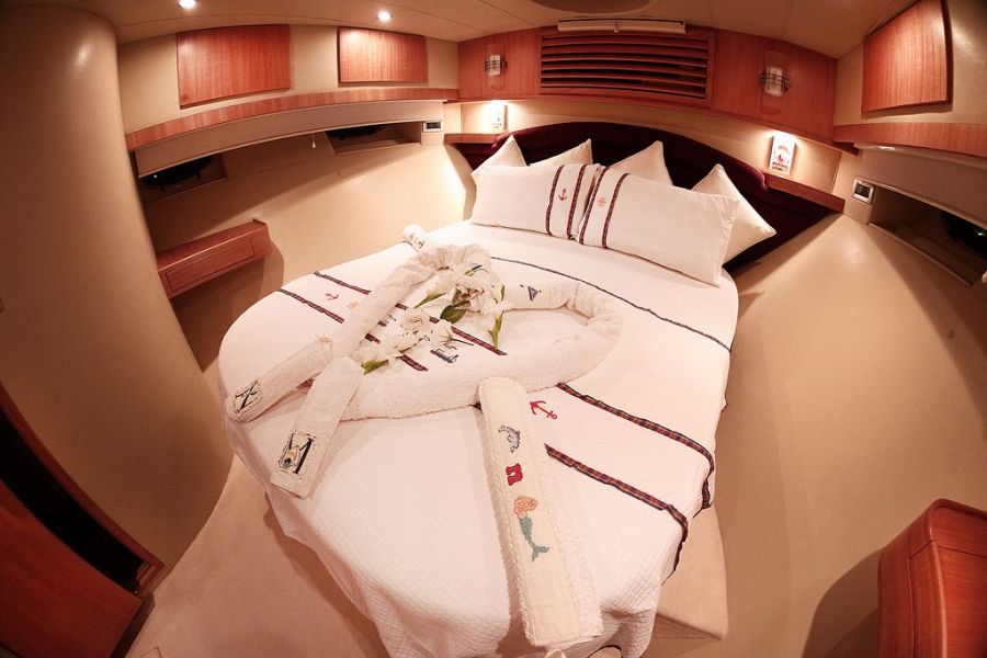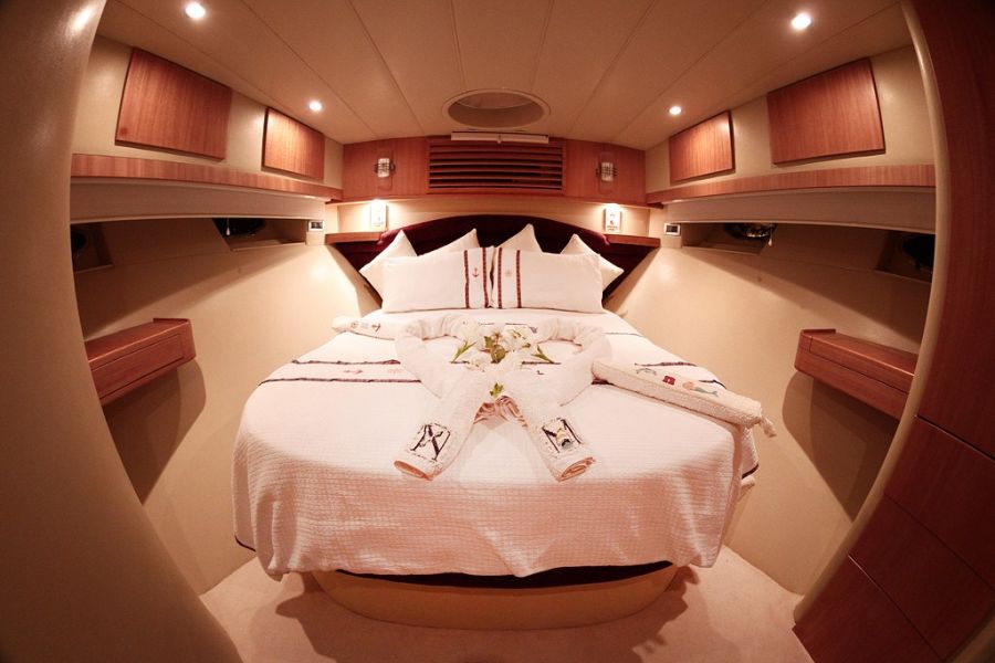 | 6 Gäste; 3 Kabinen; 1 E-Kabine + 2 Standardkabinen, Das komplette Boot ist aus Teeholz gefertigt. Jede Kabine verfügt über eine individuelle 18.000 BTU Klimaanlage, die unter dem Bett für die Nutzung von Kälte und Wärme aufbewahrt wird. |