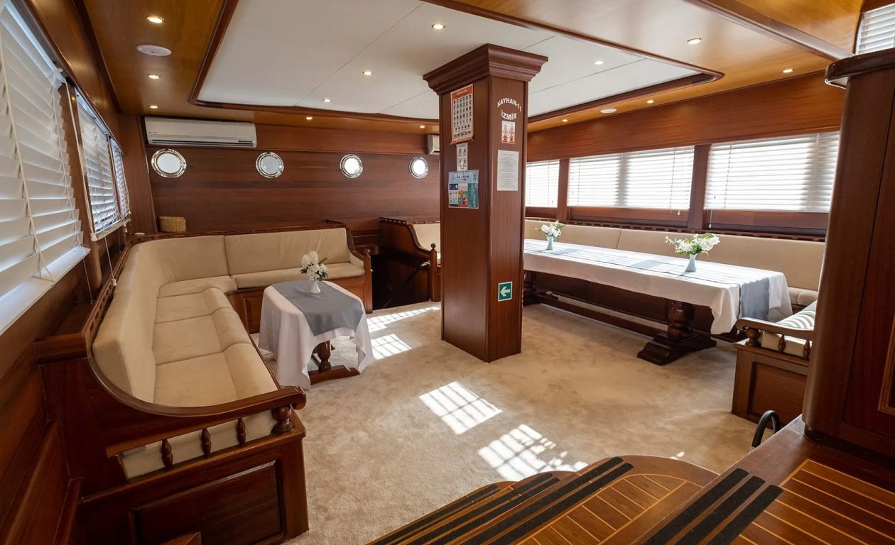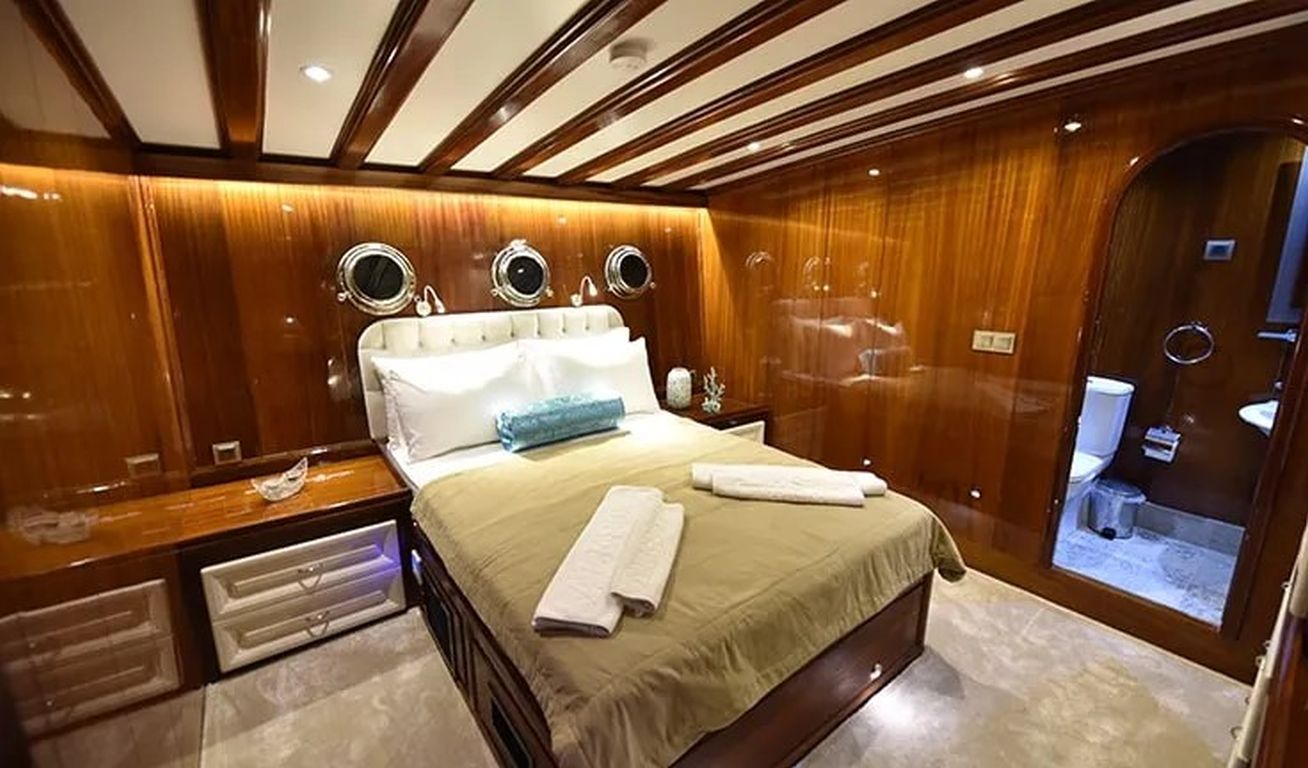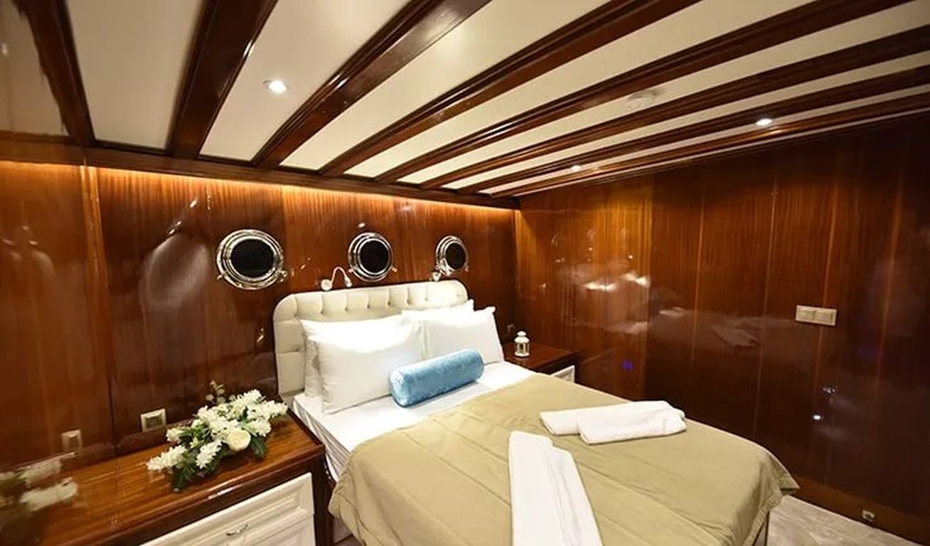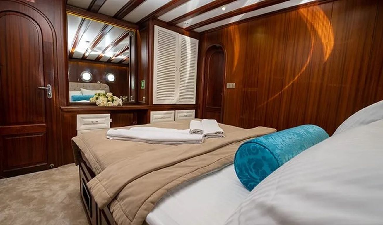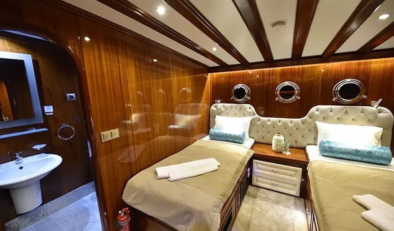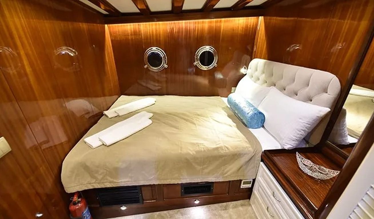| Die Gulet Kayhan 11 ist eine 34 Meter lange Ketch, gebaut 2002 und 2017 umfassend renoviert. Sie verfügt über 10 Kabinen – sechs Doppel- und vier Zweibettkabinen – mit einer Gesamtkapazität von 20 Gästen. Jede Kabine ist mit Klimaanlage, Bad und Dusche ausgestattet. Die Klimaanlage ist acht Stunden täglich verfügbar (erweiterbar gegen Aufpreis). Das Deck ist großzügig gestaltet, mit schattigen Essbereichen, gepolsterten Sitzgelegenheiten und großen Sonnenflächen. Der Salon verfügt über einen Esstisch, eine Bar und gemütliche Sitzbereiche. Zu den Wassersportarten gehören Kanu und Wasserski, weitere Aktivitäten wie Wakeboard, Ringo oder SUP sind gegen Aufpreis erhältlich. Schnorchel- und Angelausrüstung stehen ebenfalls zur Verfügung. Angetrieben von zwei 450 PS Iveco-Motoren und zwei 45 kW Onan-Generatoren, erreicht sie eine Geschwindigkeit von 11 Knoten. Die Kayhan 11 ist eine hervorragende Wahl für große Gruppen, die eine elegante und serviceorientierte Blaue Reise suchen. |