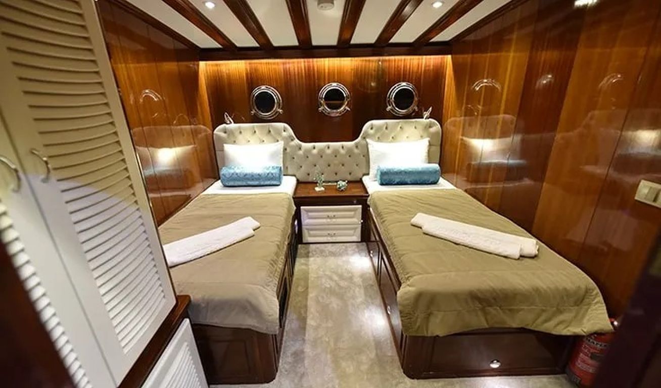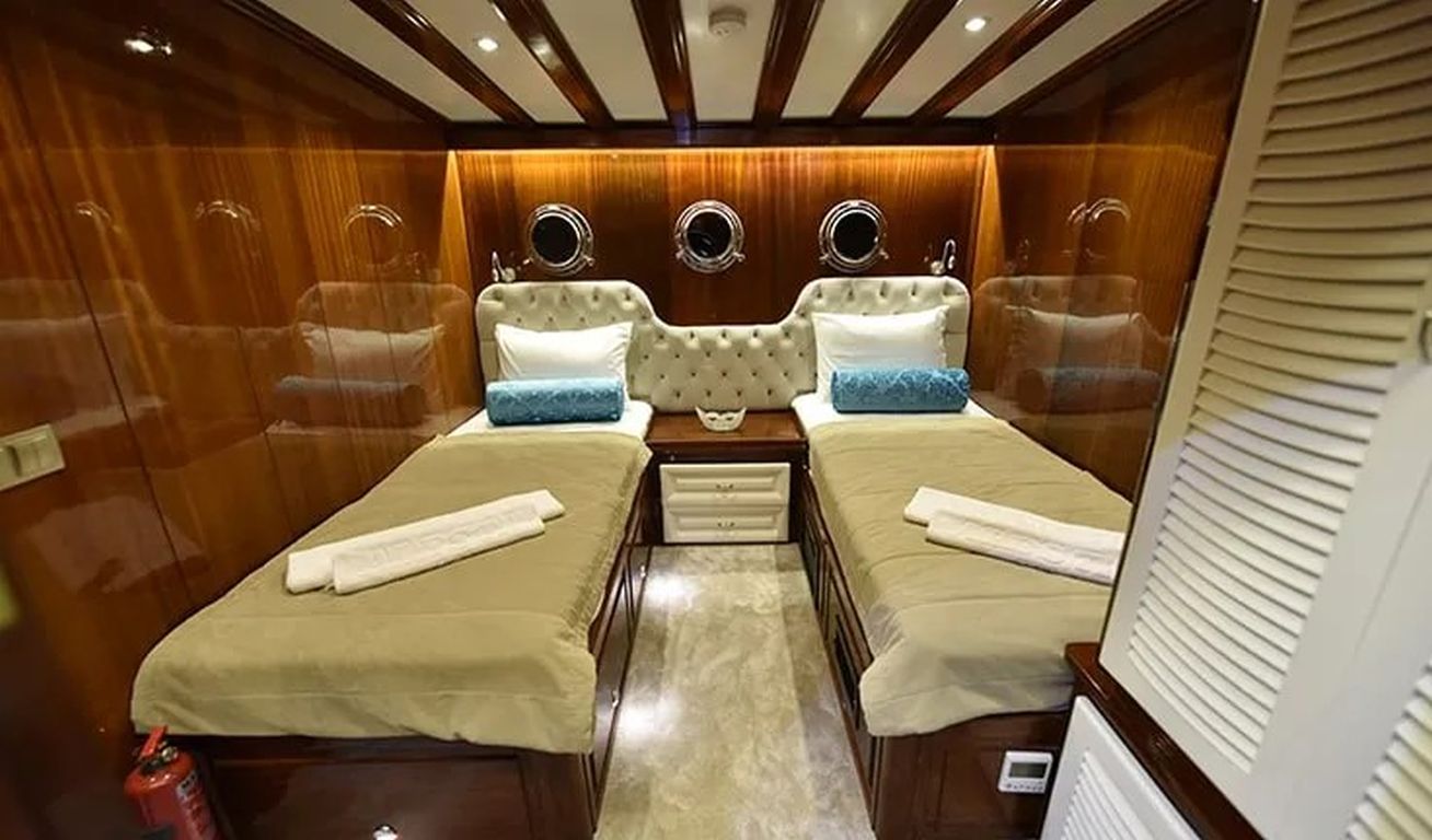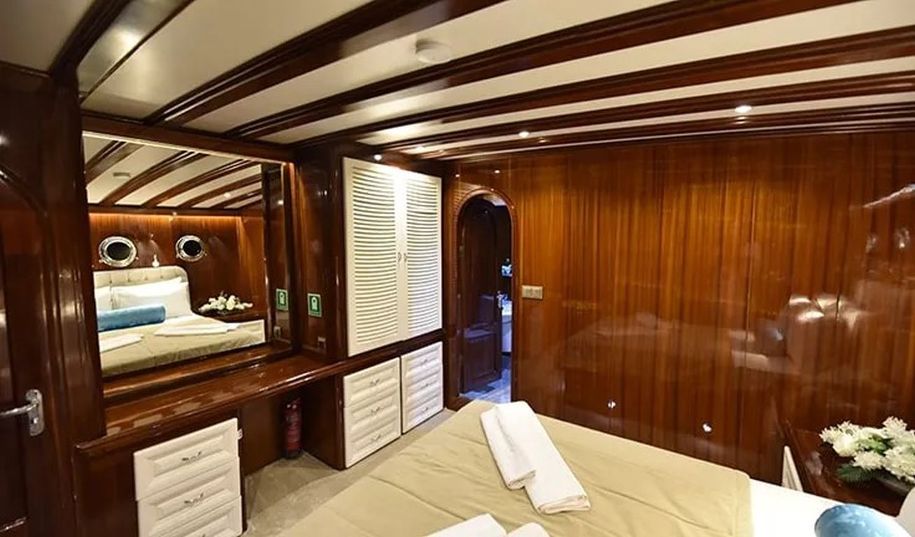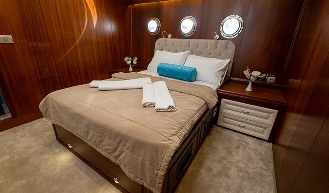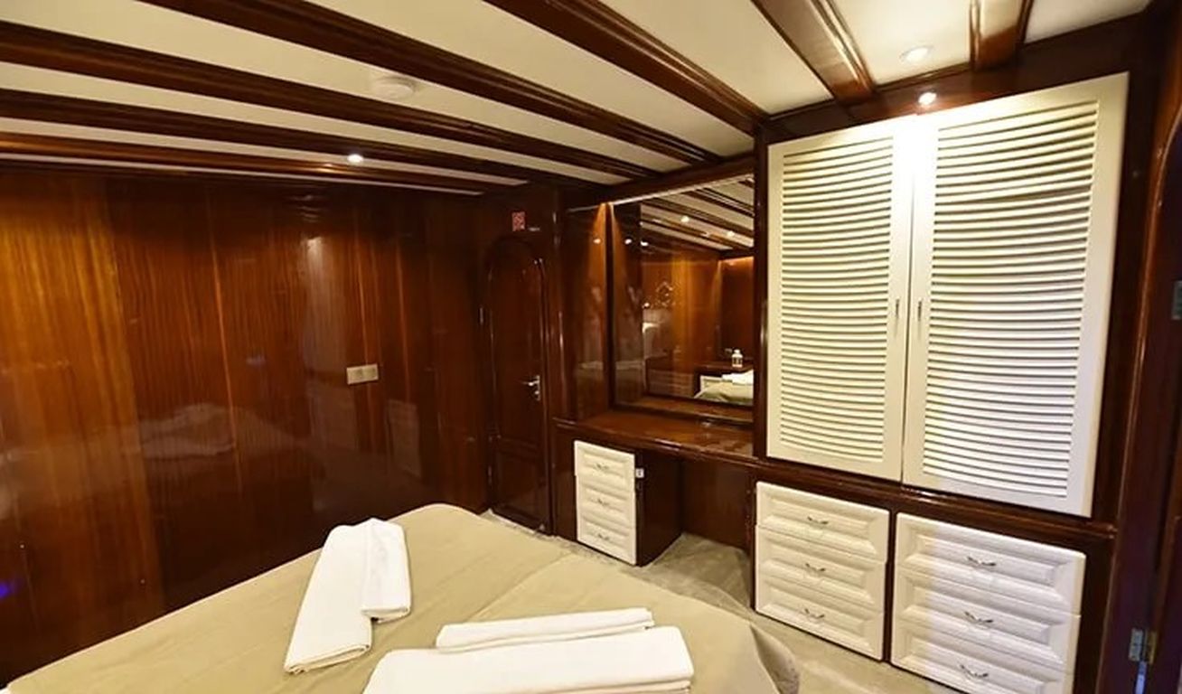 | Die Gulet Kayhan 11 ist eine 34 Meter lange Ketch, gebaut 2002 und 2017 umfassend renoviert. Sie verfügt über 10 Kabinen – sechs Doppel- und vier Zweibettkabinen – mit einer Gesamtkapazität von 20 Gästen. Jede Kabine ist mit Klimaanlage, Bad und Dusche ausgestattet. Die Klimaanlage ist acht Stunden täglich verfügbar (erweiterbar gegen Aufpreis). Das Deck ist großzügig gestaltet, mit schattigen Essbereichen, gepolsterten Sitzgelegenheiten und großen Sonnenflächen. Der Salon verfügt über einen Esstisch, eine Bar und gemütliche Sitzbereiche. Zu den Wassersportarten gehören Kanu und Wasserski, weitere Aktivitäten wie Wakeboard, Ringo oder SUP sind gegen Aufpreis erhältlich. Schnorchel- und Angelausrüstung stehen ebenfalls zur Verfügung. Angetrieben von zwei 450 PS Iveco-Motoren und zwei 45 kW Onan-Generatoren, erreicht sie eine Geschwindigkeit von 11 Knoten. Die Kayhan 11 ist eine hervorragende Wahl für große Gruppen, die eine elegante und serviceorientierte Blaue Reise suchen. |