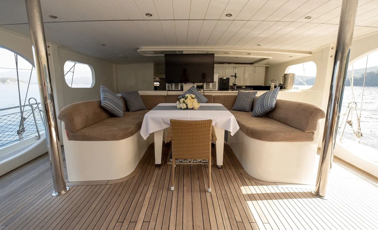 Außenbordmotor, Kanu, Waschmaschine, Geschirrspüler, Eismaschine, Telefonanschluss innen, WLAN (nur für türkische Küsten), UKW, Radar, GPS, Echolot, Autopilot, SSIS, AIS Klasse A+B, Epirp, Navtex (Wetterbericht per Satellit), Salon mit Fernseher, DVD-Player, Musikanlage, Segel (Rollsegel), Teakdeck, Warmwasser, Wasseraufbereitungsanlage, Abwassertank, Angelausrüstung, Schnorchelausrüstung, Beiboot |