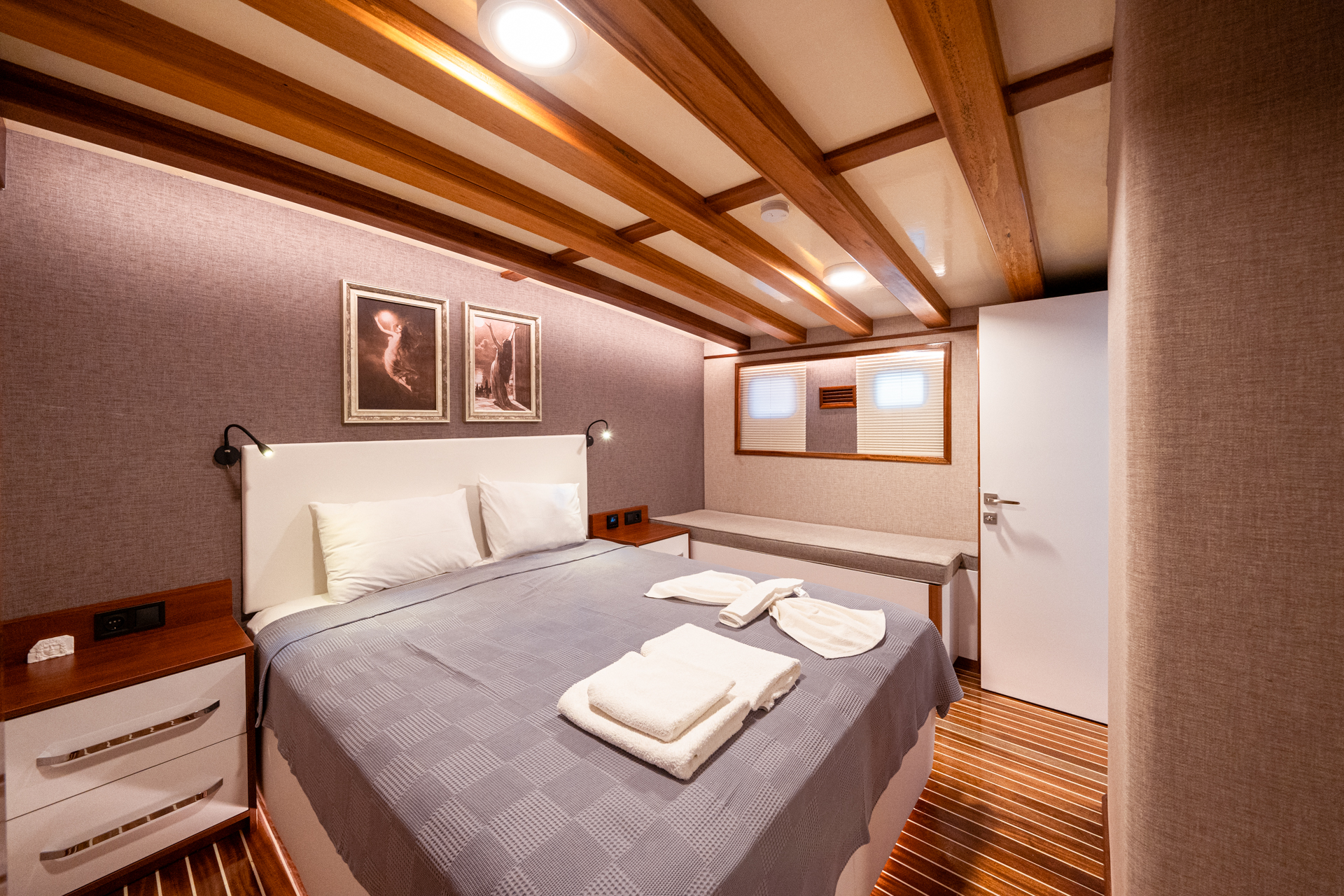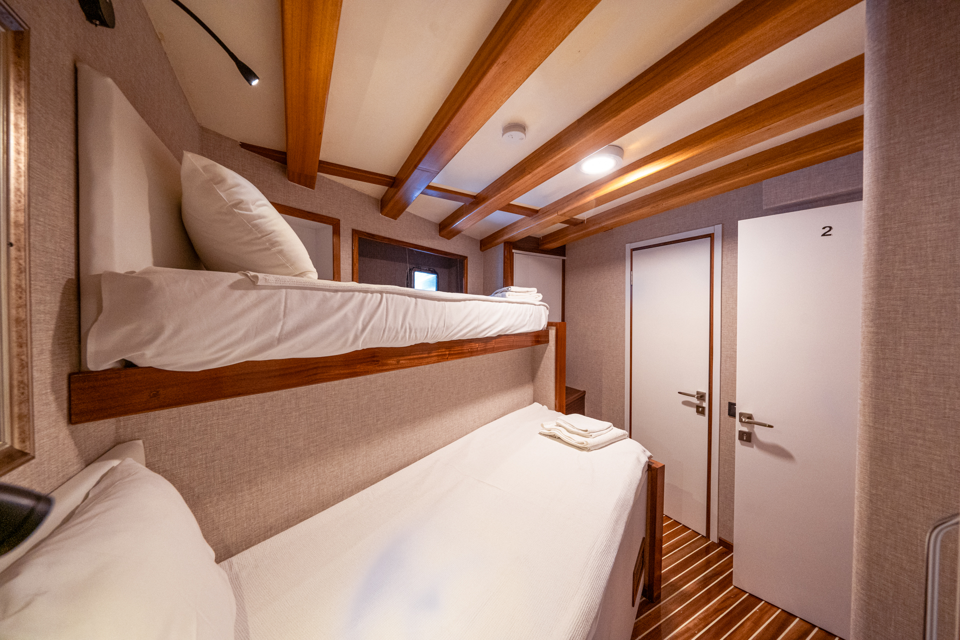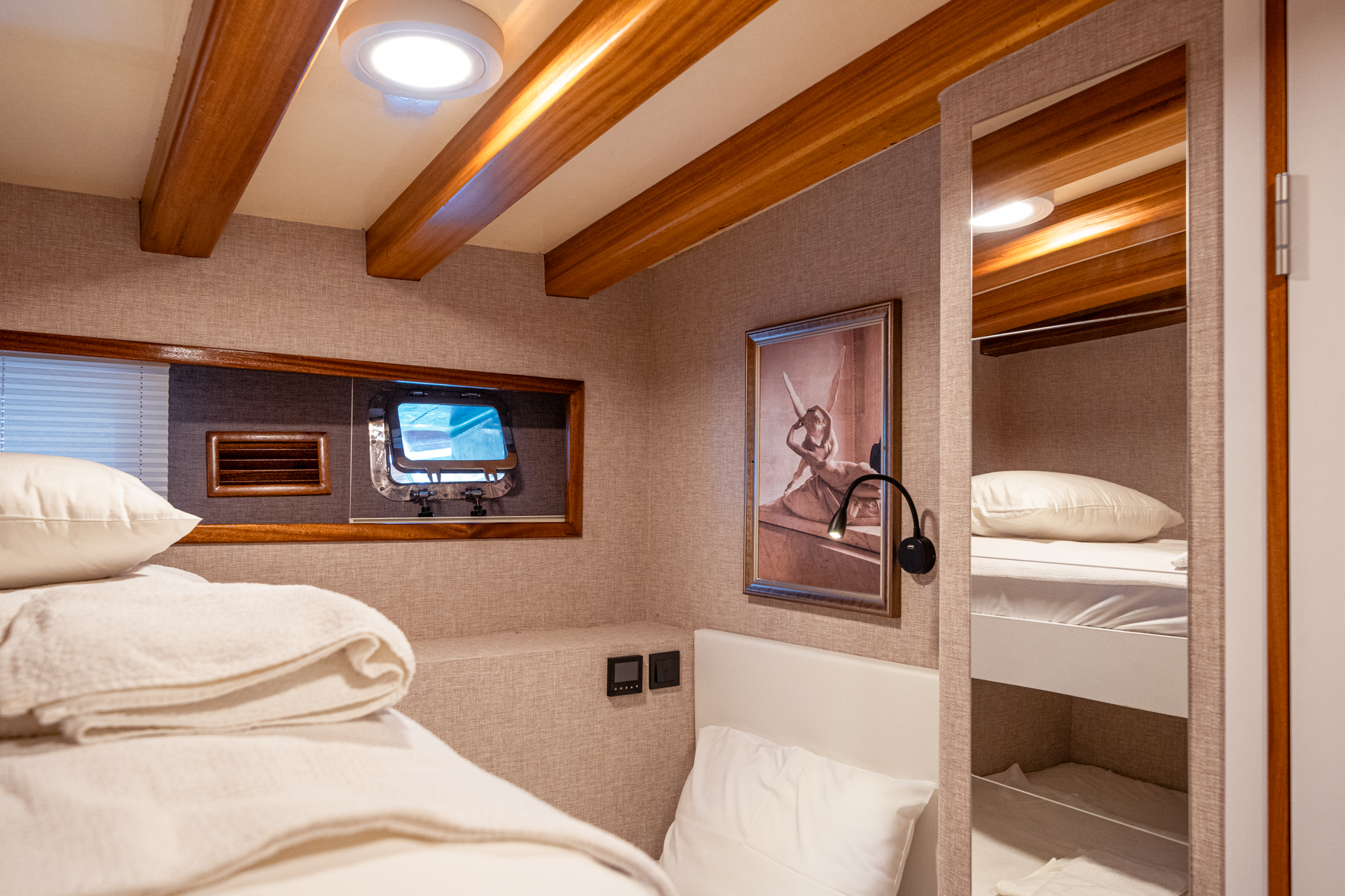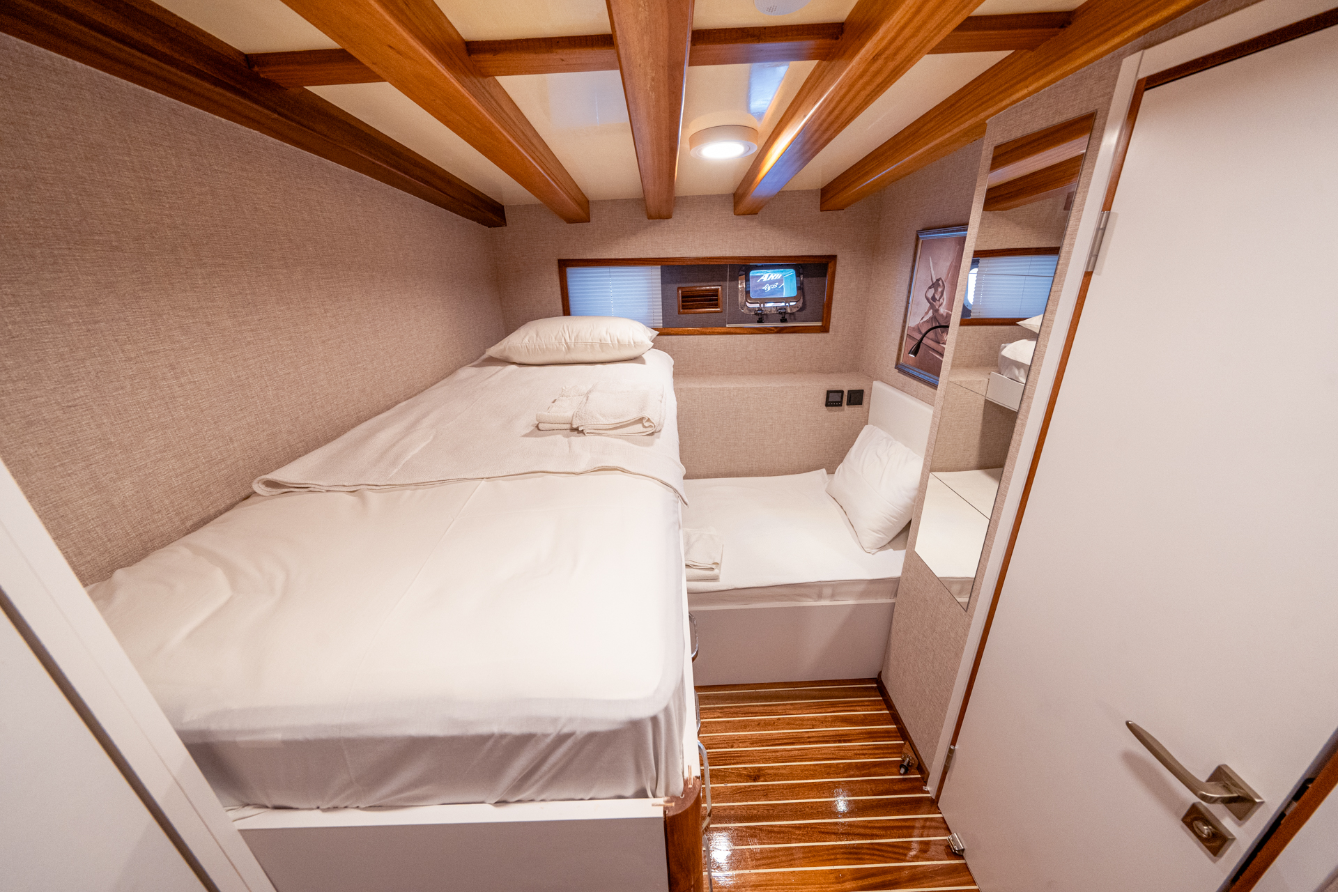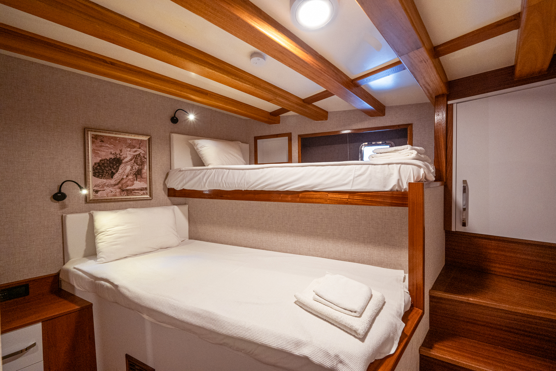 | 16 Kabinen, bis zu 36 Gäste; 4 Master, 8 Twin und 4 Quad-Bett-Kabinen, Salon und alle Kabinen mit Klimaanlage, Fernseher in allen Kabinen, Duschkabine und Haushaltstoiletten in allen Kabinen, separate Mannschaftskabinen |
