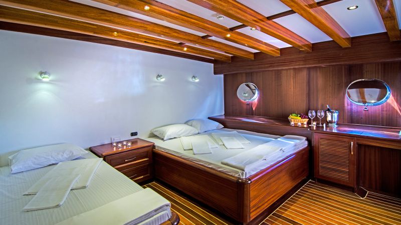| Bis zu 32 Gäste; 10 Doppelkabinen, 4 Dreibettkabinen, 2 Zweibettkabinen mit Dusche und WC, Fernseher & DVD und Musikanlage in den Kabinen, separate Mannschaftskabinen. |