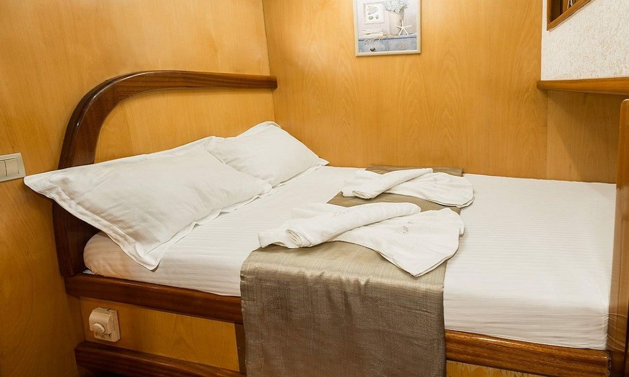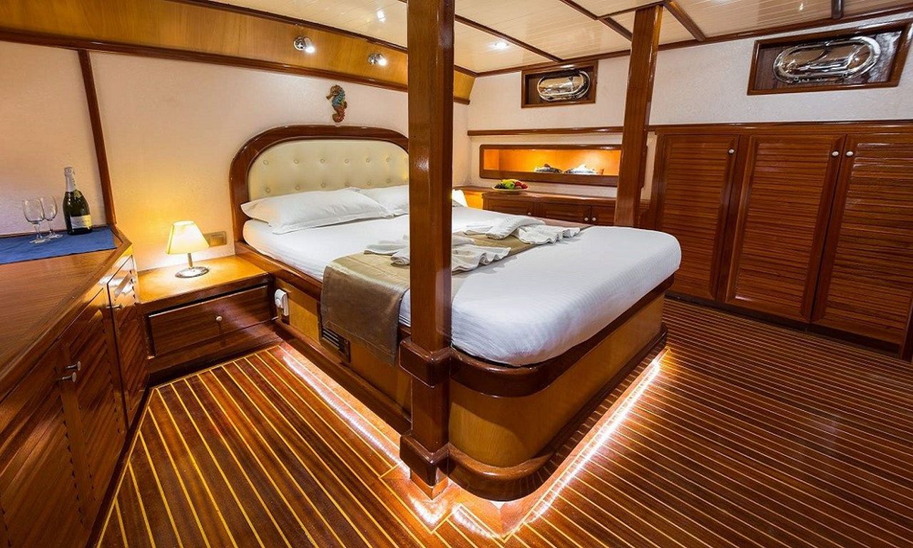 | Bis zu 6 Gästekapazität; 1 Masterkabine, 3 Doppelkabinen, Klimaanlage in allen Kabinen, Duschkabine und Toiletten im Haushaltsstil in allen Kabinen, separate Mannschaftskabinen. |