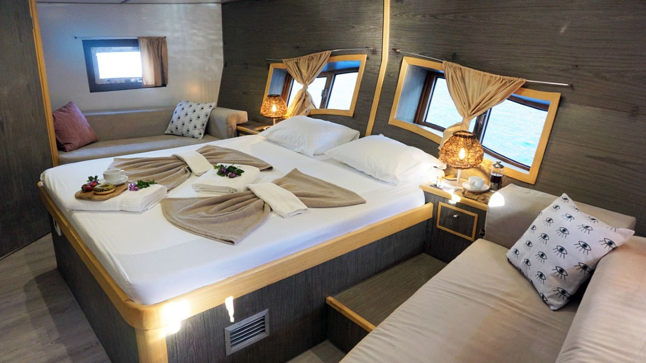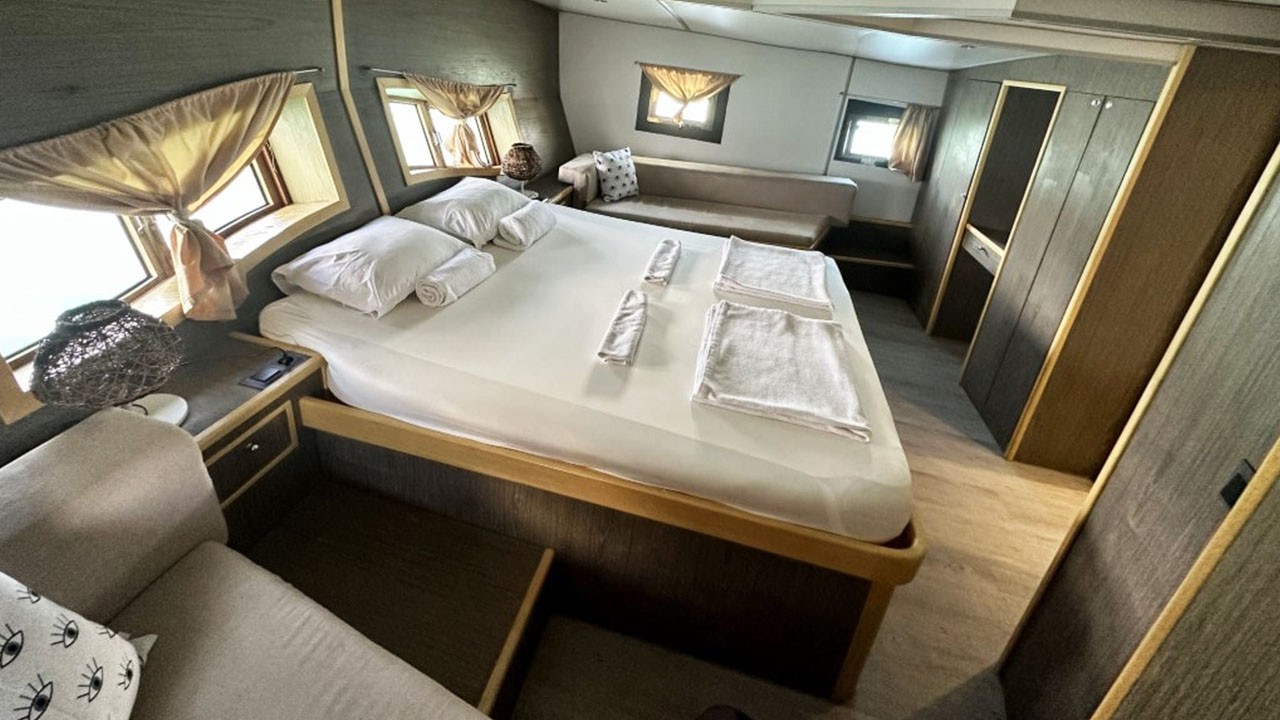 Das weitläufige Deck bietet gepolsterte Sitzgruppen, Sonnenliegen und einen Essbereich im Freien am Heck. Zusätzlich gibt es einen separaten Essbereich, und die Mahlzeiten werden in einer voll ausgestatteten Küche zubereitet. Zur Unterhaltung stehen Ihnen Fernseher, DVD-Player, Musikanlage, Essbereich im Innen- und Außenbereich, Internetanschluss und vieles mehr zur Verfügung.