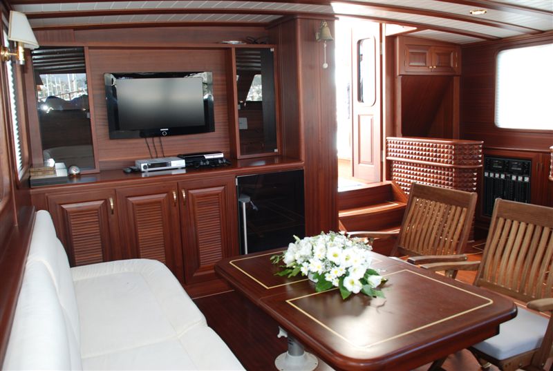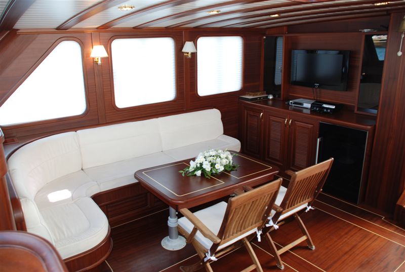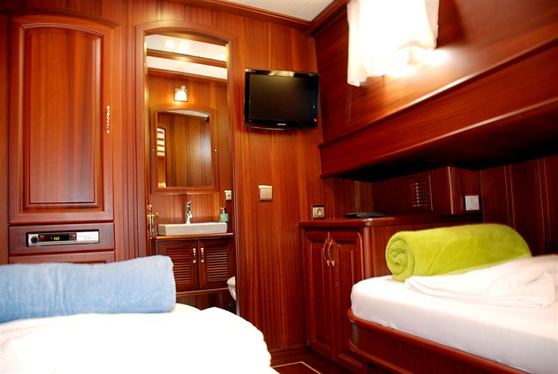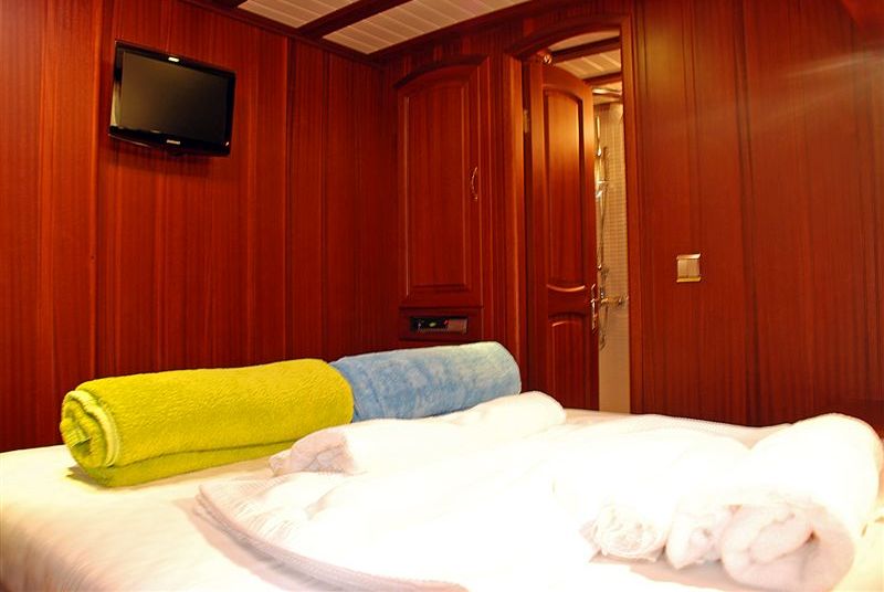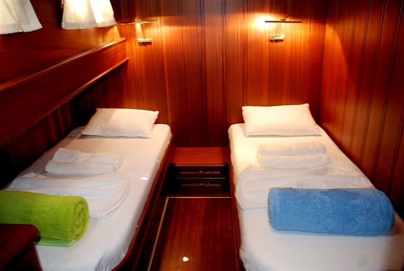 Bis zu 8 Gäste; 4 Suiten bestehend aus: 2 luxuriösen Doppelkabinen mit Kingsize-Betten. 2 Zweibettkabinen mit umbaubaren Betten zu Kingsize-Betten. Alle Kabinen haben ein eigenes Badezimmer. Individuell ferngesteuerte Klimaanlage (warm/kalt), Push-Flush-Toiletten, Haartrockner, Minibar, Feuerlöscher und Rauchmelder. Klimatisierter Innensalon, geräumiges Sonnendeck mit Sitzbereich vorne. Separate Mannschaftsquartiere. |