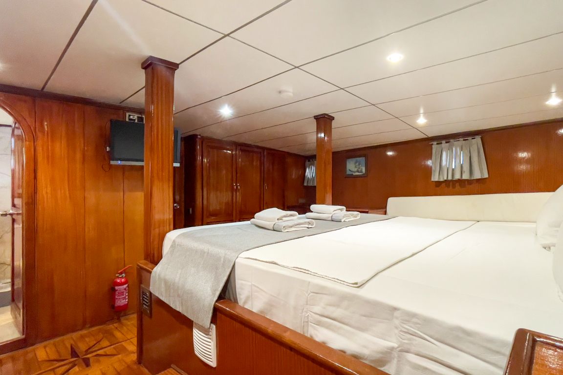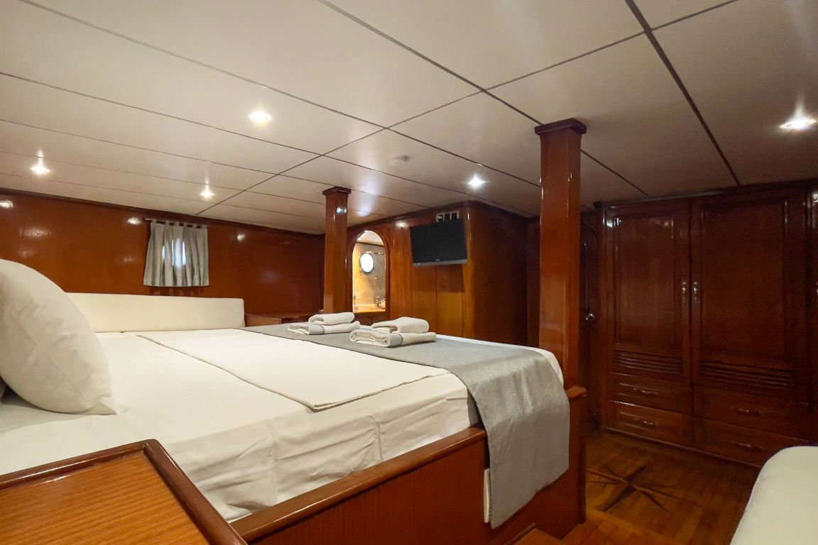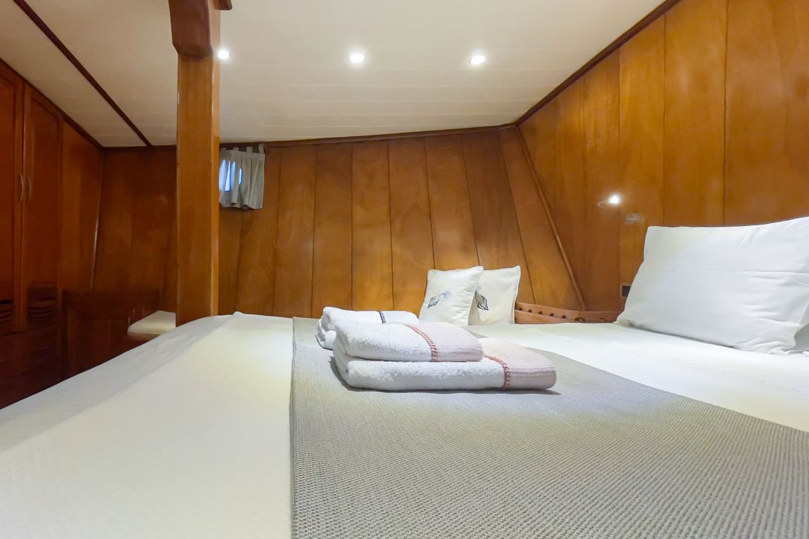 | Bis zu 8 Gästekapazität; 2 Master, 2 Doppelkabinen, Klimaanlage, Duschkabine und Toiletten im Haushaltsstil in allen Kabinen, separate Mannschaftskabinen. |