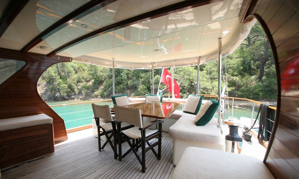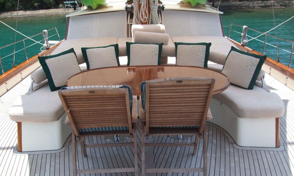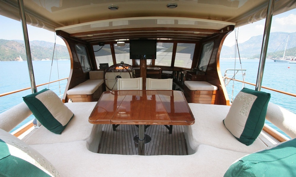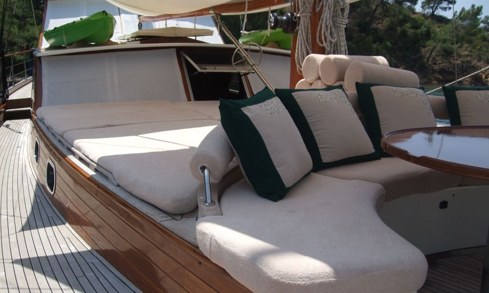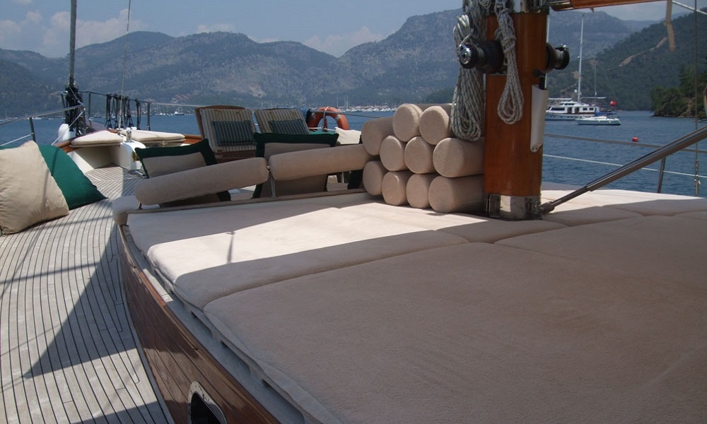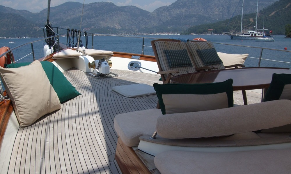 Es gibt ausreichend Sonnenkissen, Stühle und Serviersets für alle Gäste. Gulet Freya verfügt dank seiner vollwertigen Radio-, GSM-Telefon-Navigationsausrüstung; Bodrum, Göcek, Marmaris, Fethiye usw. Sie können sicher zu unseren Zielen der Blauen Kreuzfahrt segeln.