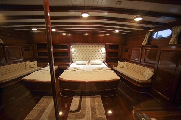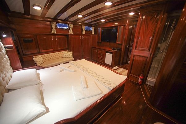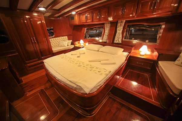 Unsere 24 m lange Gulet Furkan wurde 2010 gebaut. Unser Boot hat 4 Kabinen: 2 Master-, 1 Double- und 1 Twin-Kabinen, jede stilvoller und komfortabler, mit eigener Dusche, WC und Klimaanlage. 3 Es gibt separate Wohnbereiche, eine voll ausgestattete Küche, Essbereiche drinnen und draußen sowie Ruhebereiche für die Crew.