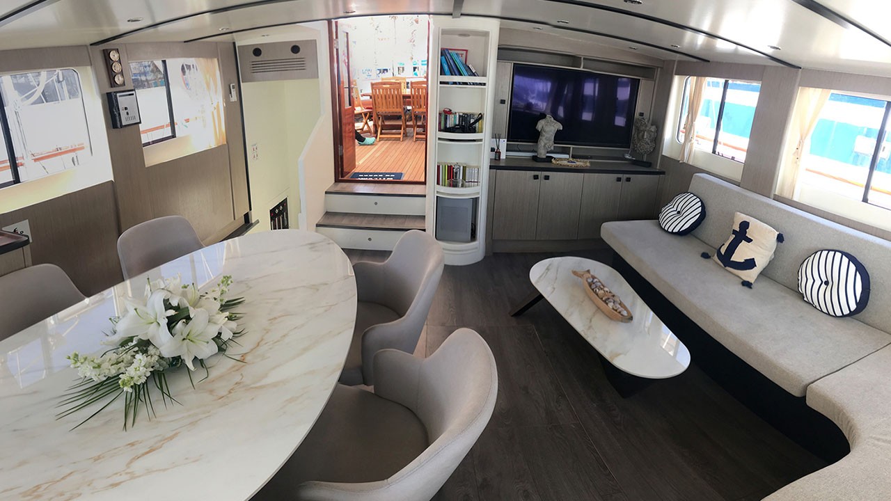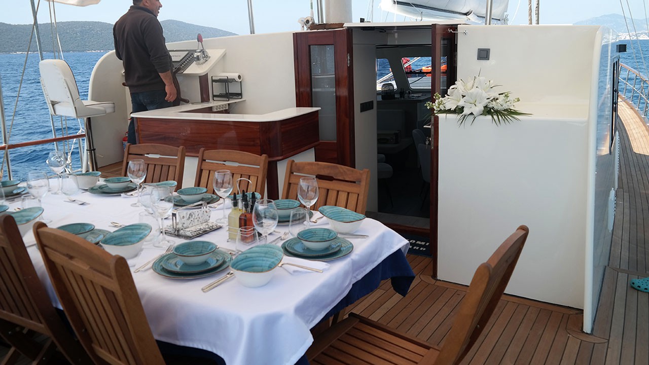 Es gibt ausreichend Sonnenkissen, Stühle und Serviersets für alle Gäste. Die Gulet Gulietta verfügt dank ihrer vollwertigen Radio-, GSM-Telefon-Navigationsausrüstung über eine hervorragende Navigationsausrüstung. Bodrum, Göcek, Marmaris, Fethiye usw. Sie können sicher zu unseren Zielen der Blauen Kreuzfahrt segeln.