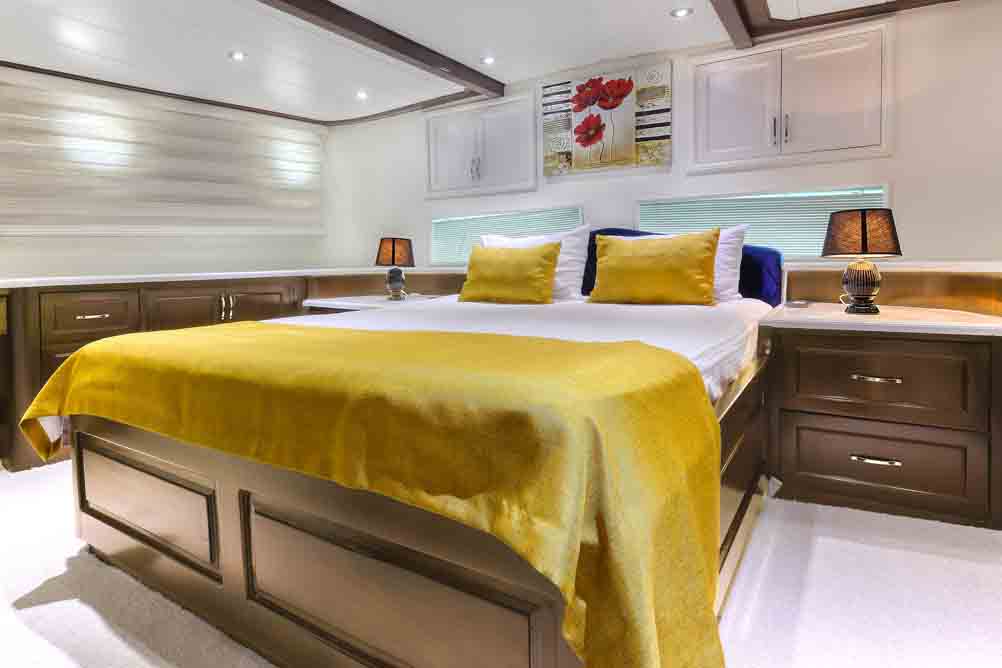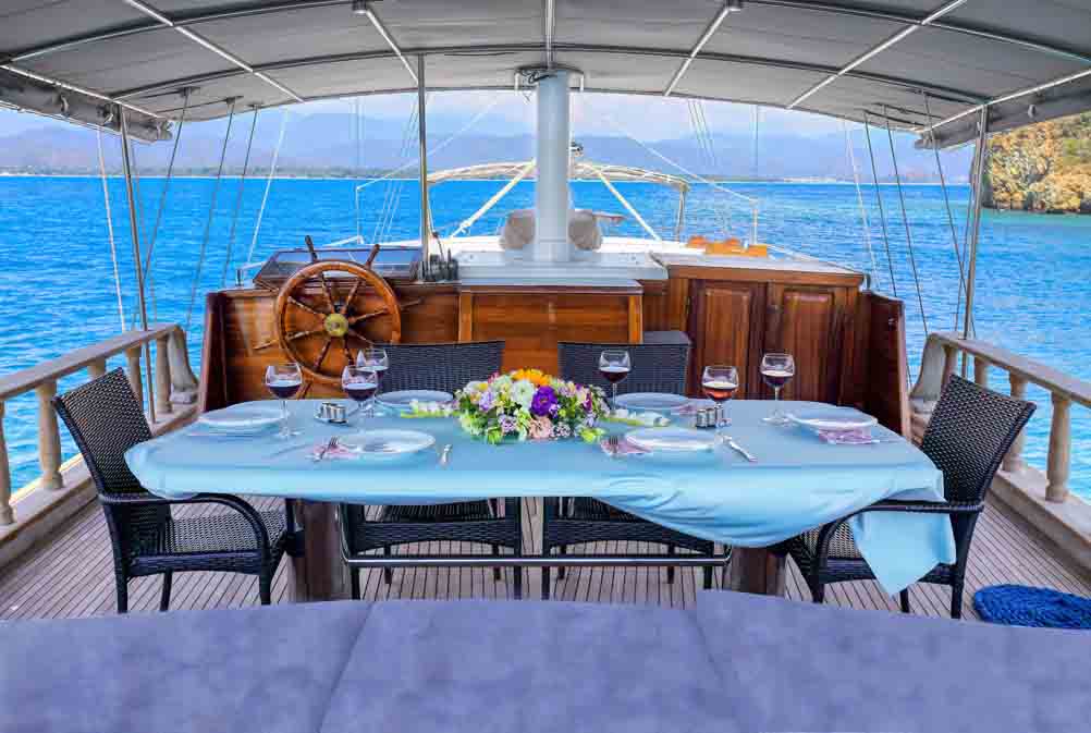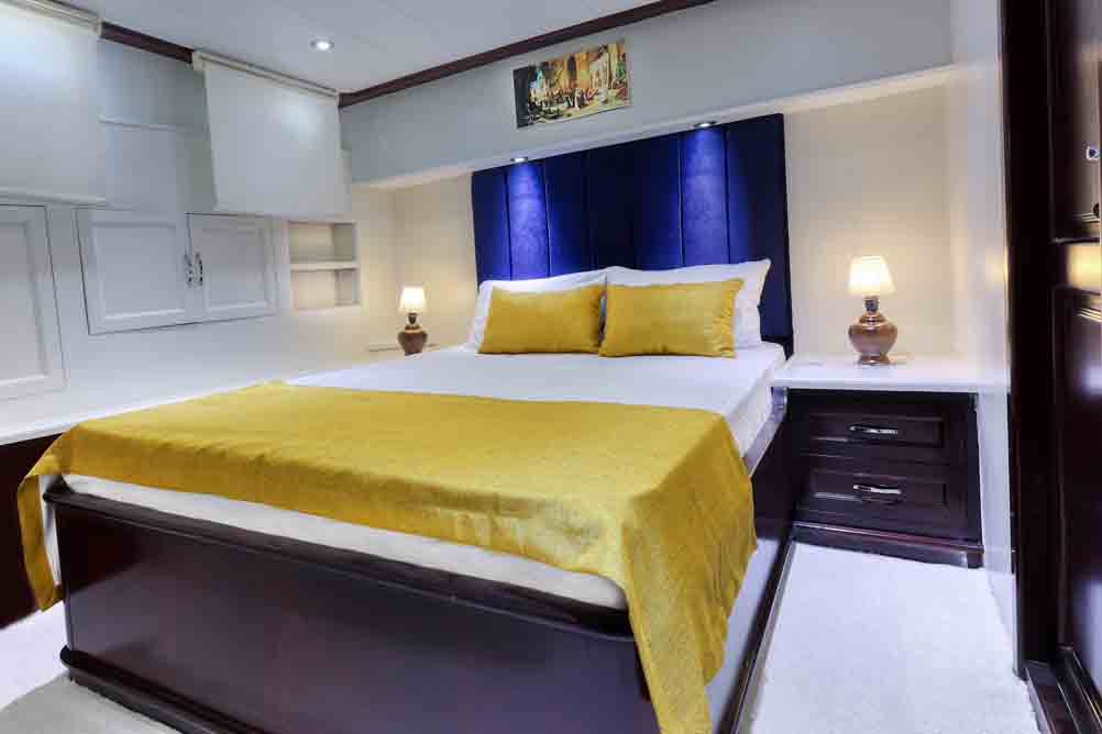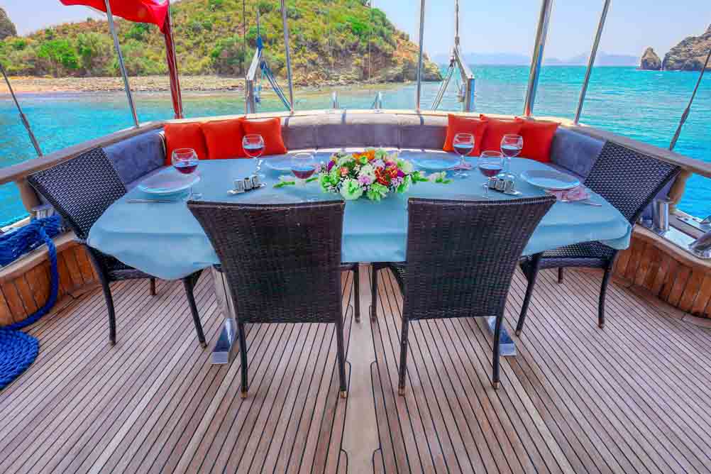 Unsere 22 m lange Gulet Hasay wurde 2006 gebaut. Ihre endgültige Form erhielt sie bei der Renovierung und Sanierung im Jahr 2012. Unser Boot verfügt über 4 Kabinen, 2 Master- und 2 Doppelkabinen, jede stilvoller und komfortabler, mit eigener Dusche, WC und Klimaanlage. Es gibt 3 separate Wohnbereiche, eine voll ausgestattete Küche, Essbereiche im Innen- und Außenbereich sowie Ruhebereiche für die Besatzung.