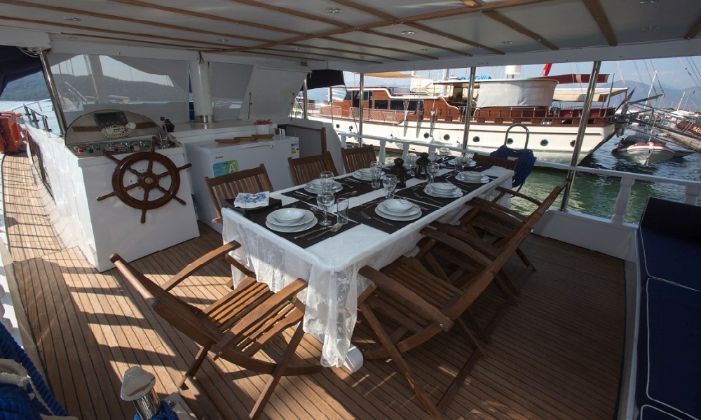 Es gibt genügend Sonnenkissen, Stühle und Service-Sets für alle Gäste. Dank seines vollwertigen Radios, GSM-Telefonnavigationsgeräten, Gulet Icarus; Sie können sicher zu unseren Zielen der Blauen Kreuzfahrt wie Bodrum, Göcek, Marmaris, Fethiye usw. kreuzen.
