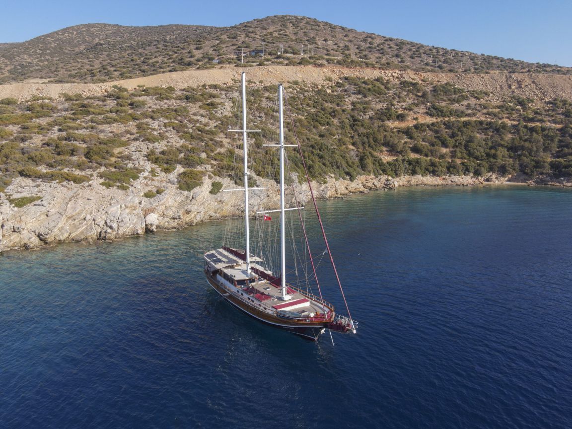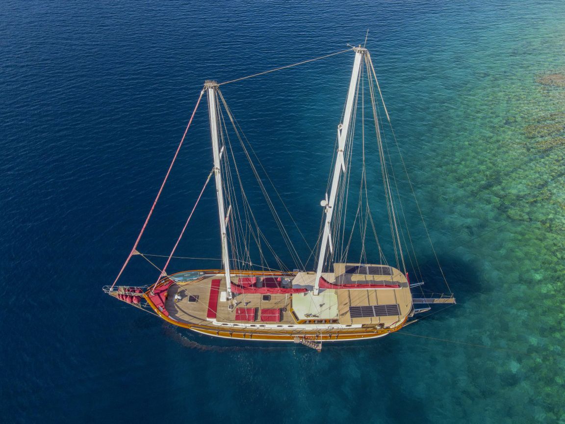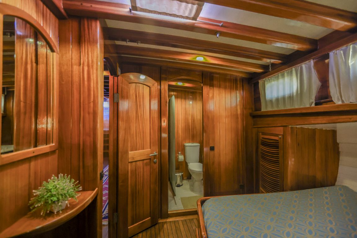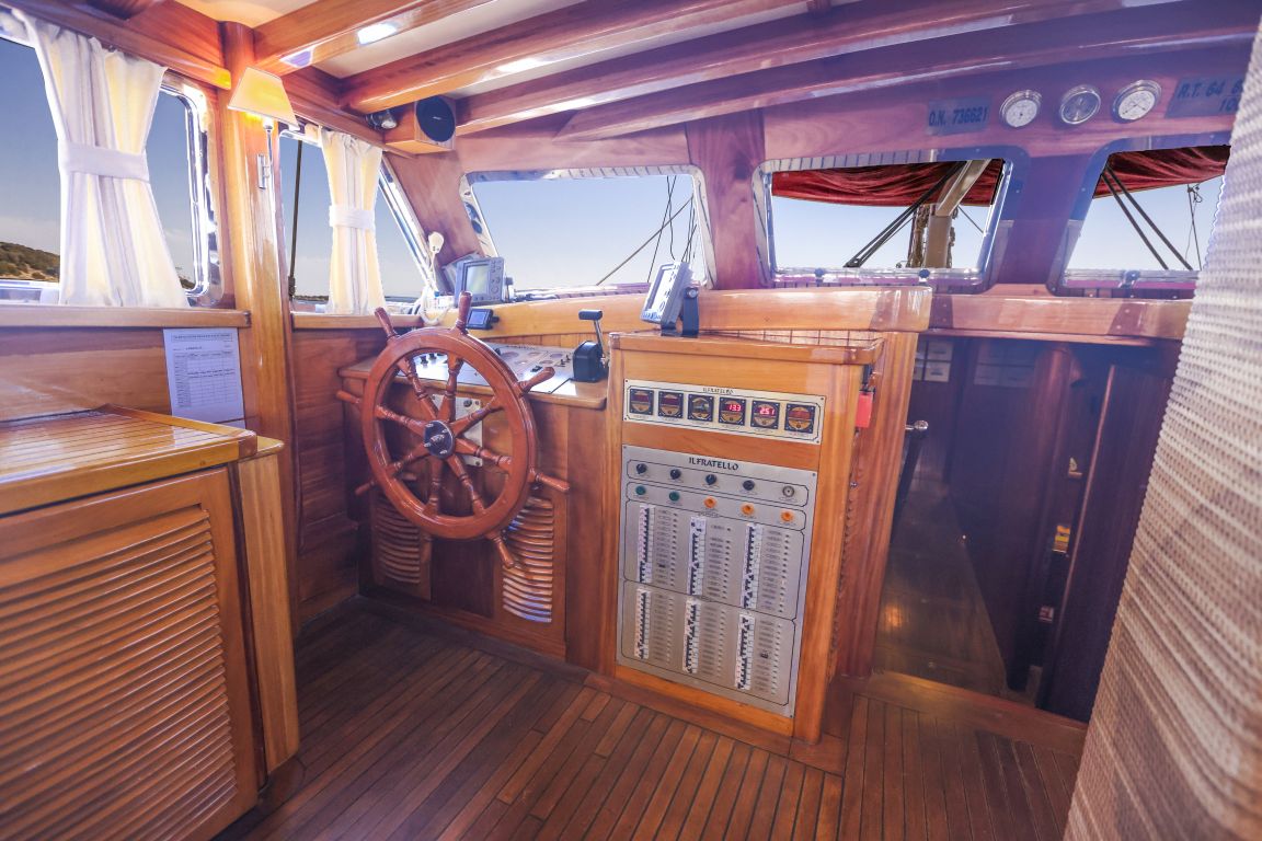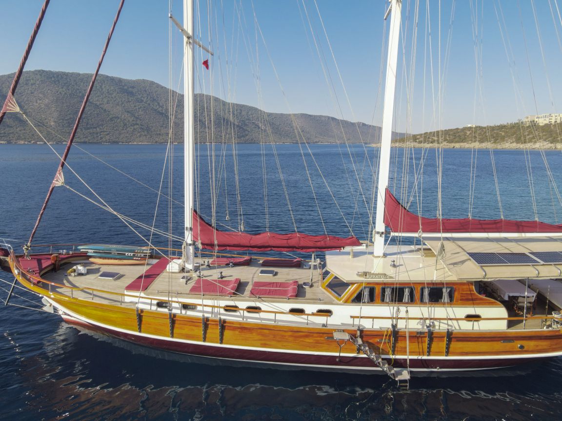Unsere 24 m lange Gulet Il Fratello wurde 2002 gebaut. Sie verfügt über vier Kabinen: drei Doppelkabinen und eine Zweibettkabine. Jede Kabine ist stilvoller und komfortabler als die andere und mit eigener Dusche, WC und Klimaanlage ausgestattet. Es gibt separate Wohnbereiche, eine voll ausgestattete Küche, Essbereiche im Innen- und Außenbereich sowie Ruhebereiche für die Crew.