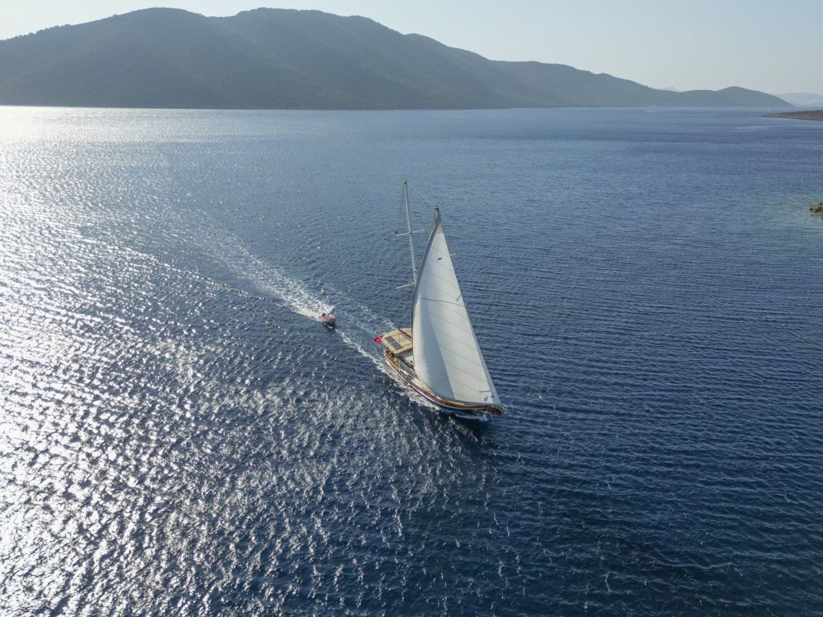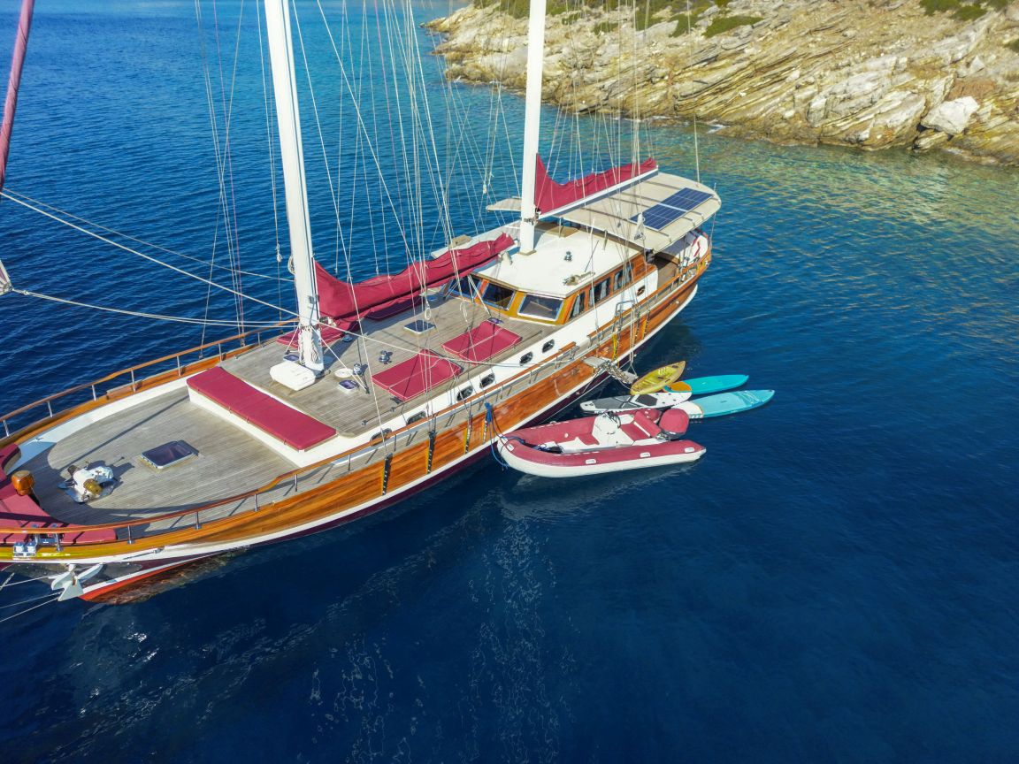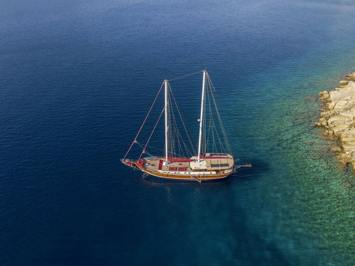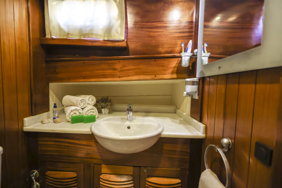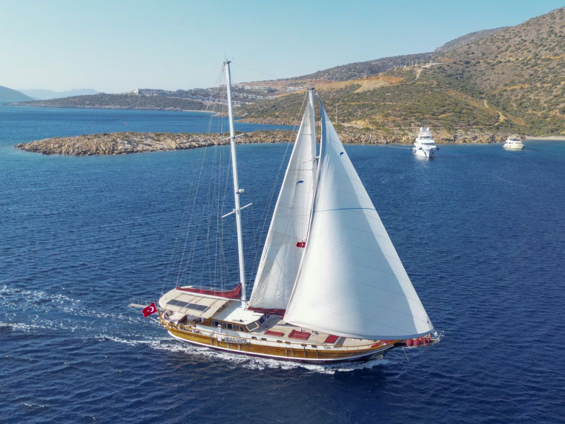 Unsere 24 m lange Gulet Il Fratello wurde 2002 gebaut. Sie verfügt über vier Kabinen: drei Doppelkabinen und eine Zweibettkabine. Jede Kabine ist stilvoller und komfortabler als die andere und mit eigener Dusche, WC und Klimaanlage ausgestattet. Es gibt separate Wohnbereiche, eine voll ausgestattete Küche, Essbereiche im Innen- und Außenbereich sowie Ruhebereiche für die Crew.