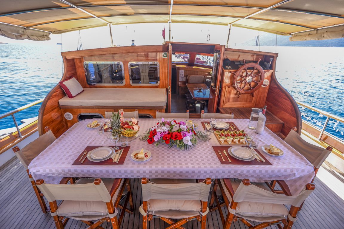 Für alle Gäste stehen ausreichend Sonnenliegen, Stühle und Geschirr zur Verfügung. Dank der modernen GSM-Telefon-Navigationsausrüstung können Sie mit der Gulet Il Fratello sicher zu unseren Zielen für Blaue Reisen segeln, darunter Bodrum, Göcek, Marmaris und Fethiye.