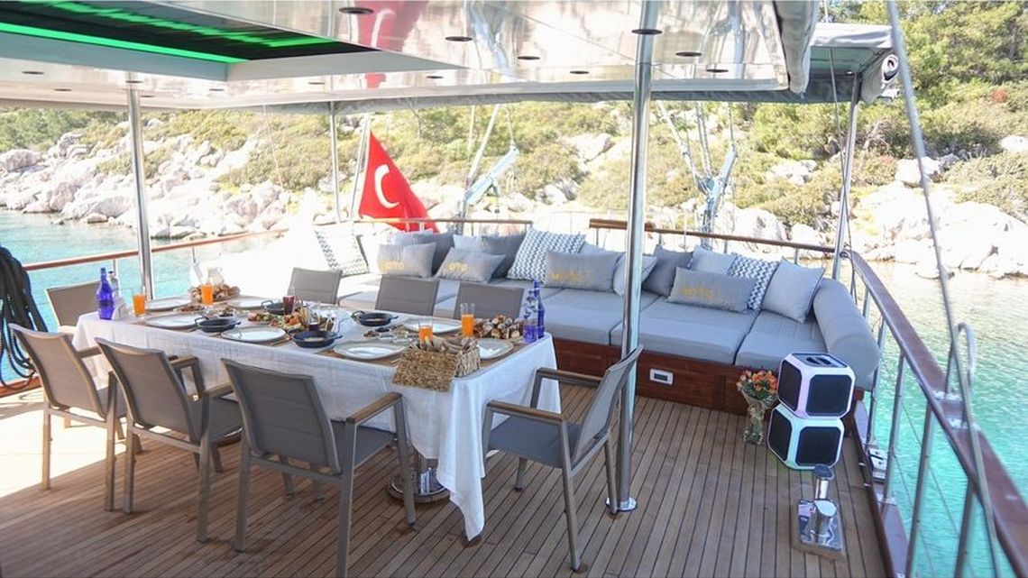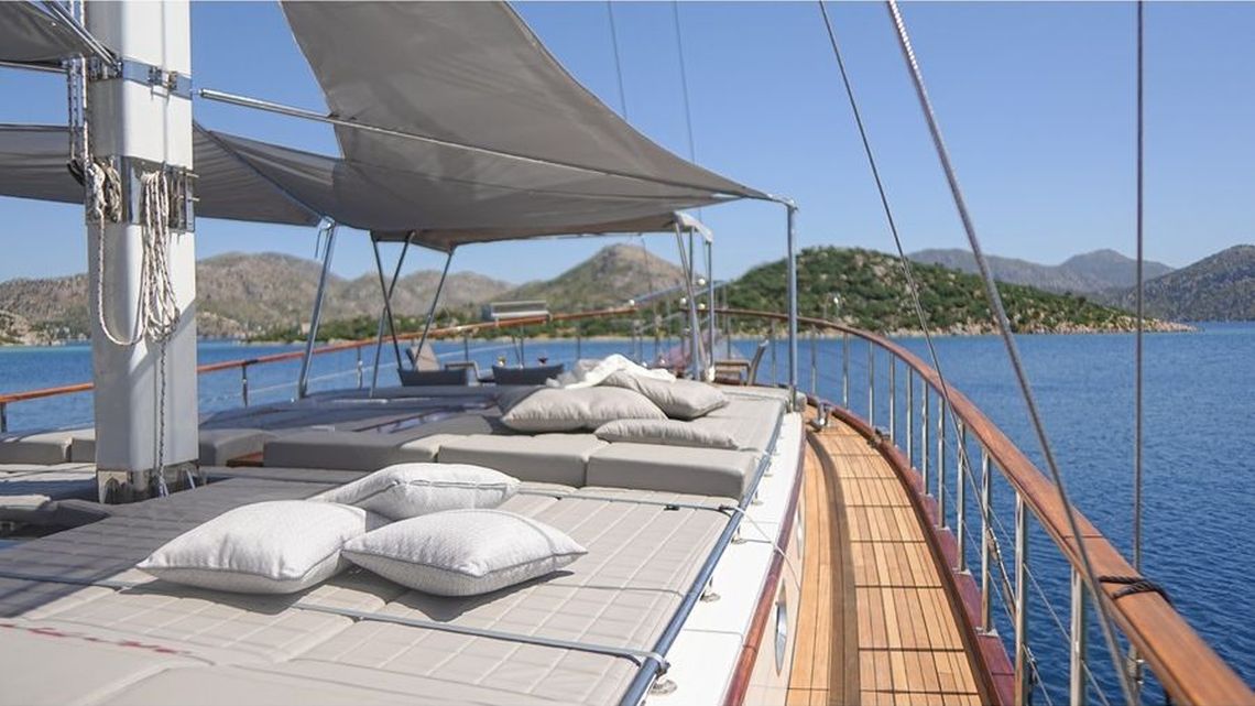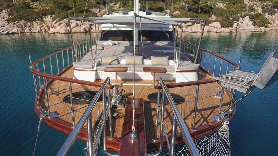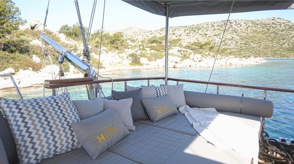 Die Außenbereiche der Motto sind für angenehme Momente im Freien konzipiert. Das Achterdeck verfügt über einen geräumigen Essbereich und gemütliche Sitzgelegenheiten, während das Vordeck Sonnenmatratzen und einen entspannenden Loungebereich bietet. Den ganzen Tag über können die Gäste in kristallklaren Buchten schwimmen, die Sonne genießen oder Wasserspielzeug wie Paddleboards, Kanus und Schnorchelausrüstung nutzen – perfekt für einen aktiven Yachtcharter in der Türkei.