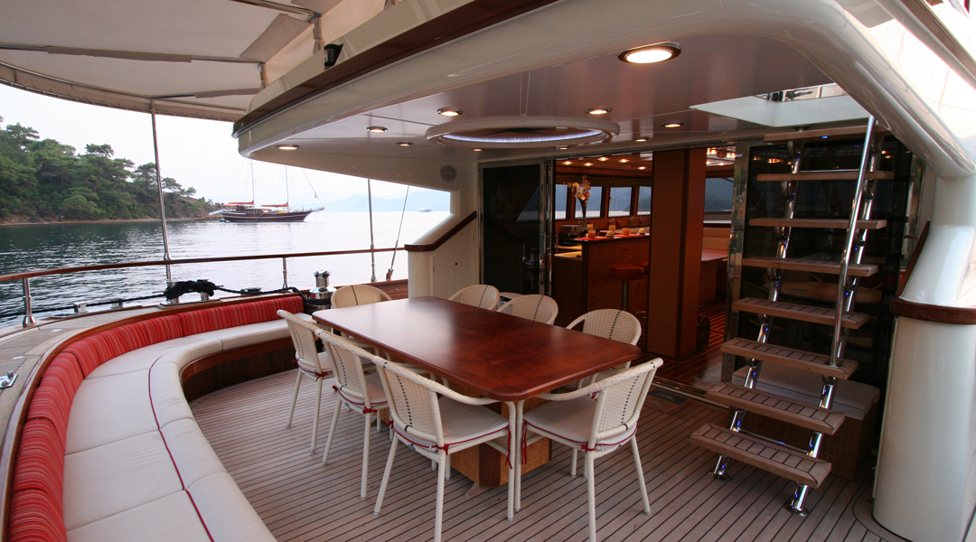 Es gibt ausreichend Sonnenkissen, Stühle und Serviersets für alle Gäste. Die Gulet Serenity 86 verfügt dank ihrer vollwertigen Radio-, GSM-Telefon-Navigationsausrüstung über eine vollwertige Navigationsausrüstung. Bodrum, Göcek, Marmaris, Fethiye usw. Sie können sicher zu unseren Zielen der Blauen Kreuzfahrt segeln.
