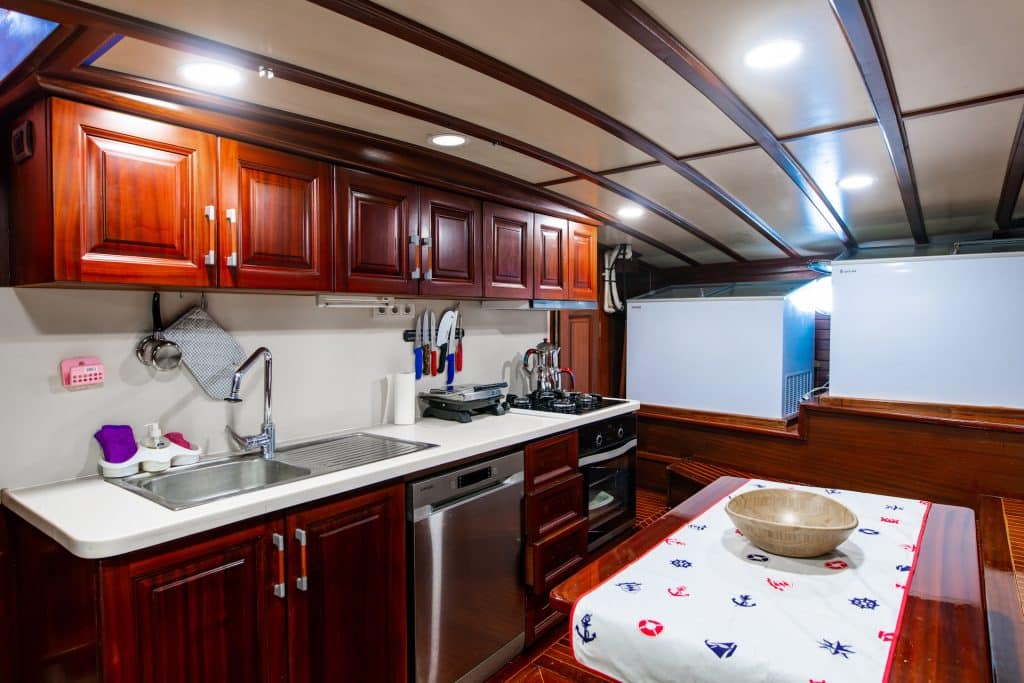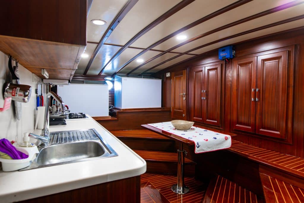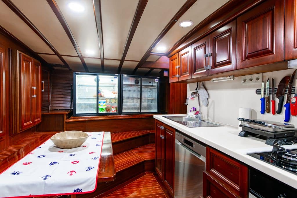 Küche, Essbereiche im Innen- und Außenbereich sowie Ruhebereiche für die Besatzung. Es gibt ausreichend Sonnenkissen, Stühle und Serviersets für alle Gäste. Gulet Sani Kaptan verfügt dank seiner vollwertigen drahtlosen GSM-Telefonnavigationsausrüstung; Bodrum,
