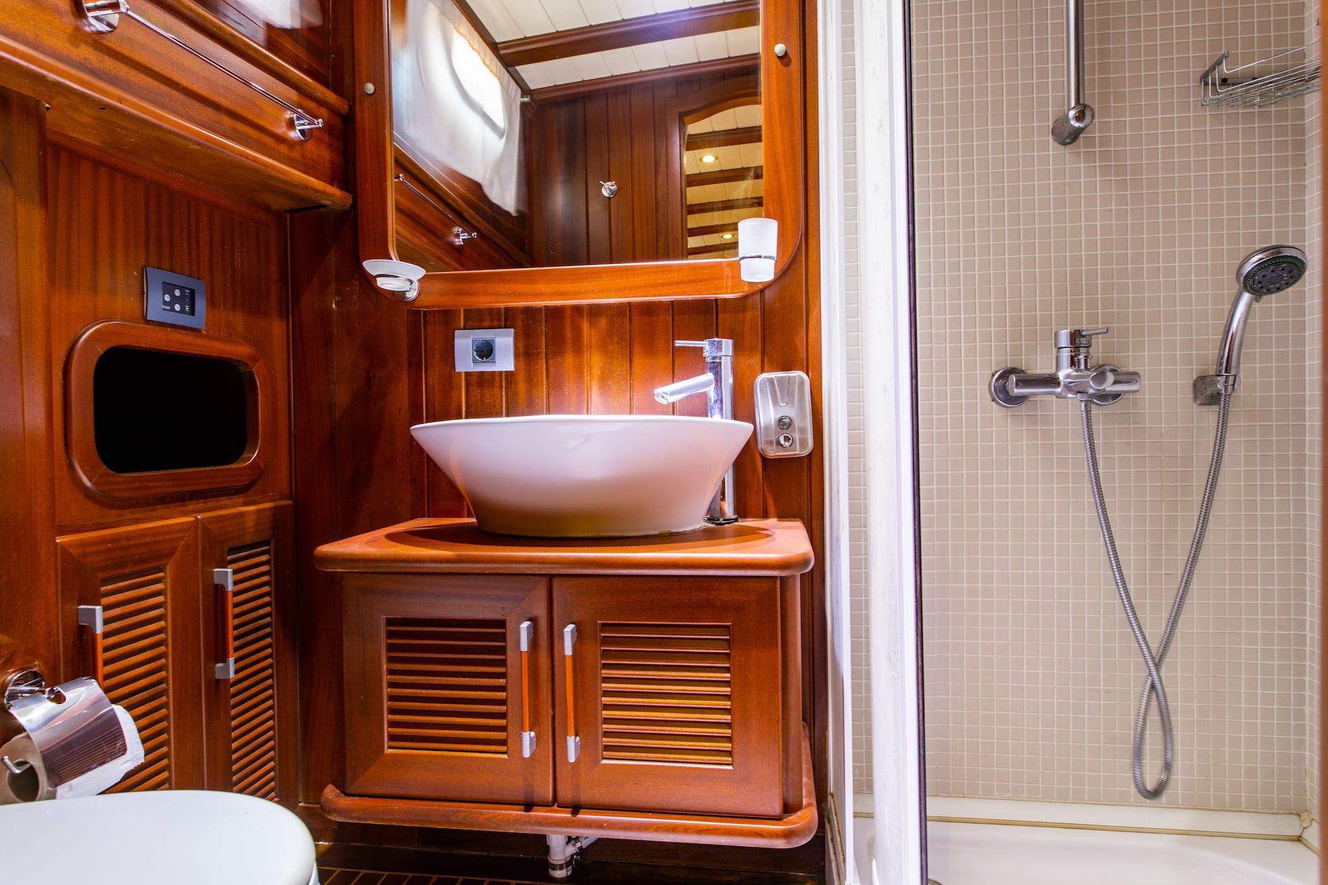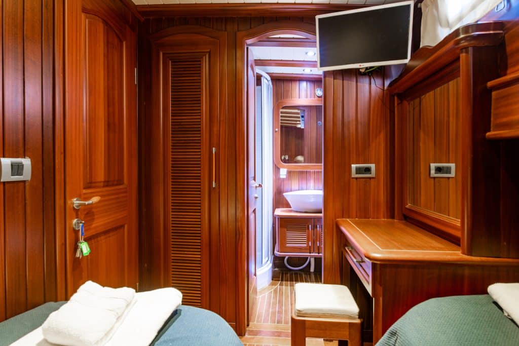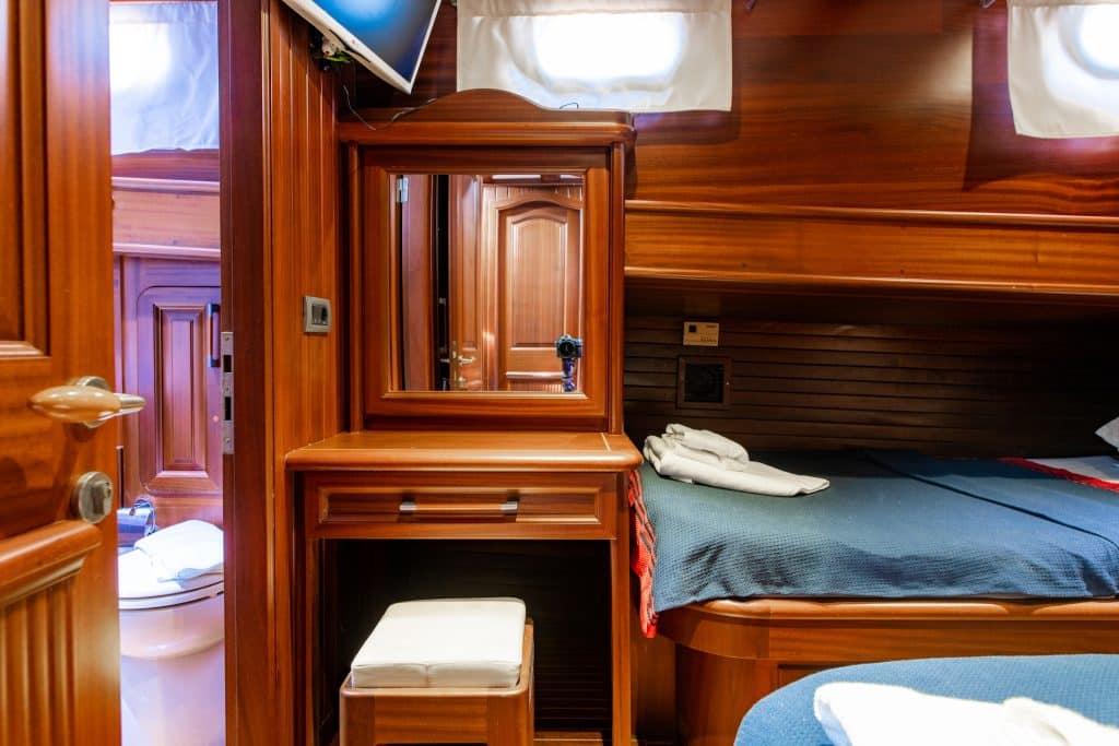 3 Doppel- und 1 Zweibettkabine, jede stilvoller und komfortabler als die andere, mit eigener Dusche, WC und Klimaanlage. 3 Es gibt separate Wohnbereiche, eine voll ausgestattete