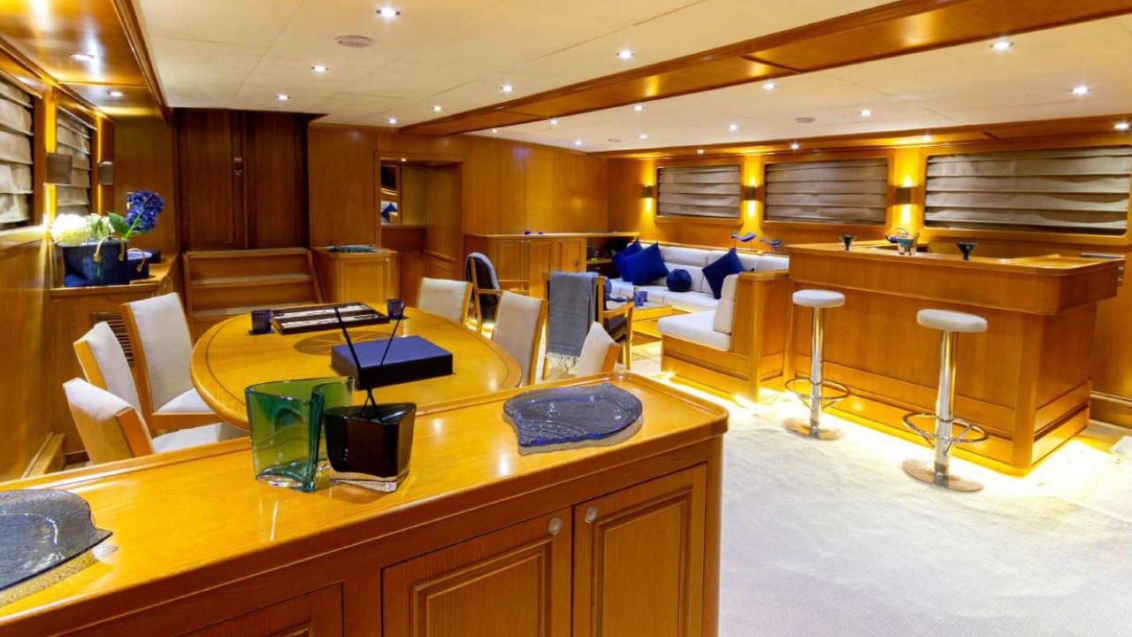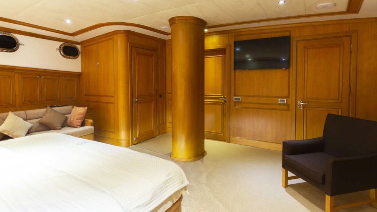 | Kapazität für bis zu 12 Gäste; 1 VIP, 1 Master, 3 Doppelkabinen, Duschkabine und Toiletten in allen Kabinen, separate Mannschaftskabinen. |