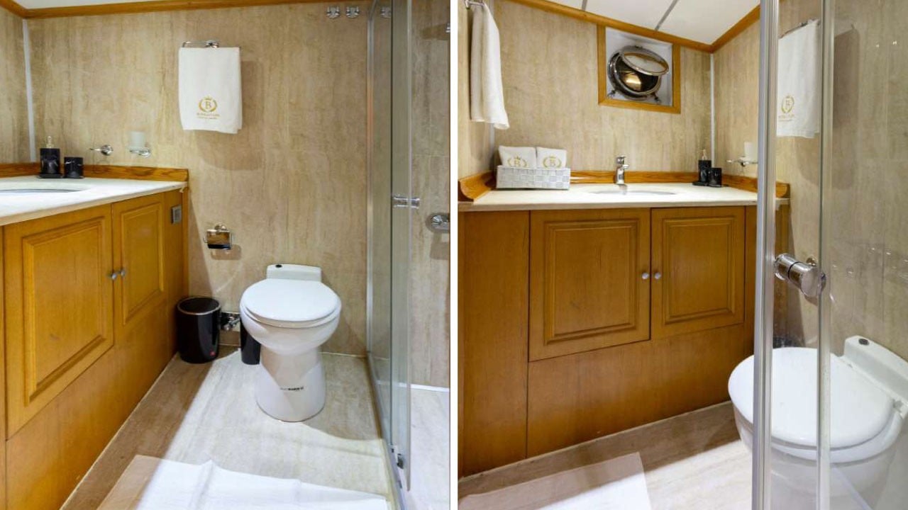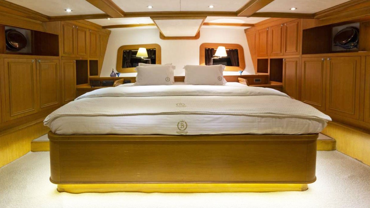 | Die Gulet Babylon ist eine 36 Meter lange Deluxe-Gulet, die 2013 gebaut und 2022 renoviert wurde, um höchsten Komfort zu bieten. Sie verfügt über fünf Kabinen – eine VIP-, eine Master- und drei Doppelkabinen – mit einer Gesamtkapazität von bis zu zehn Gästen. Die 8,30 Meter Breite sorgt für geräumige Innenräume und großzügige Außendecks. Das Deck bietet reichlich Platz zum Sonnenbaden, schattige Lounges und Essbereiche im Freien. Der elegante Salon ist mit einem Essbereich, bequemen Sitzgelegenheiten und einer voll ausgestatteten Küche versehen. Für Wassersportliebhaber bietet die Babylon eine große Auswahl: 100 PS Yamaha-Beiboot, Stand-up-Paddleboards, Wasserski, Wakeboard, Ringo, Kanu, Schnorchel- und Angelausrüstung. Die Yacht wird von zwei 440 PS MAN-Motoren angetrieben und durch 45 + 33 kVA Generatoren unterstützt, mit einer Geschwindigkeit von 12 Knoten. Klimaanlage: 18 Stunden pro Tag, Stromsysteme 12V/24V/220V. Die Gulet Babylon ist ideal für Gruppen, die auf ihrer Blauen Reise höchsten Luxus, Komfort und vielfältige Aktivitäten genießen möchten. |