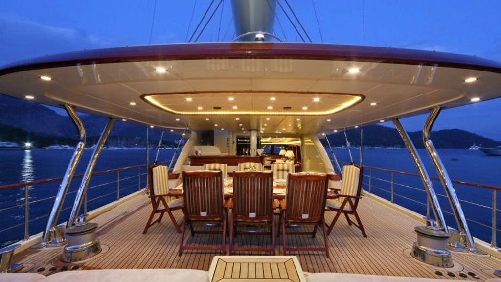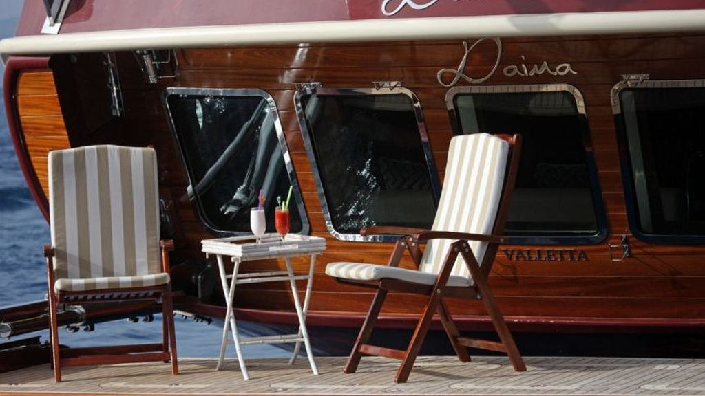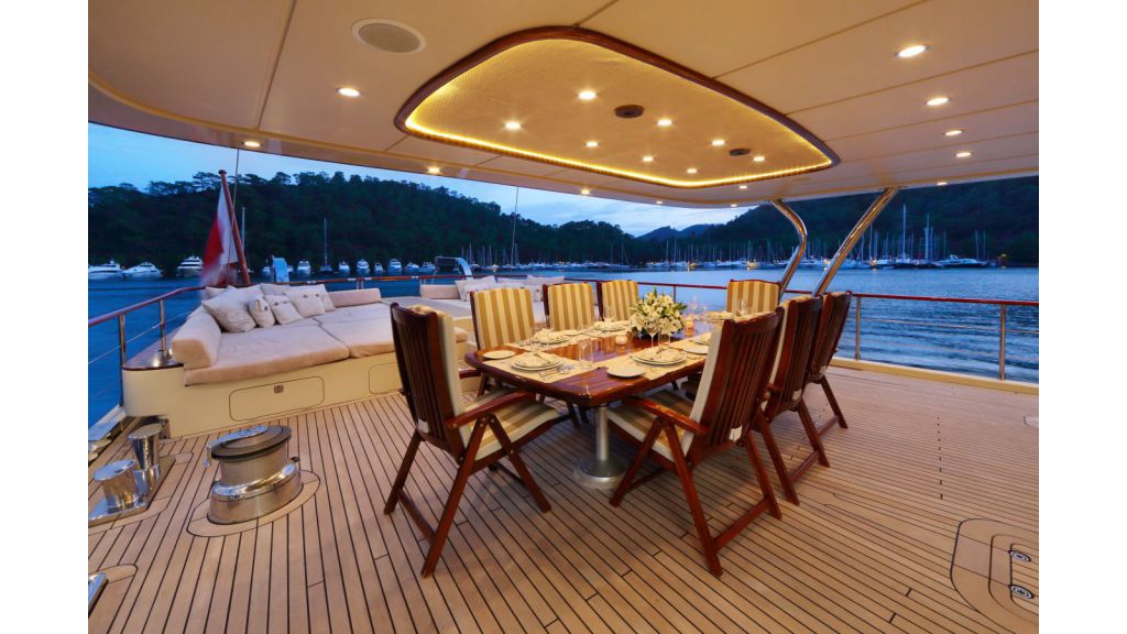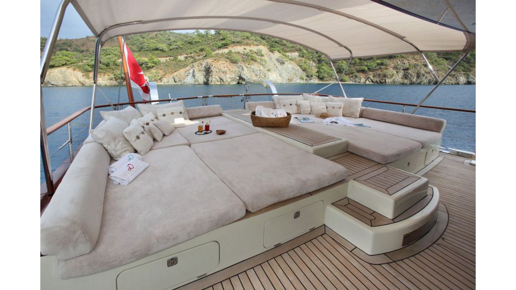 Unsere 42,50 m lange Gulet Daima wurde 2009 gebaut. Unser Boot verfügt über 5 Kabinen, darunter 1 Master, 2 Doppel und 2 Zweibettkabinen, jede stilvoller und komfortabler, mit eigener Dusche, WC und Klimaanlage. 7 Es gibt separate Wohnbereiche, eine voll ausgestattete Küche, Essbereiche im Innen- und Außenbereich sowie Ruhebereiche für die Besatzung. Es gibt ausreichend Sonnenkissen, Stühle und Serviersets für alle Gäste. Dank seiner vollwertigen Radio-, GSM-Telefon und Navigationsausrüstung bietet Gulet Always; Bodrum, Göcek, Marmaris, Fethiye usw. Sie können sicher zu unseren Zielen der Blauen Kreuzfahrt segeln.