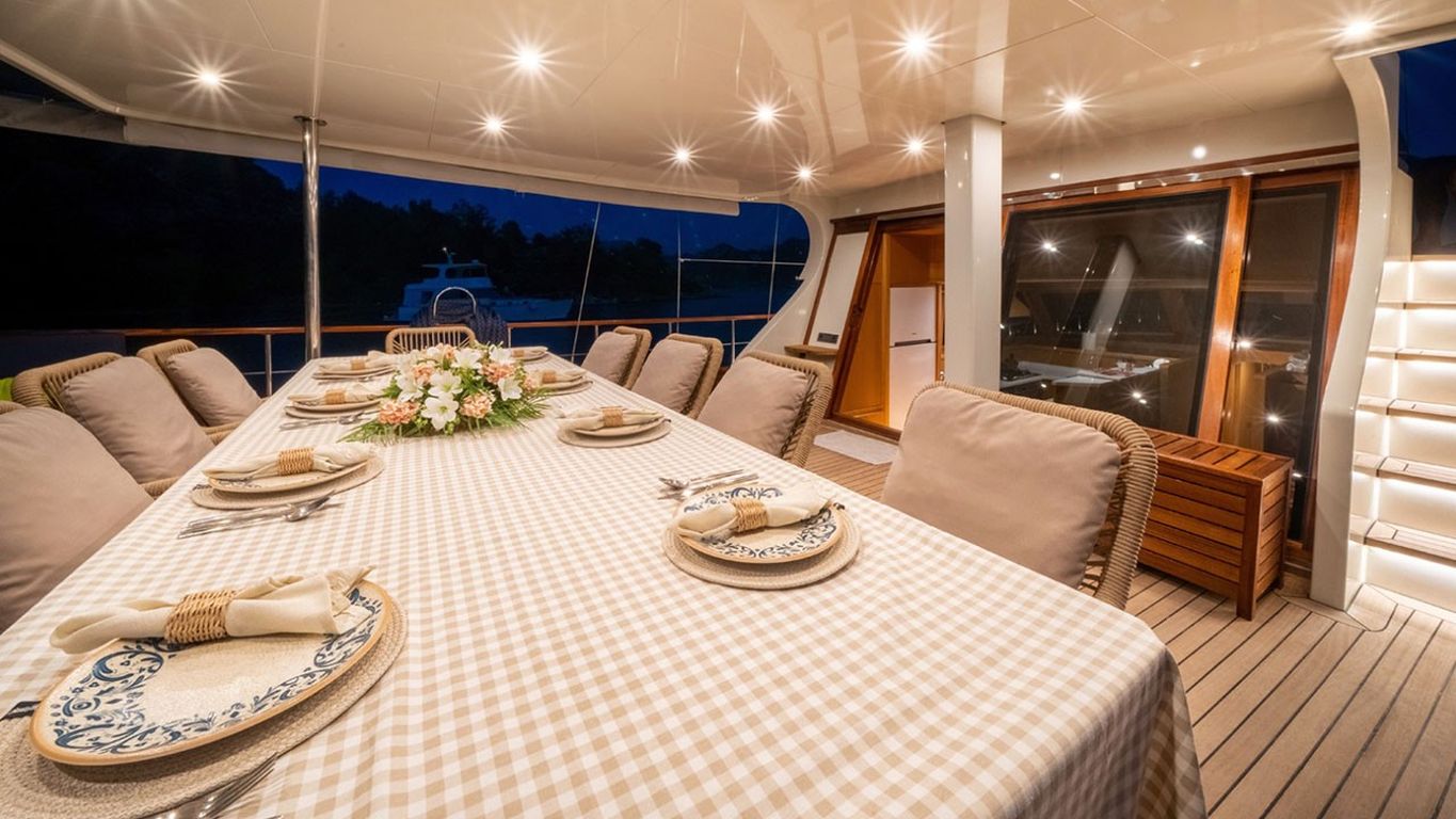 Die 6,50 Meter breite Yacht sorgt für helle Innenräume und weitläufige Außenbereiche, ideal für Gäste, die viel Raum und Komfort schätzen.