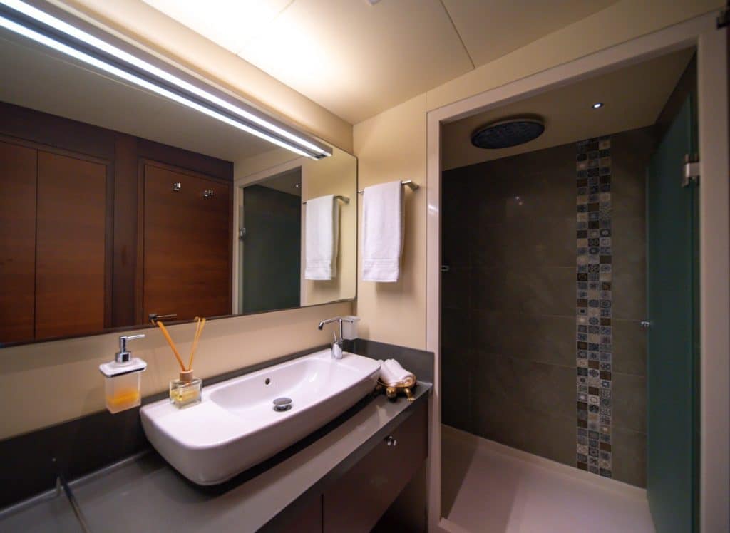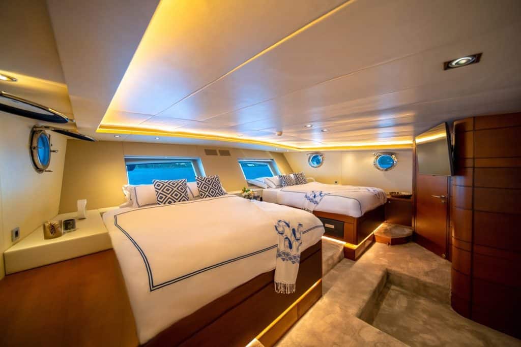 Bis zu 10 Gäste; 2 Master-, 1 Doppel-, 2 Zweibettkabinen, Klimaanlage, Kleiderschrank, Duschkabine und Haushaltstoiletten in allen Kabinen, separate Mannschaftskabinen. |