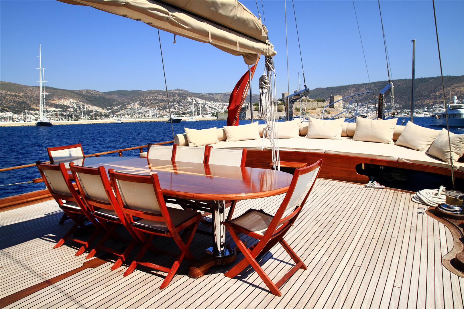 Unsere 34 m lange Gulet Estrella De Mar wurde 2011 gebaut. Unser Boot verfügt über 5 Kabinen, darunter 1 Master-, 2 Doppel- und 2 Zweibettkabinen, jede stilvoller und komfortabler, mit eigener Dusche, WC und Klimaanlage. 4 Es gibt separate Wohnbereiche, eine voll ausgestattete Küche, Essbereiche im Innen- und Außenbereich sowie Ruhebereiche für die Besatzung. Es gibt ausreichend Sonnenkissen, Stühle und Serviersets für alle Gäste. Die Gulet Estrella De Mar verfügt dank ihrer vollwertigen Radio-, GSM-Telefon- und Navigationsausrüstung über eine vollwertige Ausstattung. Bodrum, Göcek, Marmaris, Fethiye usw. Sie können sicher zu unseren Zielen der Blauen Kreuzfahrt segeln.