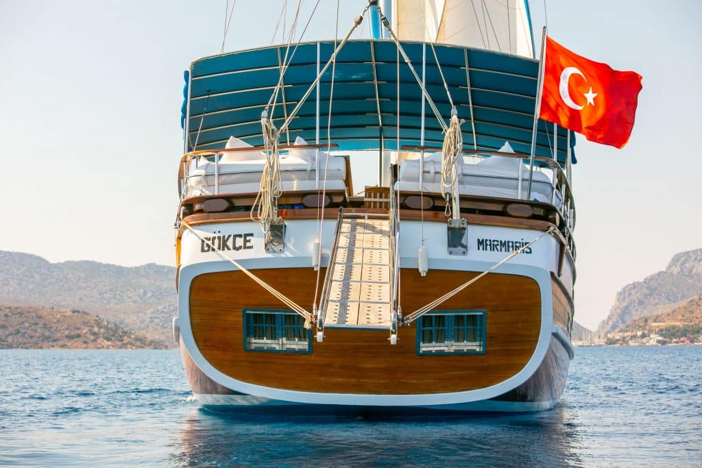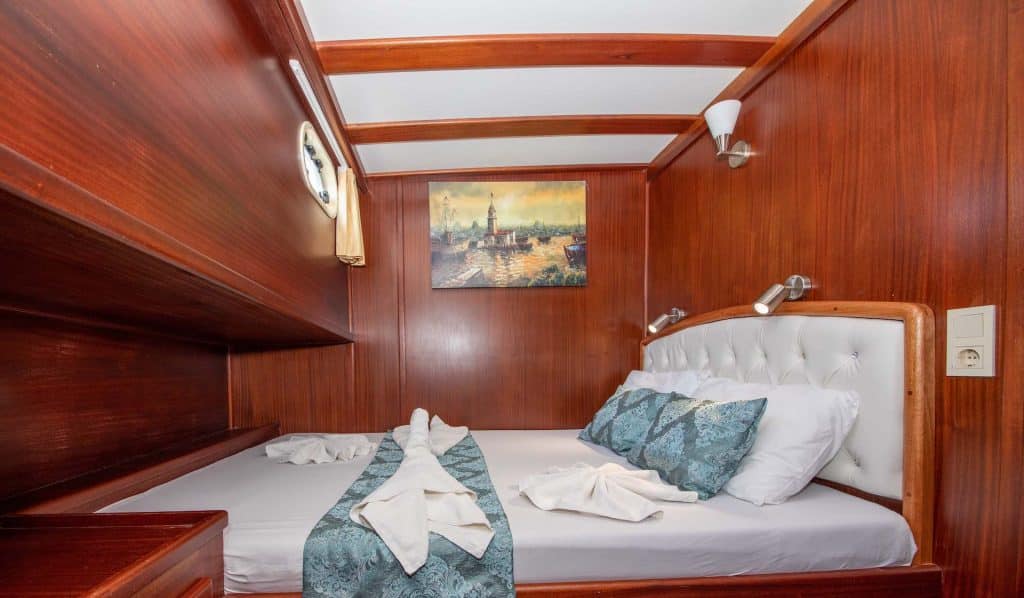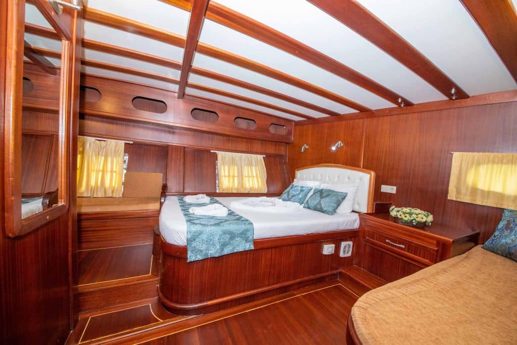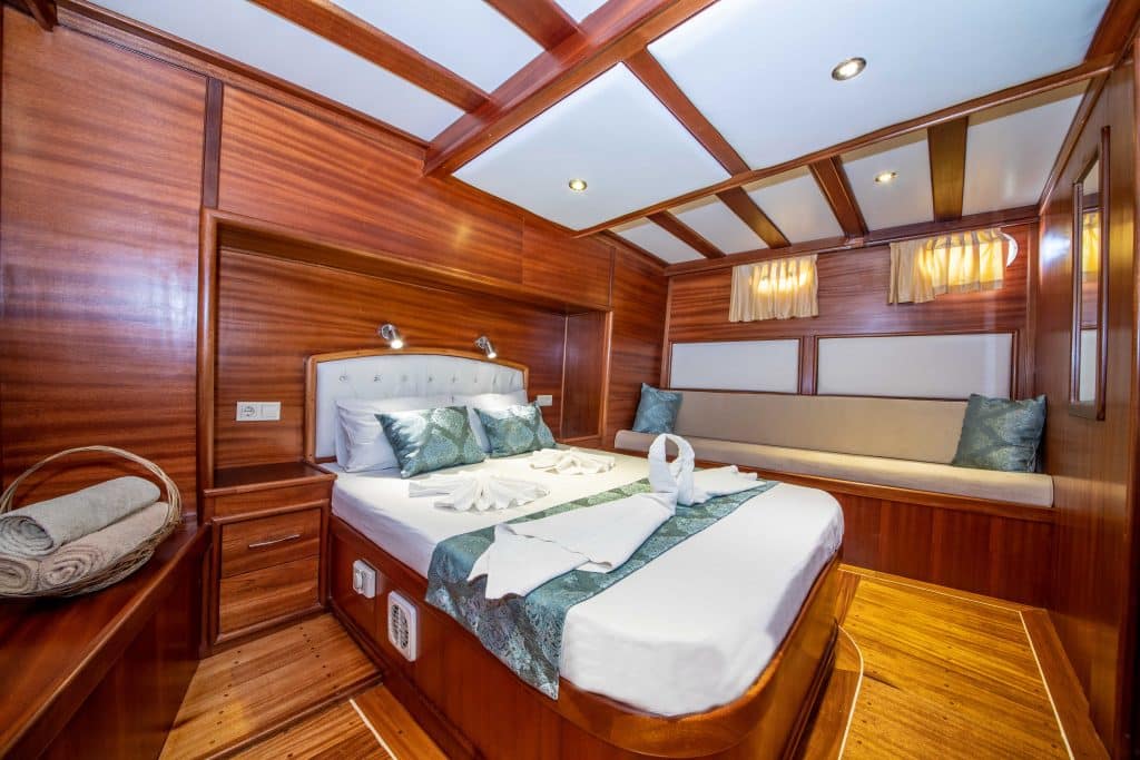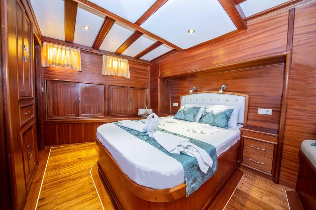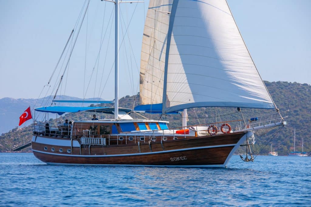 Unsere 24 m lange Gulet Gokce 1 wurde 1996 gebaut. Ihre endgültige Form erhielt sie mit der Renovierung und Sanierung im Jahr 2011. Unser Boot verfügt über 5 Kabinen, 1 Master- und 4 Doppelkabinen, jede stilvoller und komfortabler, mit eigener Dusche, WC und Klimaanlage. 3 Es gibt separate Wohnbereiche, eine voll ausgestattete Küche, Essbereiche im Innen- und Außenbereich sowie Ruhebereiche für die Besatzung. Es gibt ausreichend Sonnenkissen, Stühle und Serviersets für alle Gäste. Dank seiner vollwertigen Wireless-, GSM-Telefon- und Navigationsausrüstung bietet Gulet Gokce 1; Bodrum, Göcek, Marmaris, Fethiye usw. Sie können sicher zu unseren Zielen der Blauen Kreuzfahrt segeln.
