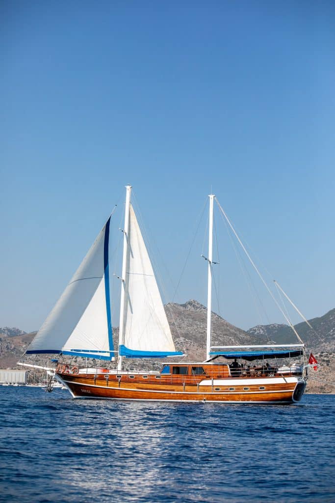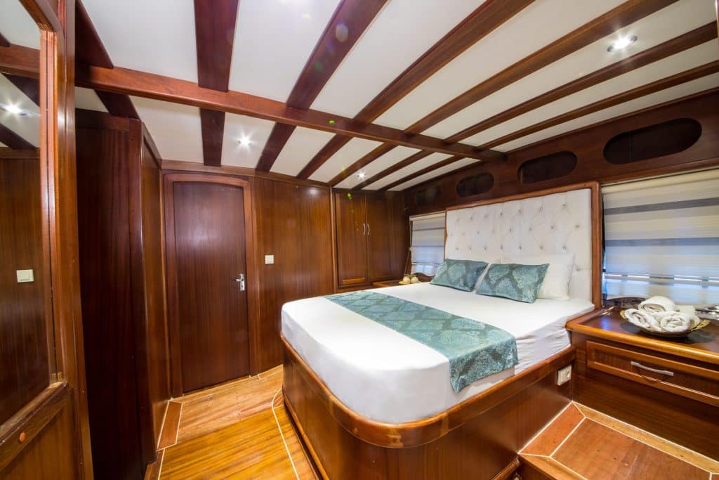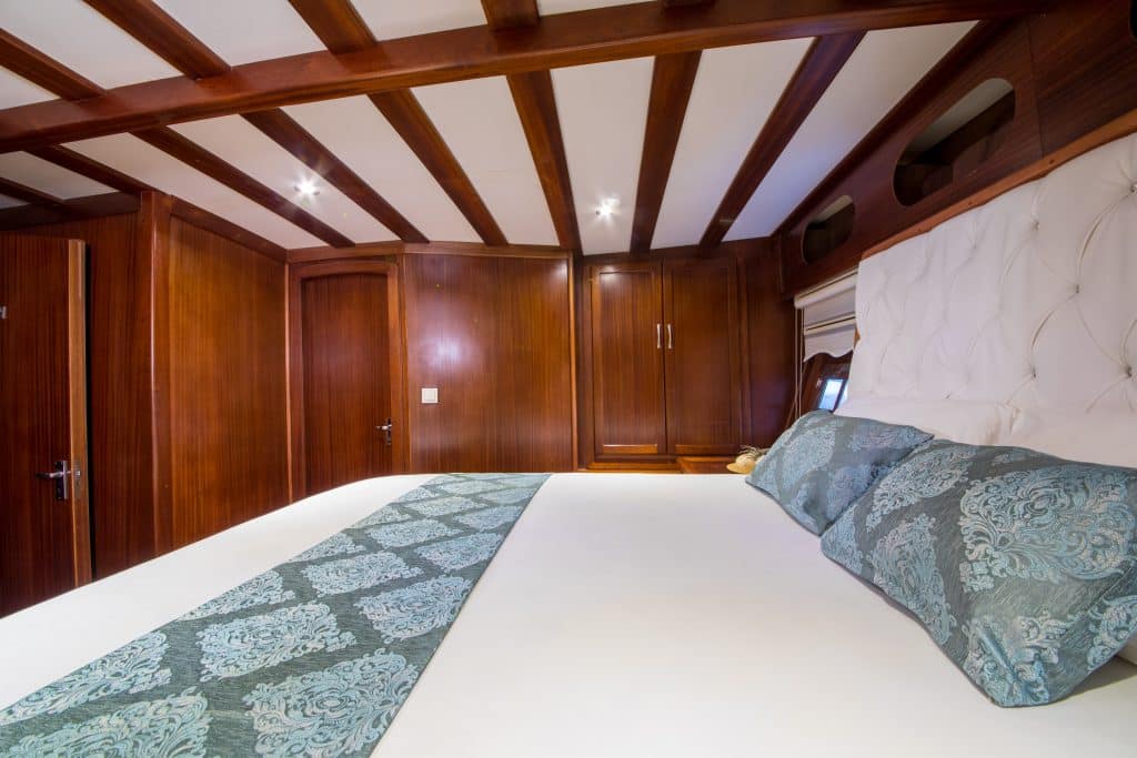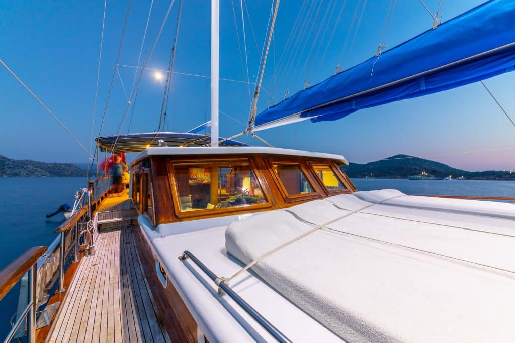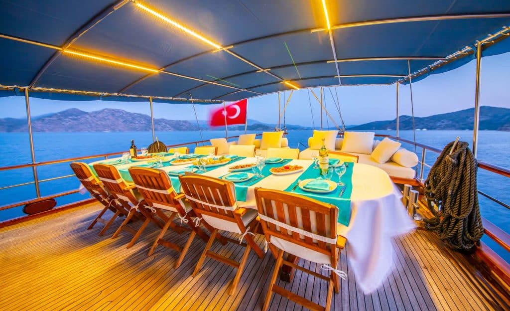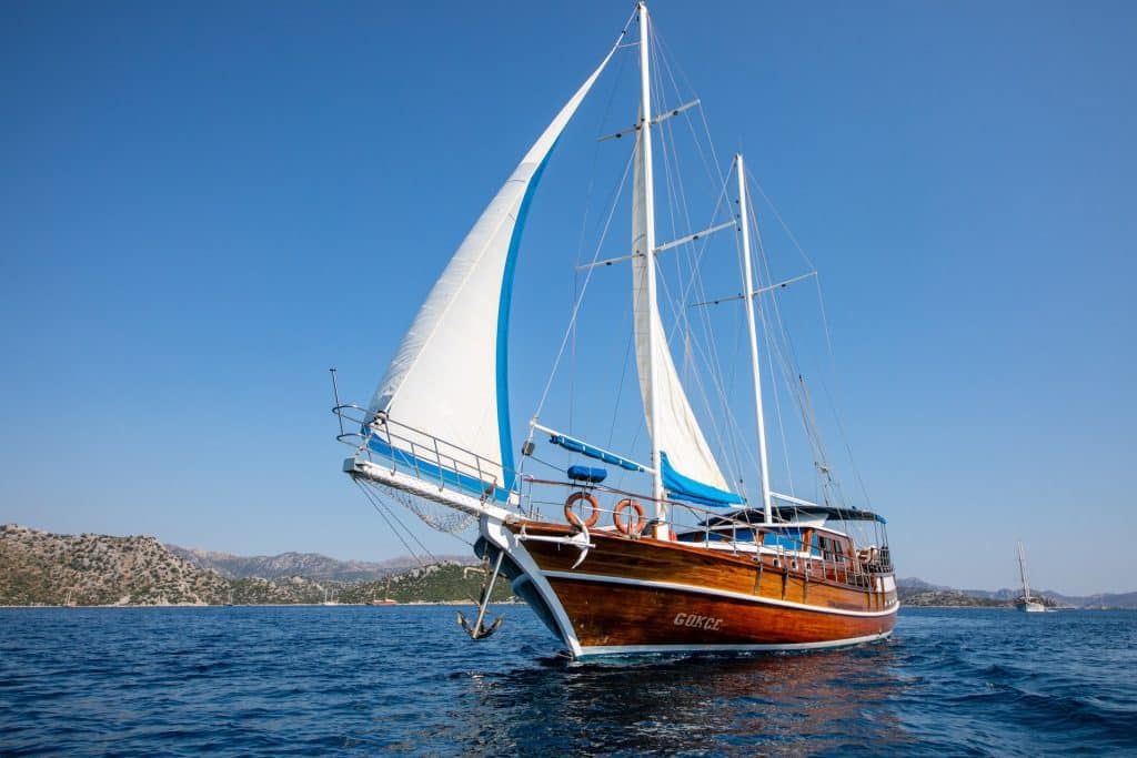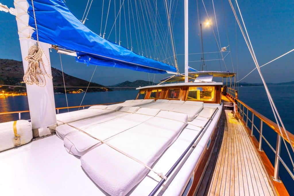 Unsere 24 m lange Gulet Gokce 1 wurde 1996 gebaut. Ihre endgültige Form erhielt sie mit der Renovierung und Sanierung im Jahr 2011. Unser Boot verfügt über 5 Kabinen, 1 Master- und 4 Doppelkabinen, jede stilvoller und komfortabler, mit eigener Dusche, WC und Klimaanlage. 3 Es gibt separate Wohnbereiche, eine voll ausgestattete Küche, Essbereiche im Innen- und Außenbereich sowie Ruhebereiche für die Besatzung. Es gibt ausreichend Sonnenkissen, Stühle und Serviersets für alle Gäste. Dank seiner vollwertigen Wireless-, GSM-Telefon- und Navigationsausrüstung bietet Gulet Gokce 1; Bodrum, Göcek, Marmaris, Fethiye usw. Sie können sicher zu unseren Zielen der Blauen Kreuzfahrt segeln.