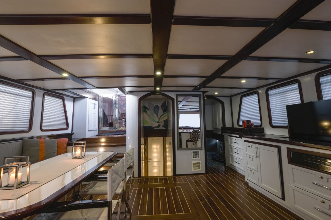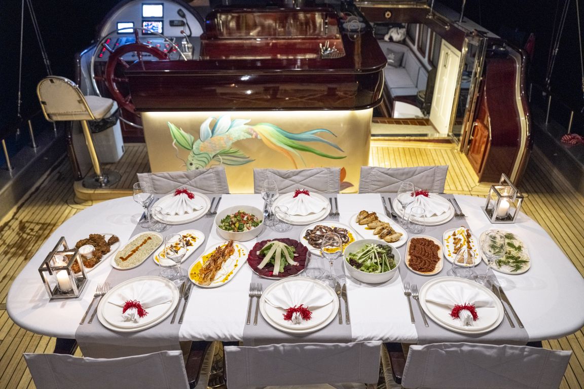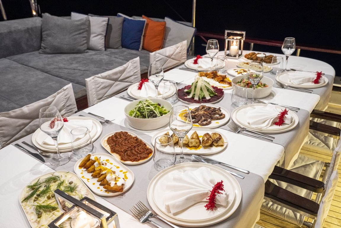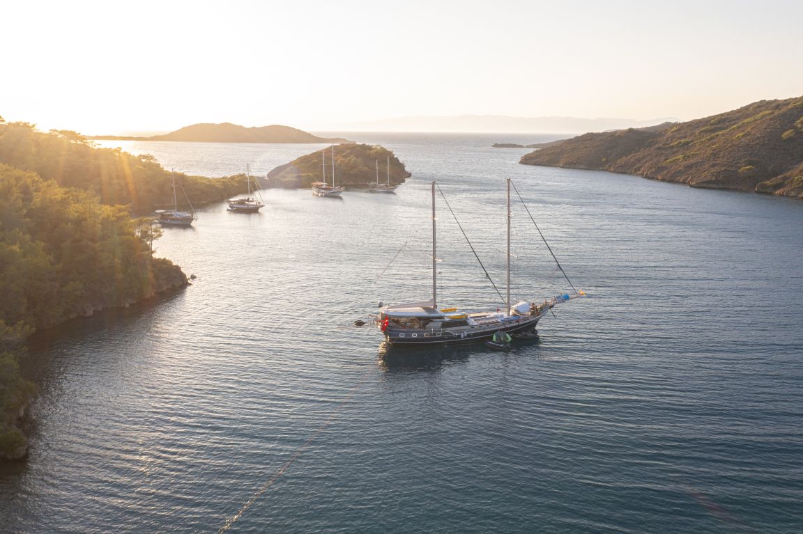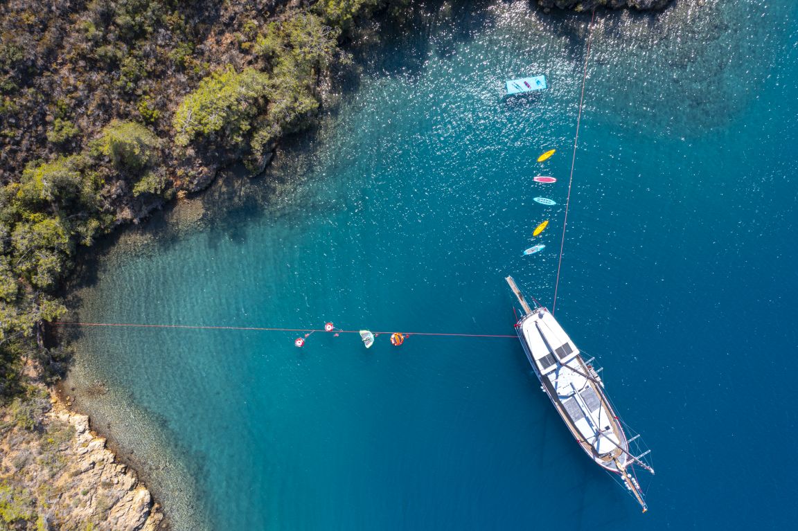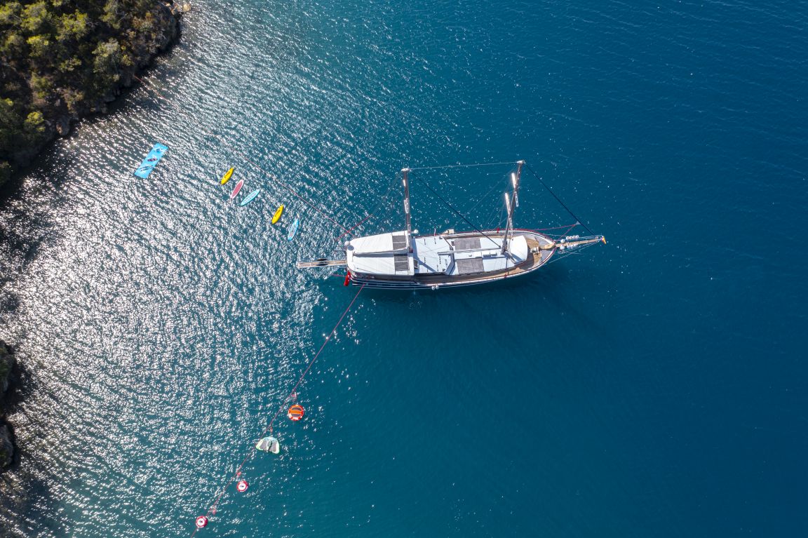 Die M/S Lotus wurde 1996 gebaut. Nach der Renovierung im Jahr 2021 präsentiert sie sich in ihrem heutigen, modernen Zustand. Das 26 Meter lange und 6 Meter breite Boot bietet unseren geschätzten Gästen mit einer 4-köpfigen Crew exklusive Blaue-Kreuzfahrten. Unsere Yacht verfügt über insgesamt 5 Kabinen, bestehend aus 2 Master-Kabinen und 3 Doppelkabinen, die alle stilvoll und komfortabel eingerichtet sind und jeweils über eine eigene Dusche, WC und Klimaanlage verfügen. Sie ist mit 2 x 450 PS starken MAN-Motoren und 2 x 24 kW Kohler-Generatoren ausgestattet. Separate Wohnbereiche für die Crew, eine voll ausgestattete Küche, Essbereiche im Innen- und Außenbereich, eine 24-Stunden-Klimaanlage, Entspannungsbereiche und eine amerikanische Bar stehen zur Verfügung. Ausreichend Sonnenliegen, Stühle und Service-Sets sind für alle Gäste vorhanden. Diese Yacht, die unseren Gästen auf Blauen Kreuzfahrten Komfort, Luxus und Ruhe bietet, erreicht eine Geschwindigkeit von bis zu 10 Seemeilen. Dank der voll ausgestatteten drahtlosen Telefonanlage mit GSM-Telefon und Navigationssystemen werden Sie sich an Bord der Lotus Yacht in den beliebtesten Blauen-Reisezielen wie Bodrum, Marmaris, Fethiye und Göcek sicher fühlen. Zusätzlich stehen Ihnen im Salon ein LCD-Fernseher, ein DVD-Player und eine Musikanlage zur Verfügung. Damit Sie auch während Ihres Urlaubs nicht vom Internet abgeschnitten sind, ist unsere Yacht mit WLAN ausgestattet, das innerhalb türkischer Hoheitsgewässer gültig ist. Wassersportarten wie Wakeboarden, Wasserski, Kanufahren und Hobie Mirage sind optional verfügbar. Für unsere Gäste, die die Blaue Reise in den unberührten Buchten der Türkei genießen möchten, bietet unsere Seematratze zusätzliche Unterhaltungsmöglichkeiten.