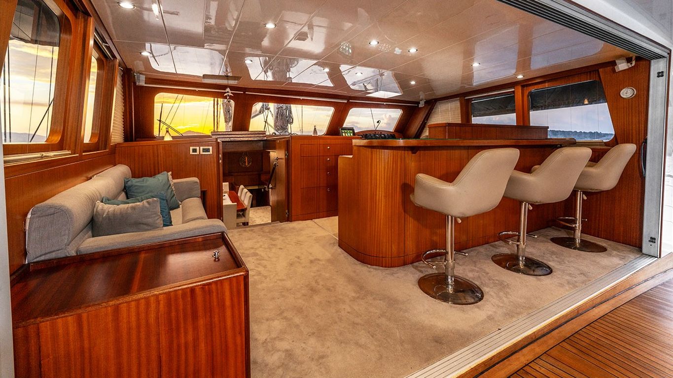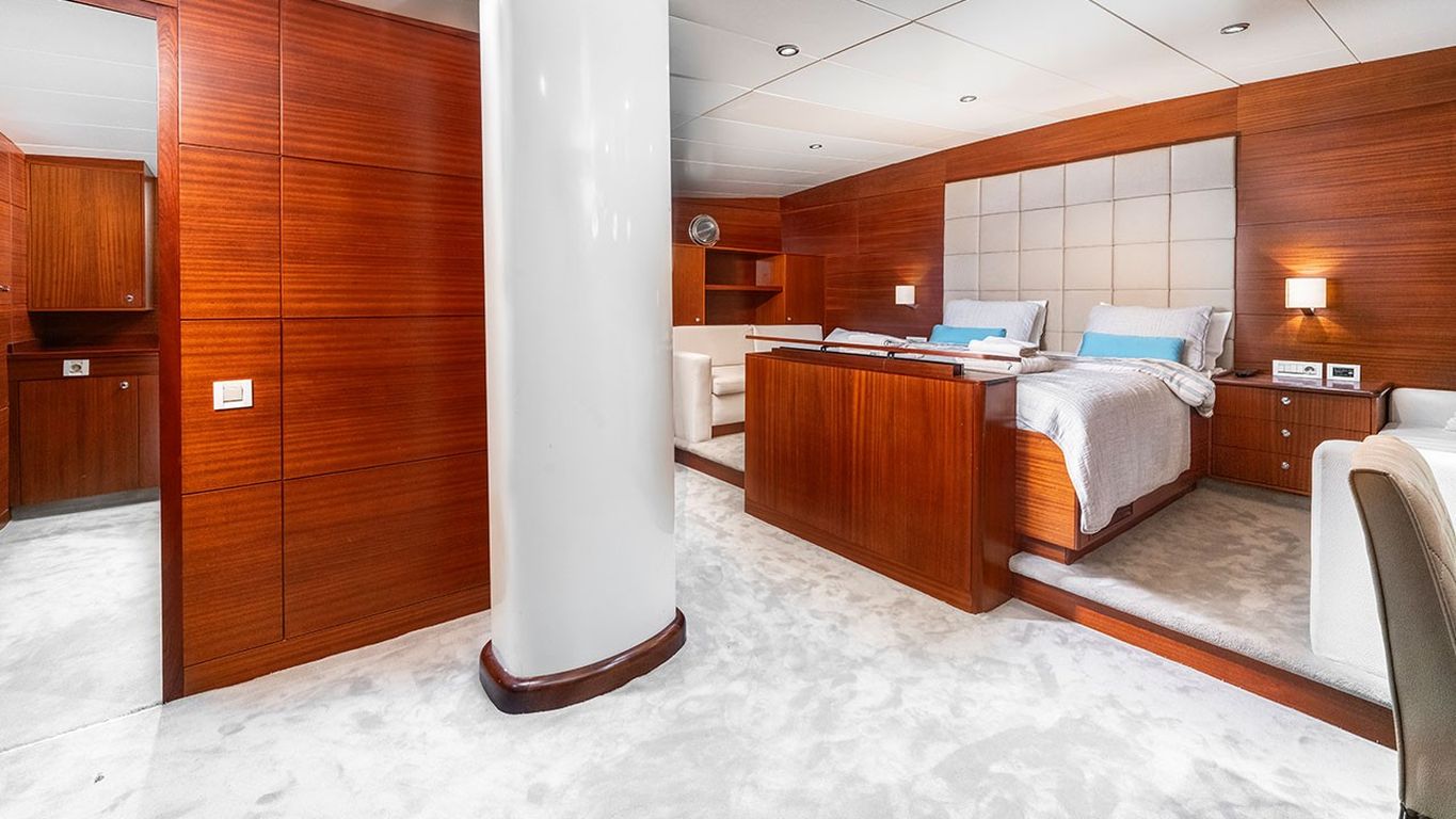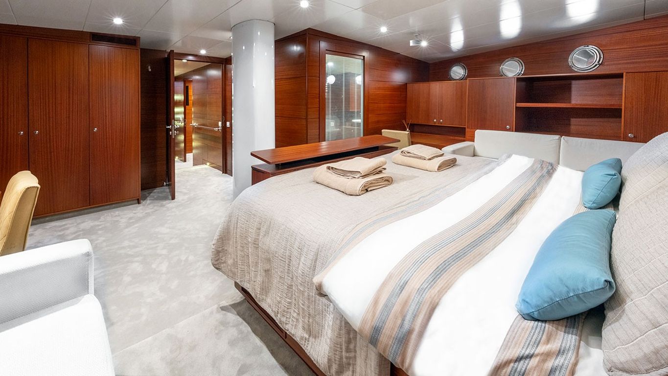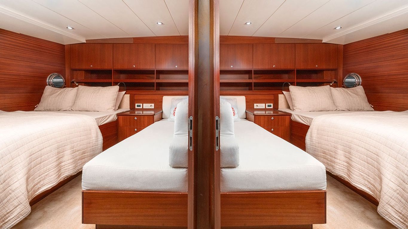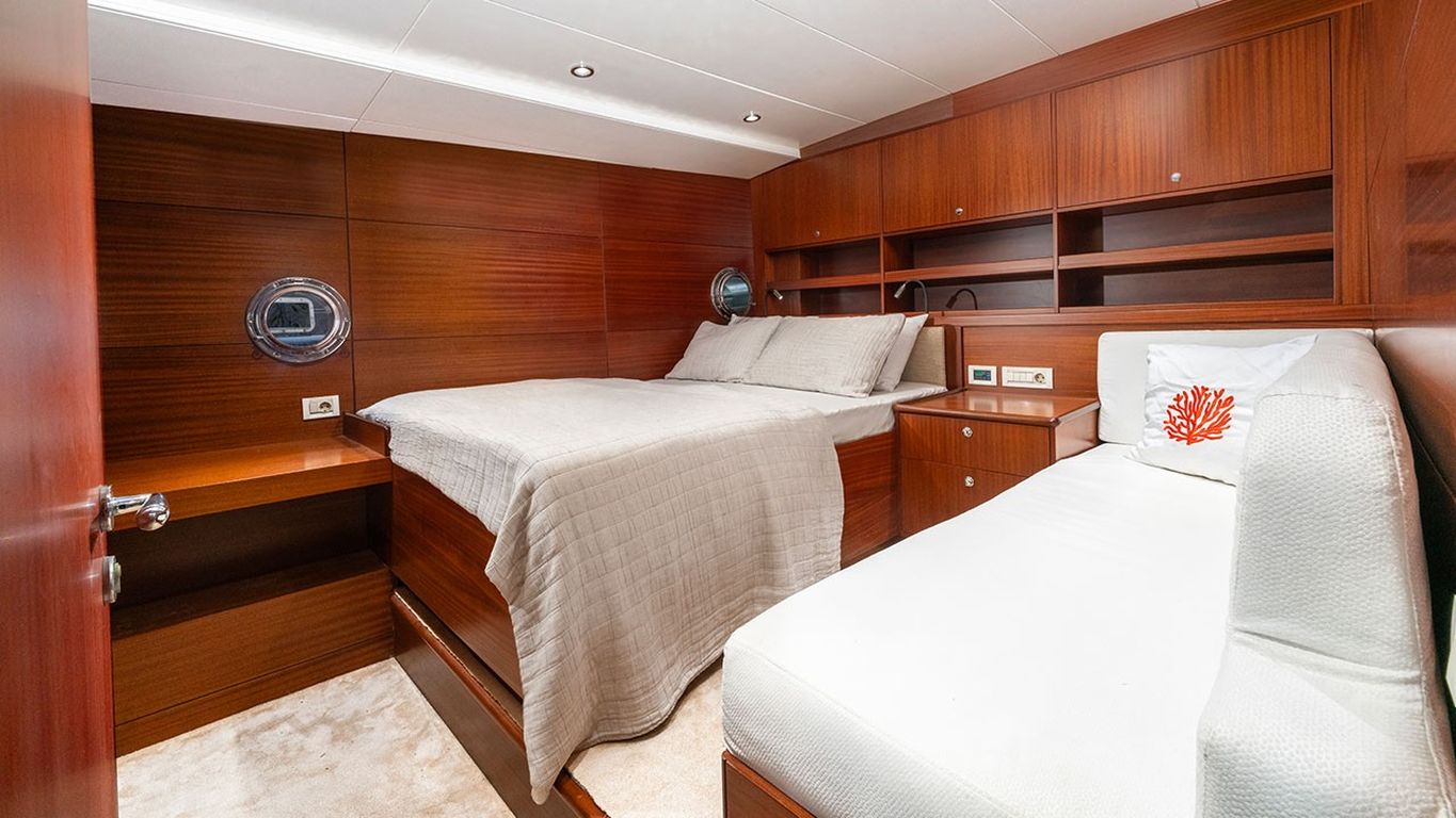 | Kapazität für bis zu 10 Gäste; 2 VIP, 1 Master, 2 Doppelkabinen, Duschkabine und Toiletten in allen Kabinen, separate Mannschaftskabinen. |