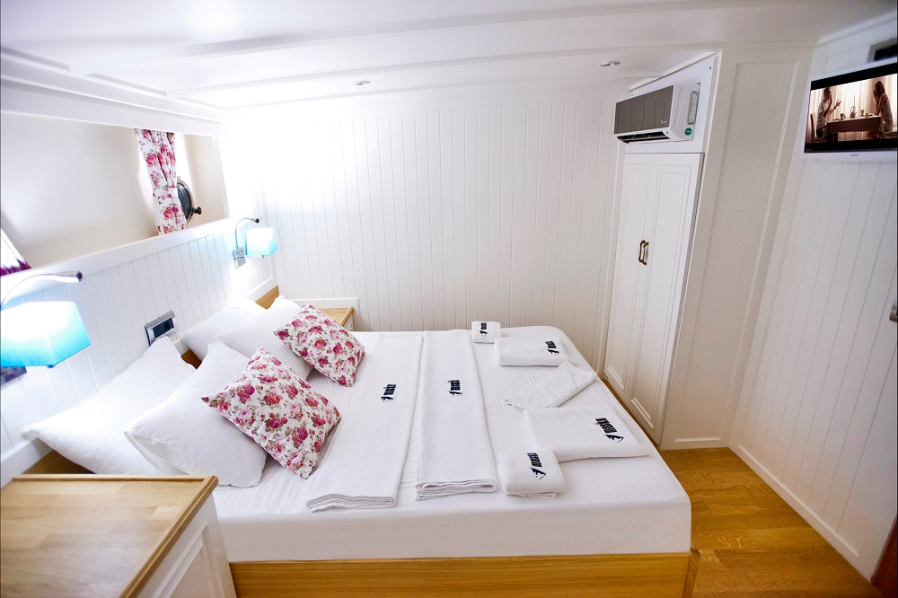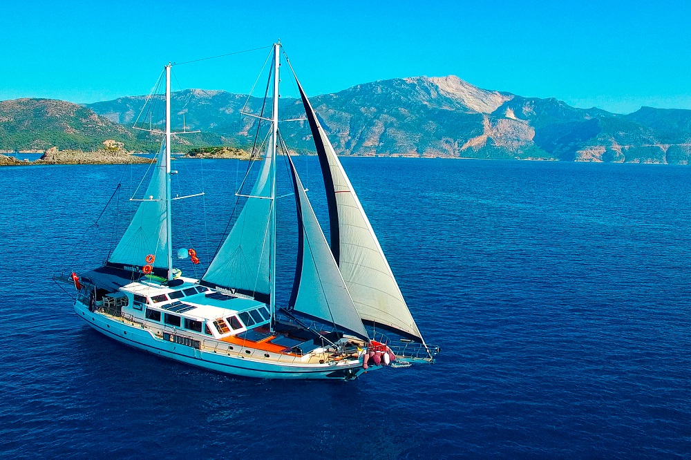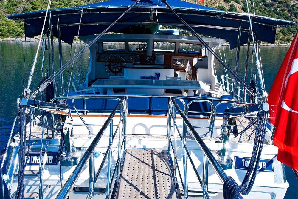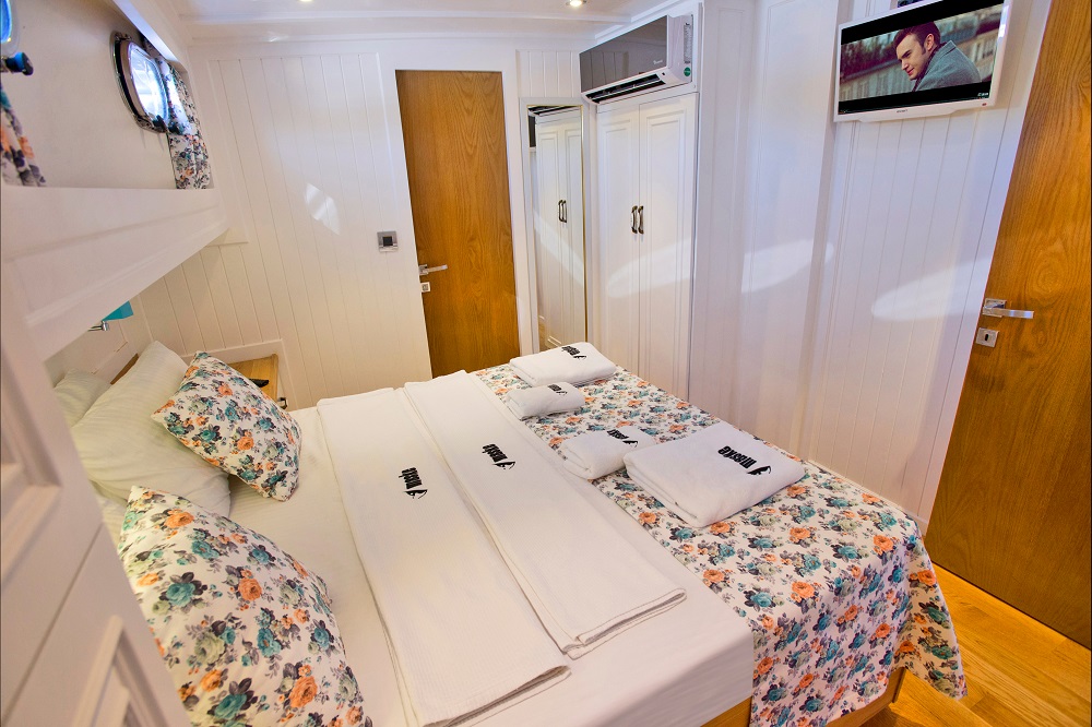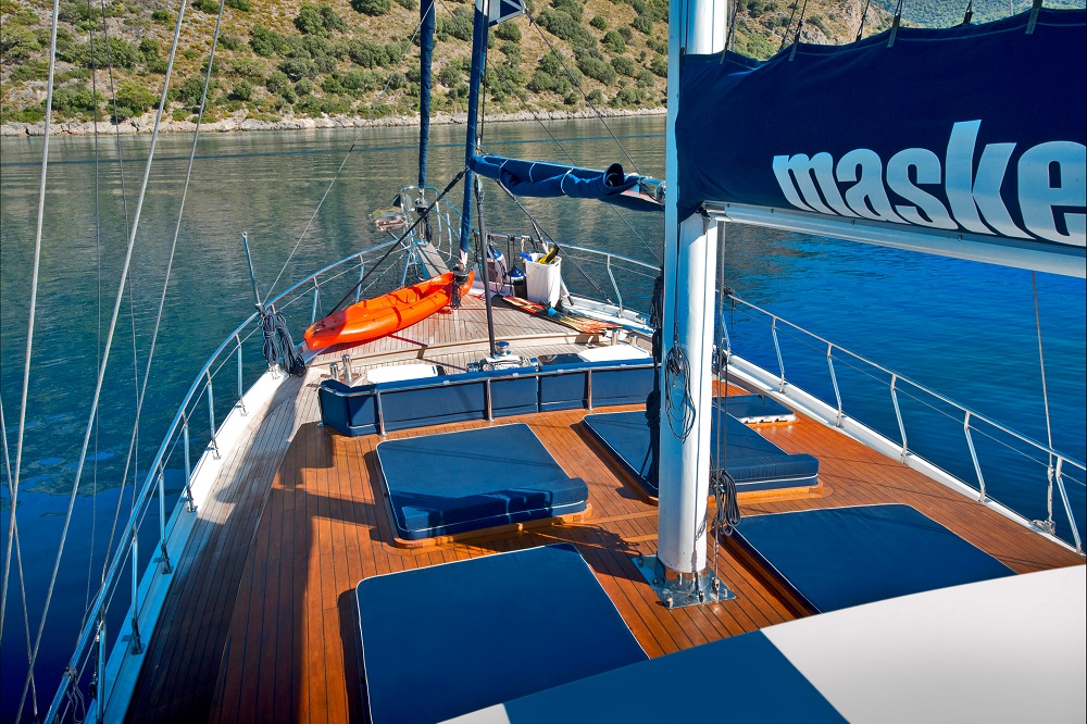 Unsere 24 m lange Gulet Maske 1 wurde 2014 gebaut. Ihre endgültige Form erhielt sie mit der Renovierung und Sanierung, die sie 2017 durchlief. Unser Boot verfügt über 5 Kabinen, 1 Master- und 4 Doppelkabinen, jede stilvoller und komfortabler, mit eigener Dusche, WC und Klimaanlage. 3 Es gibt separate Wohnbereiche, eine voll ausgestattete Küche, Essbereiche im Innen- und Außenbereich sowie Ruhebereiche für die Besatzung. Es gibt Sonnenkissen, Stühle und Serviersets in ausreichender Menge für alle Gäste. Dank seiner vollwertigen Radio-, GSM-Telefon- und Navigationsausrüstung ist die Gulet Maske 1; Bodrum, Göcek, Marmaris, Fethiye usw. Sie können sicher zu unseren Zielen der Blauen Kreuzfahrt segeln.