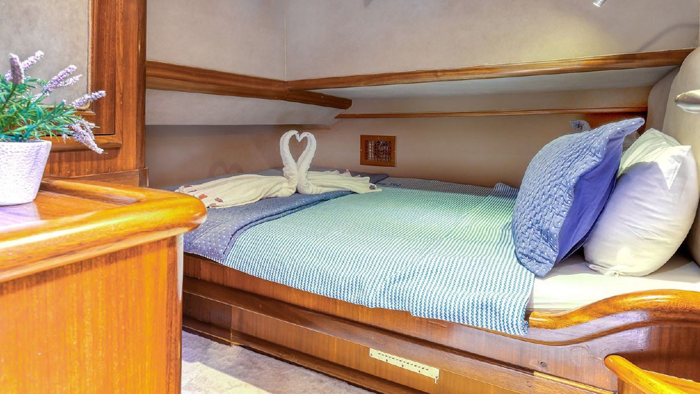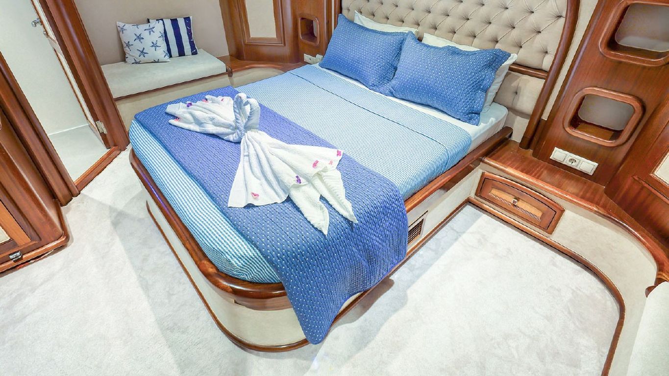 | Kapazität für bis zu 10 Gäste; 2 Masterkabinen, 3 Doppelkabinen, Duschkabine und Toiletten in allen Kabinen, separate Mannschaftskabinen. |