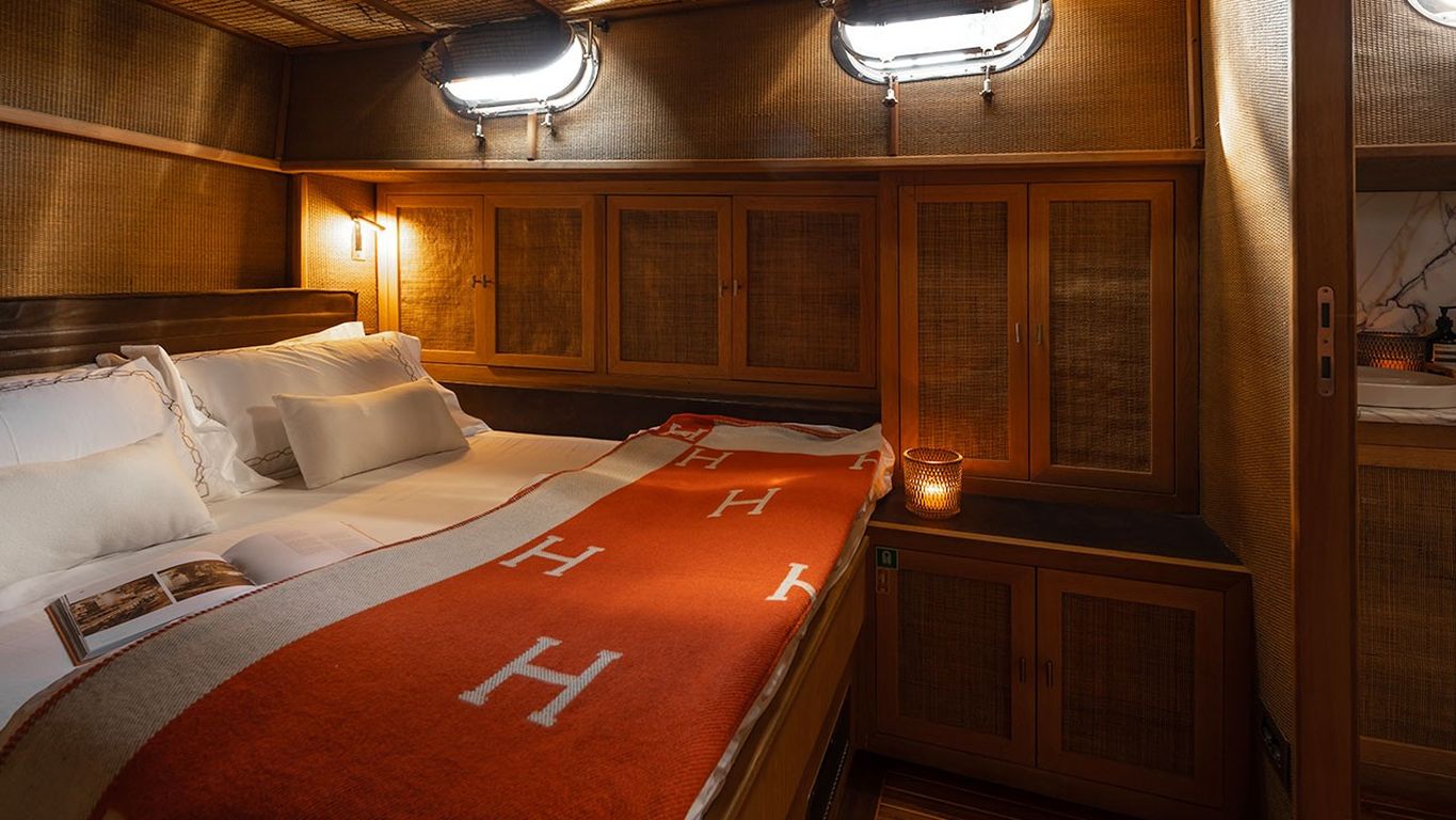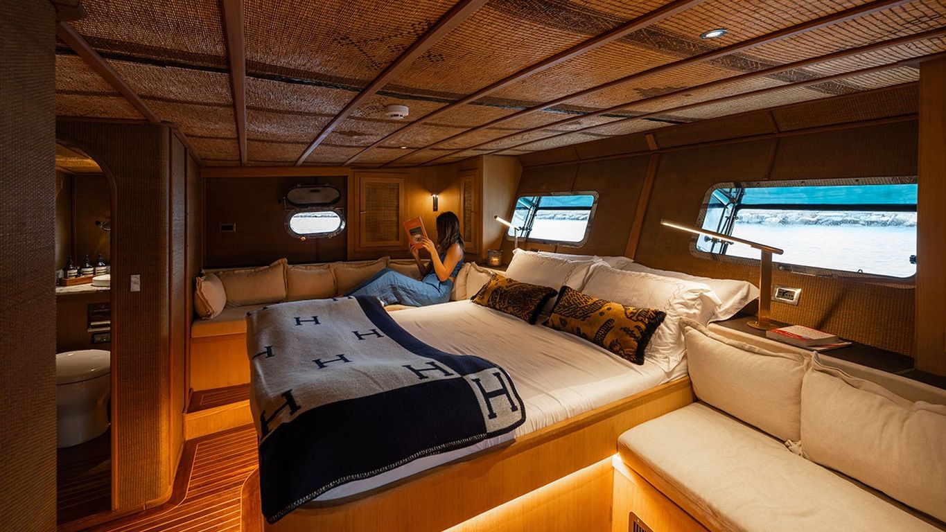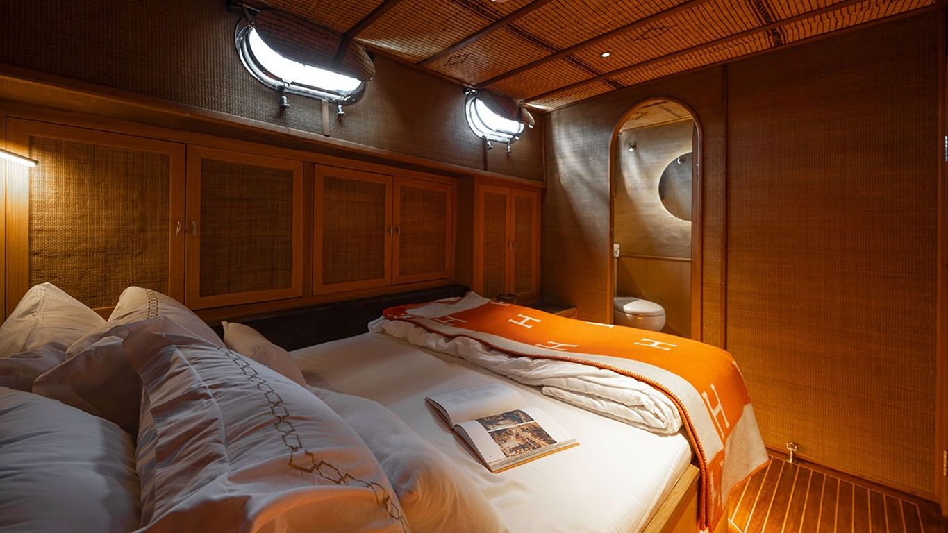 | Kapazität für bis zu 10 Gäste; 1 Masterkabine, 4 Doppelkabinen, Duschkabine und Toiletten in allen Kabinen, separate Mannschaftskabinen. |
