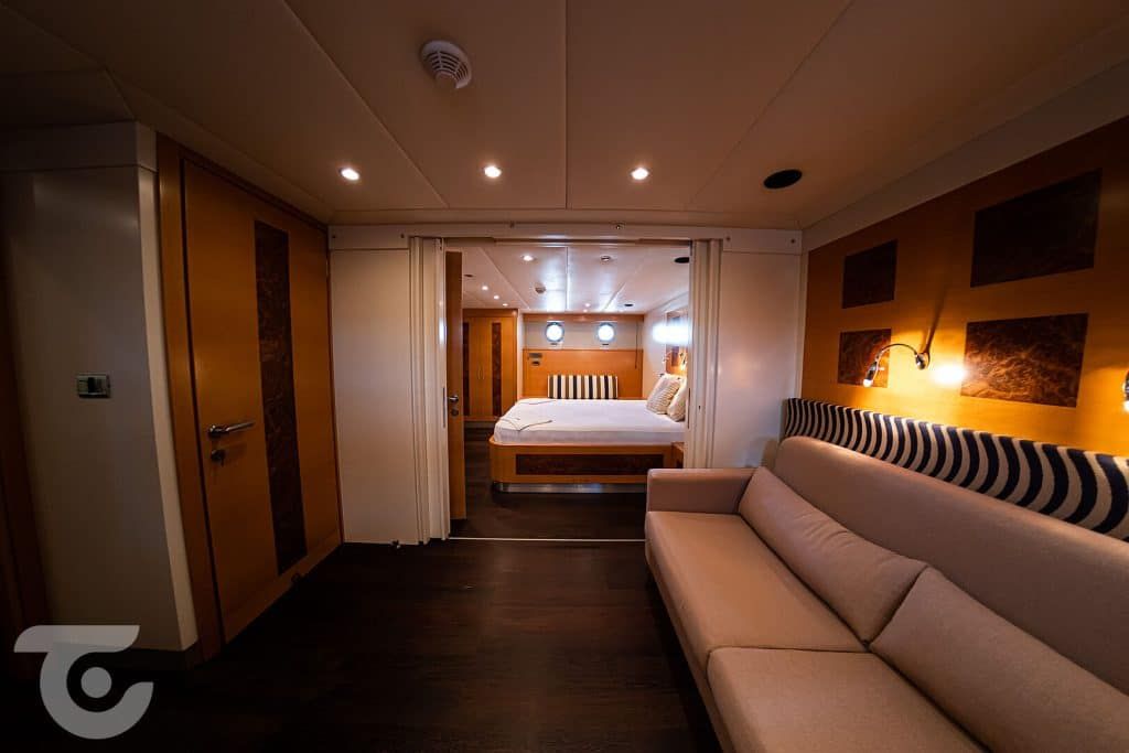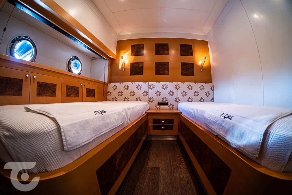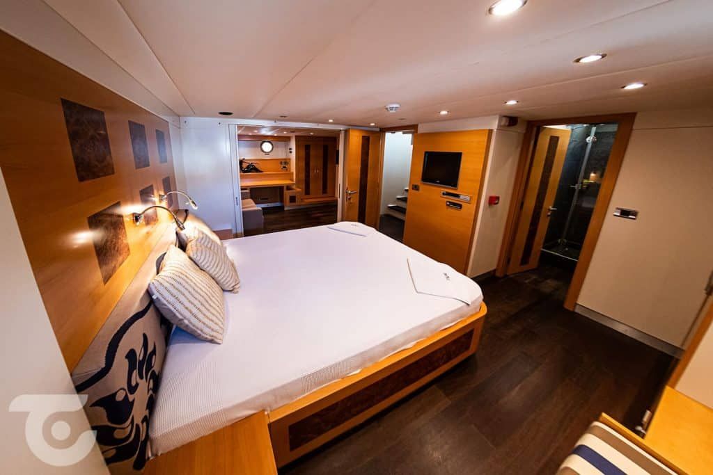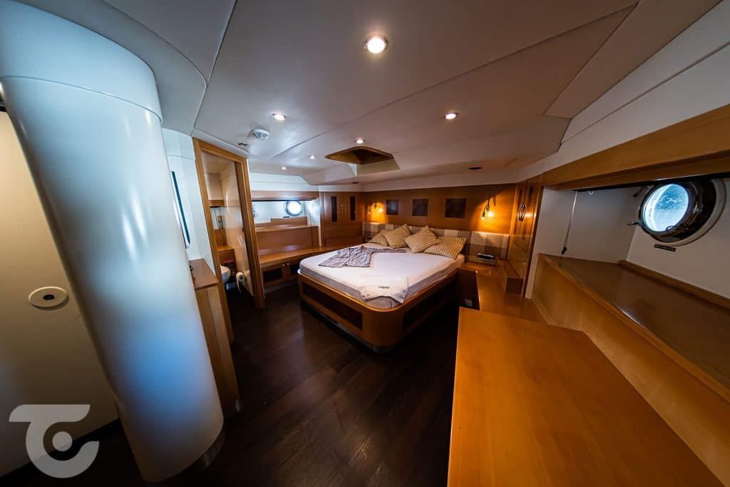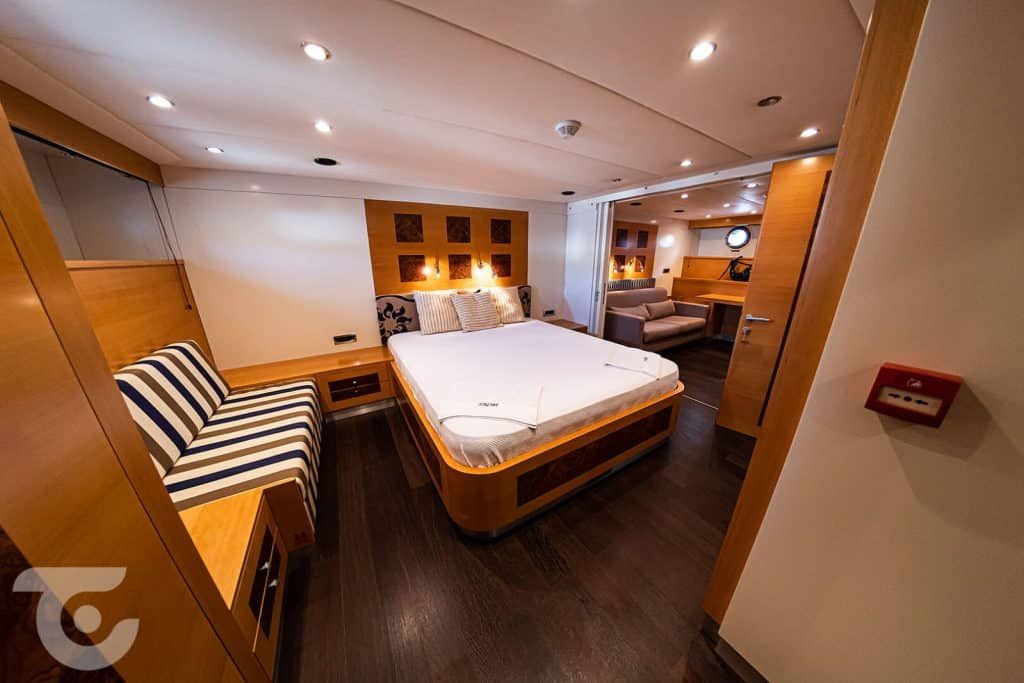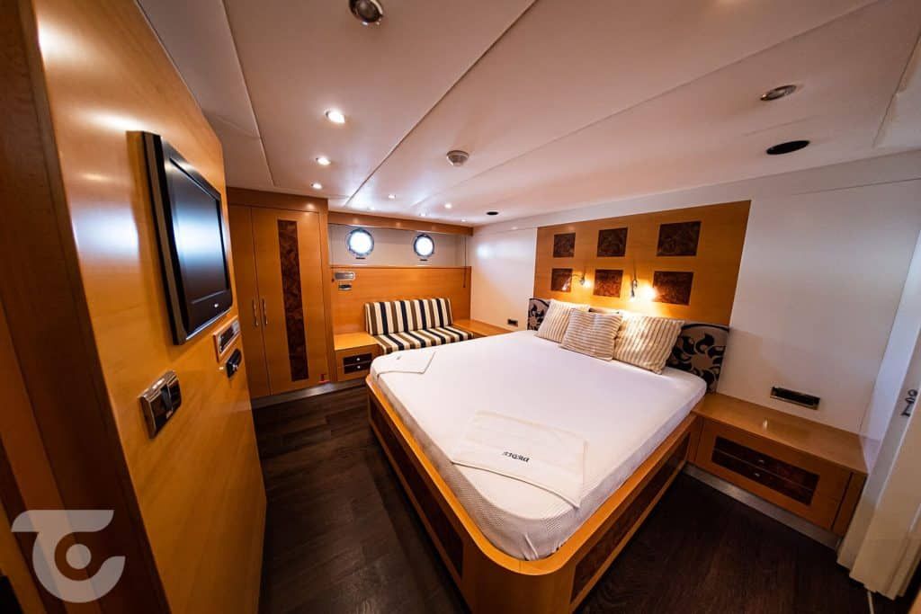 Bis zu 10 Gäste; 1 VIP-, 1 Master-, 1 Doppel-, 2 Zweibettkabinen, Klimaanlage, Kleiderschrank, Duschkabine und Toiletten im Haushaltsstil in allen Kabinen, separate Mannschaftskabinen. |