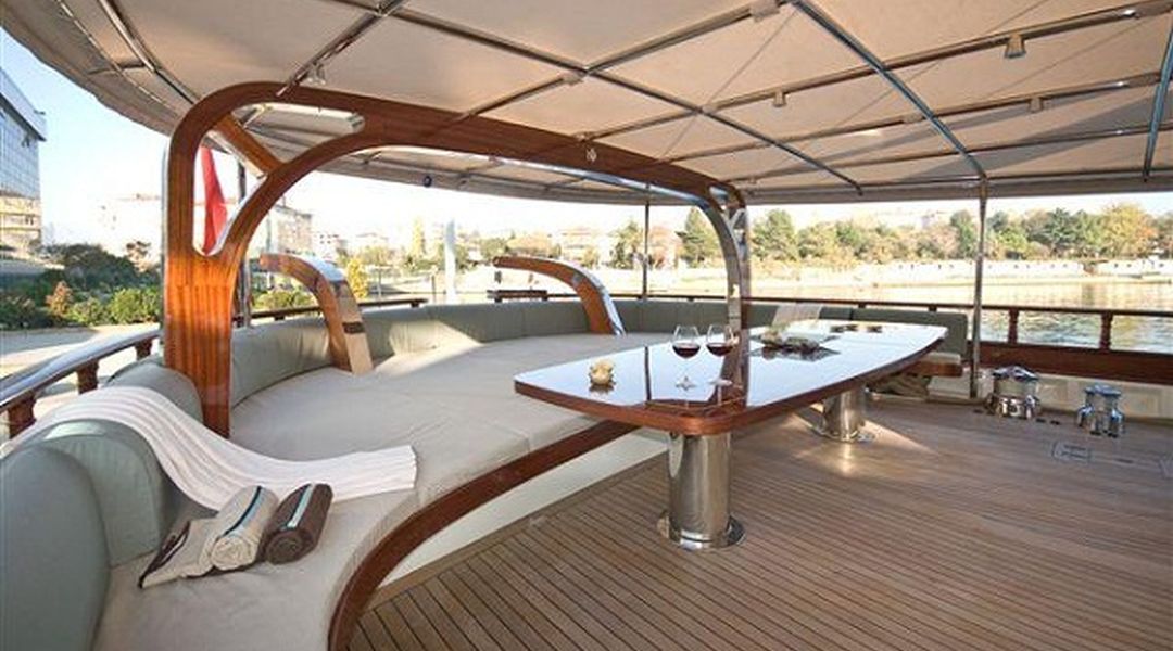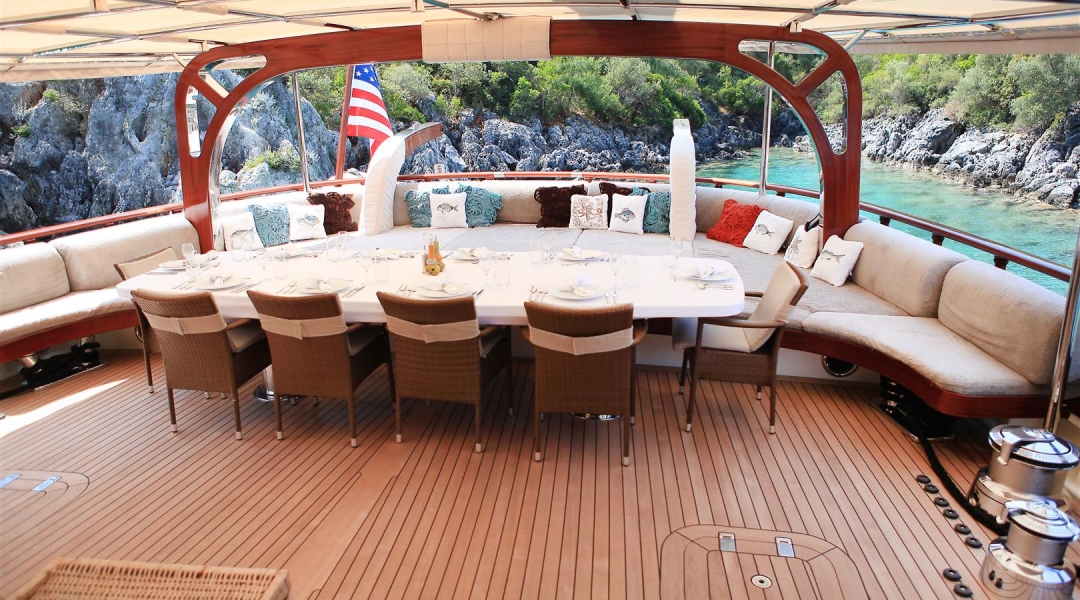 Unsere 40 m lange Gulet Zelda wurde 2010 gebaut. Ihre endgültige Form erhielt sie mit der Renovierung und Sanierung, die sie 2020 durchlief. Unser Boot verfügt über 5 Doppelkabinen, jede stilvoller und komfortabler als die andere, mit eigener Dusche, WC und Klimaanlage. 4 Es gibt separate Wohnbereiche, eine voll ausgestattete Küche, Essbereiche im Innen- und Außenbereich sowie Ruhebereiche für die Besatzung. Es gibt ausreichend Sonnenkissen, Stühle und Serviersets für alle Gäste. Gulet Zelda verfügt dank seiner vollwertigen Radio-, GSM-Telefon-Navigationsausrüstung; Bodrum, Göcek, Marmaris, Fethiye usw. Sie können sicher zu unseren Zielen der Blauen Kreuzfahrt segeln.