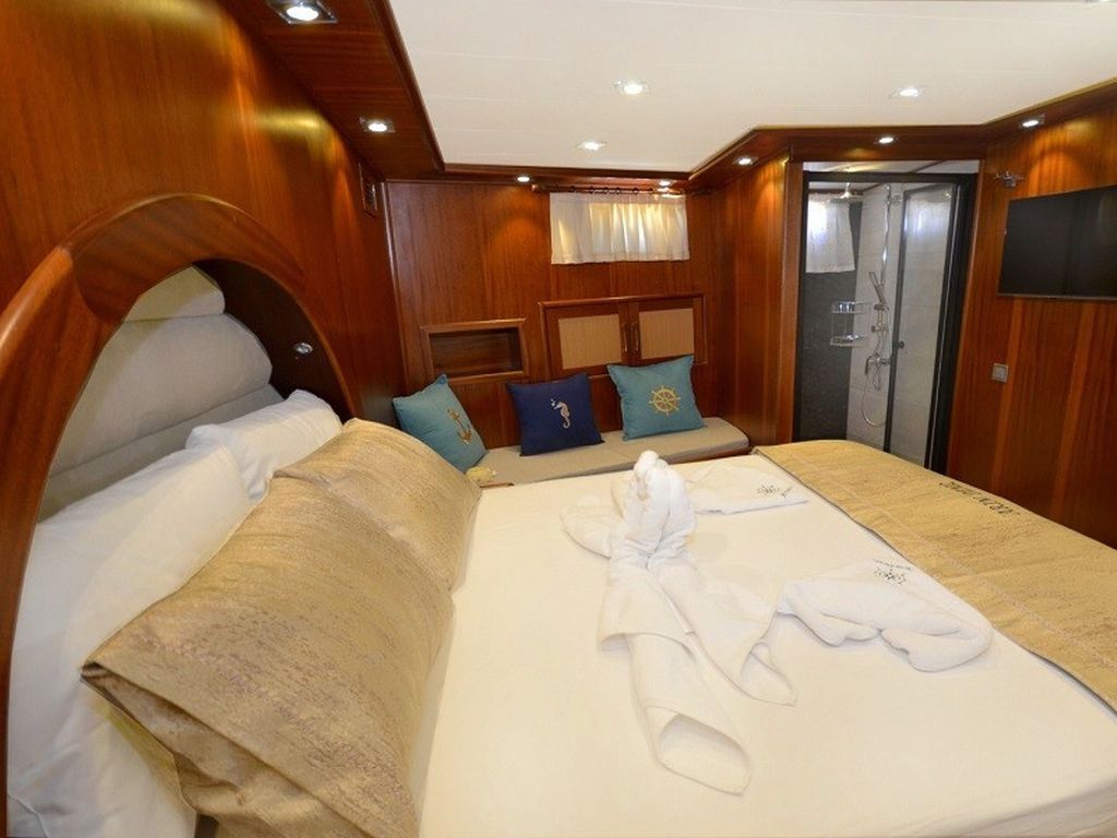 | Die moderne Gulet Arin Deniz ist 26 Meter lang und wurde 2022 gebaut. Sie bietet sechs Kabinen – zwei Master-, zwei Doppel- und zwei Zweibettkabinen – mit Platz für bis zu zwölf Gäste. Jede Kabine ist mit einem privaten Badezimmer ausgestattet und elegant möbliert. Mit einer Breite von 7,30 Metern bietet sie weitläufige Decks mit Sonnenbereichen, schattigen Essplätzen und komfortablen Lounges. Der Salon ist modern gestaltet und verfügt über eine Bar, einen Essbereich und Unterhaltungseinrichtungen. Für Wassersport bietet Arin Deniz ein 40 PS Beiboot, Kanus, Paddleboards und Angelausrüstung. Darüber hinaus stehen Brettspiele und Freizeitaktivitäten zur Verfügung. Angetrieben wird sie von einem 460 PS Motor und einem 28 kVA Generator, mit einer Reisegeschwindigkeit von 11 Knoten. Klimaanlage: bis zu 3 Stunden täglich. Die Arin Deniz ist die perfekte Wahl für Gäste, die modernes Design, Komfort und Entspannung auf einer Blauen Reise kombinieren möchten. |