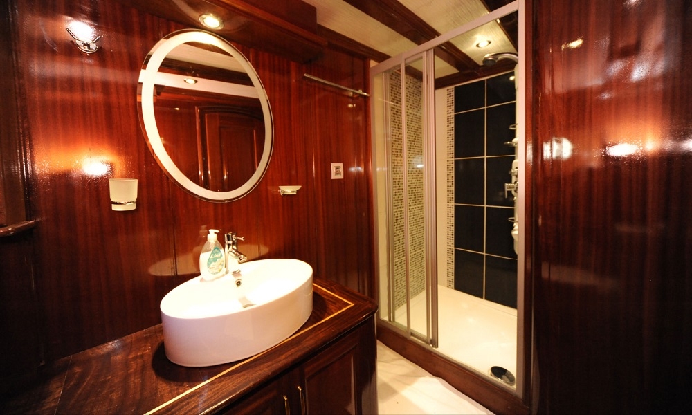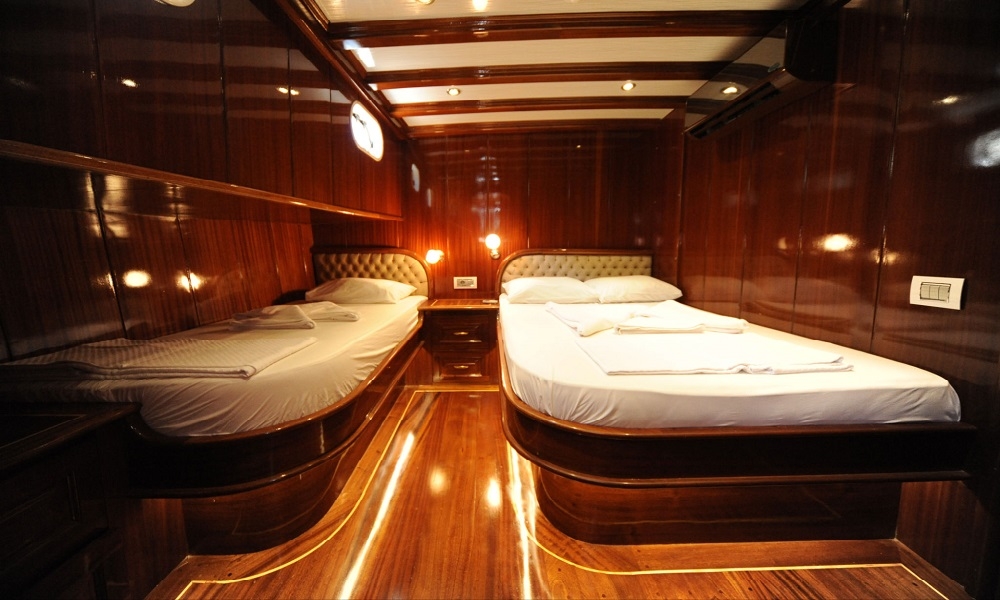 | Bis zu 12 Gästekapazität; 2 Master, 2 Doppel, 2 Zweibettkabinen, Klimaanlage, Duschkabine und Haushaltstoiletten in allen Kabinen, separate Mannschaftskabinen. |