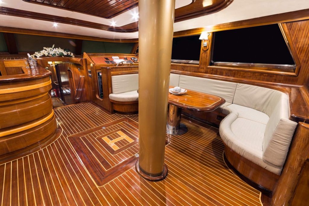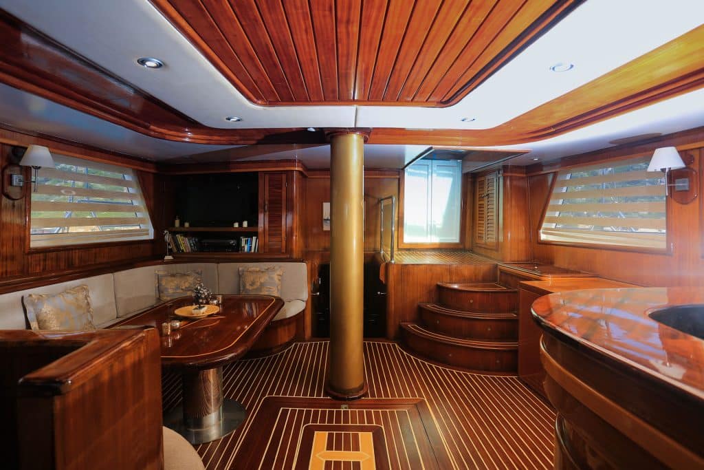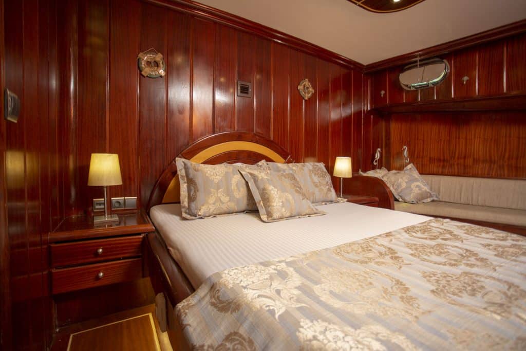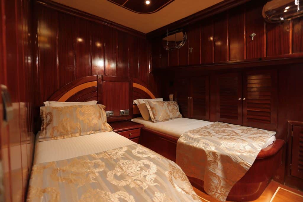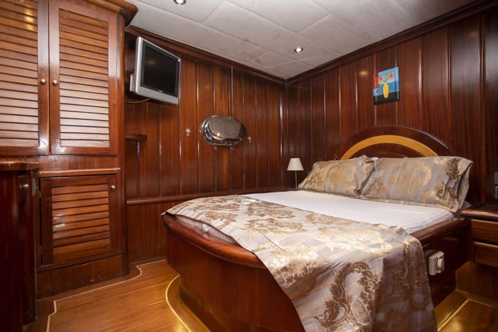 Bis zu 12 Gäste; 2 Masterkabinen, 2 Doppel- und 2 Zweibettkabinen. Minibar in jeder Kabine. 12 Stunden Klimaanlage pro Tag, Kabinenreinigung auf Anfrage; Badezimmer und Toilette werden regelmäßig gereinigt, Kleiderschrank, Duschkabine und Toiletten im Haushaltsstil in allen Kabinen, separate Mannschaftskabinen. |