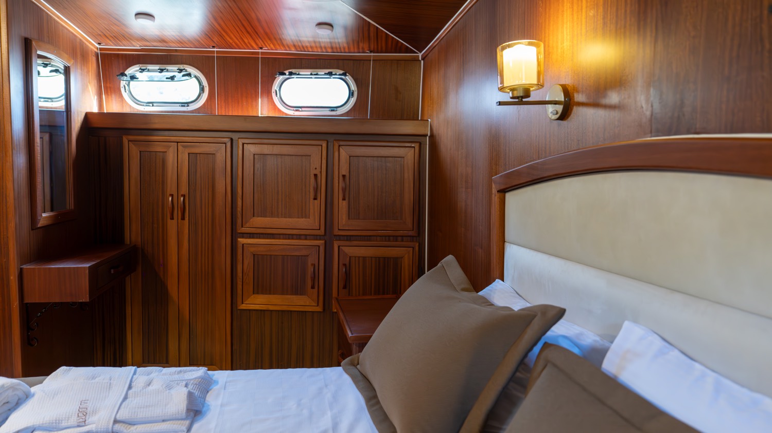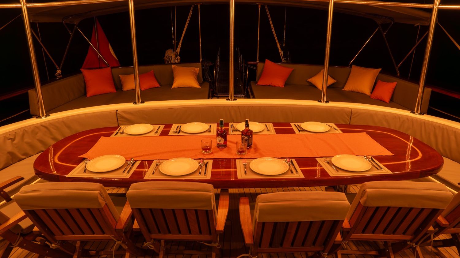 Bis zu 12 Gäste; 2 Haupt-, 3 Doppel-, 1 Dreibettkabinen, Klimaanlage, Kleiderschrank, Duschkabine und Toiletten für zu Hause in allen Kabinen, separate Crew-Kabinen.. |