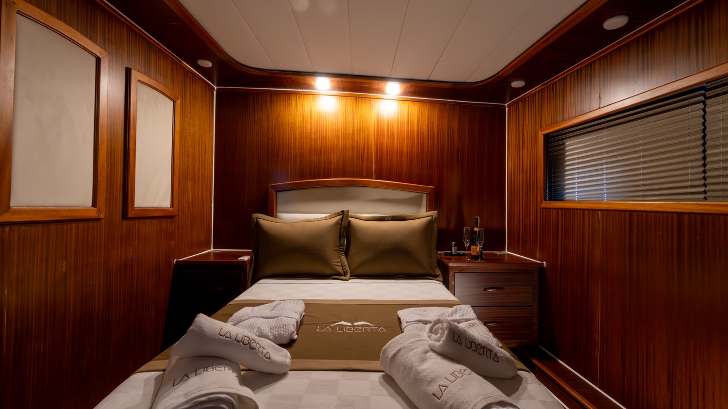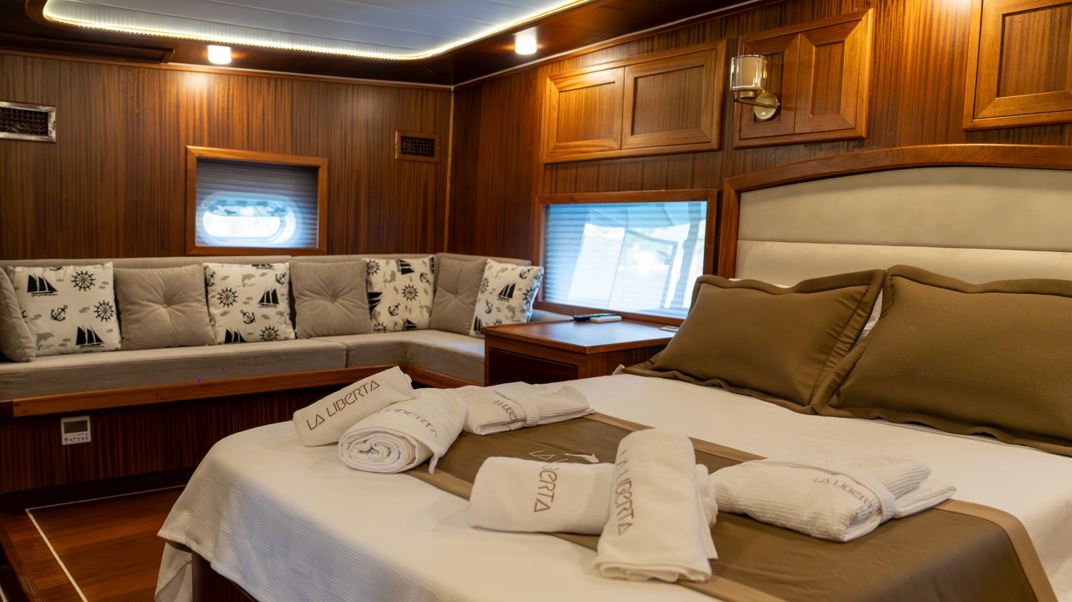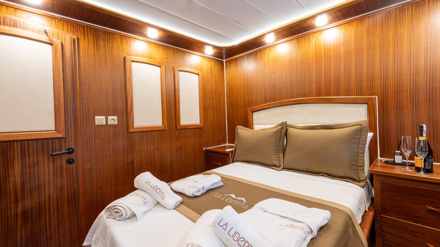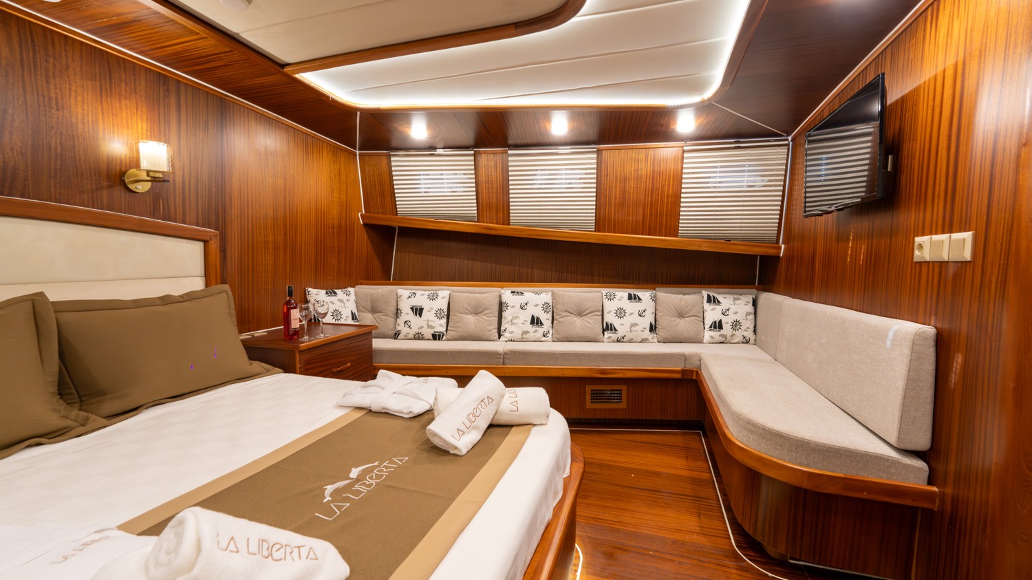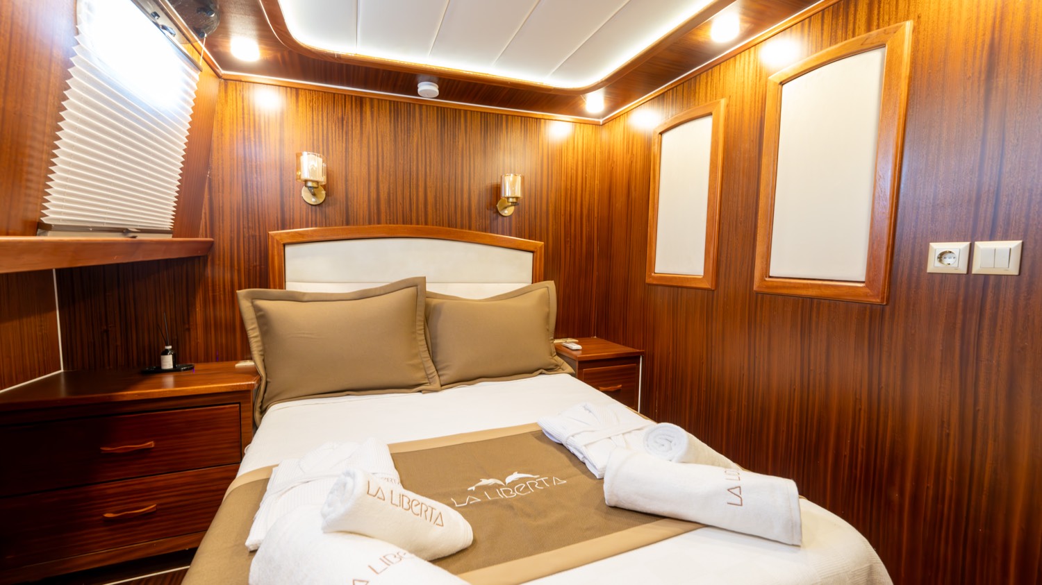| Die Gulet La Liberta ist eine 24 Meter lange Yacht, die 2023 gebaut wurde. Sie verfügt über sechs Kabinen – zwei Master-, drei Doppel- und eine Dreibettkabine – und bietet Platz für bis zu zwölf Gäste. Alle Kabinen verfügen über eigene Badezimmer, Klimaanlage und moderne Ausstattung. Das Deck bietet großzügige Lounge- und Essbereiche, gepolsterte Sitze und Sonnenzonen. Der Salon ist modern gestaltet und mit Ess- und Unterhaltungsmöglichkeiten ausgestattet. Zur Wassersportausstattung gehören Kanus, Paddleboards, Seabobs und Jobe-Revolve-Schleppgeräte sowie Schnorchel- und Angelausrüstung. Angetrieben von zwei 350 PS Motoren und 31,5 + 19,5 kVA Generatoren, erreicht sie 8 Knoten. Klimaanlage: 12 Stunden täglich. Die La Liberta ist die perfekte Wahl für Gäste, die eine moderne Gulet mit erstklassiger Ausstattung suchen |